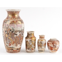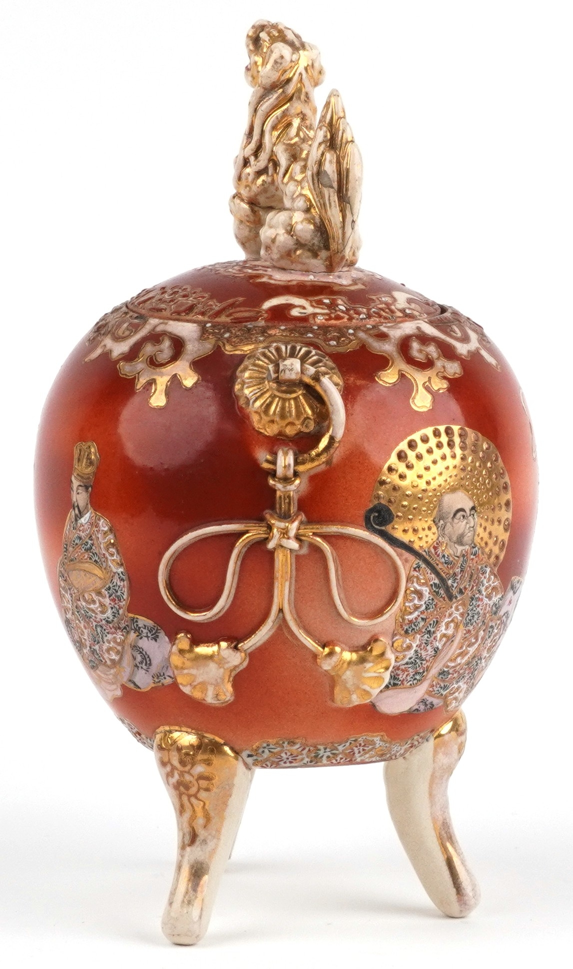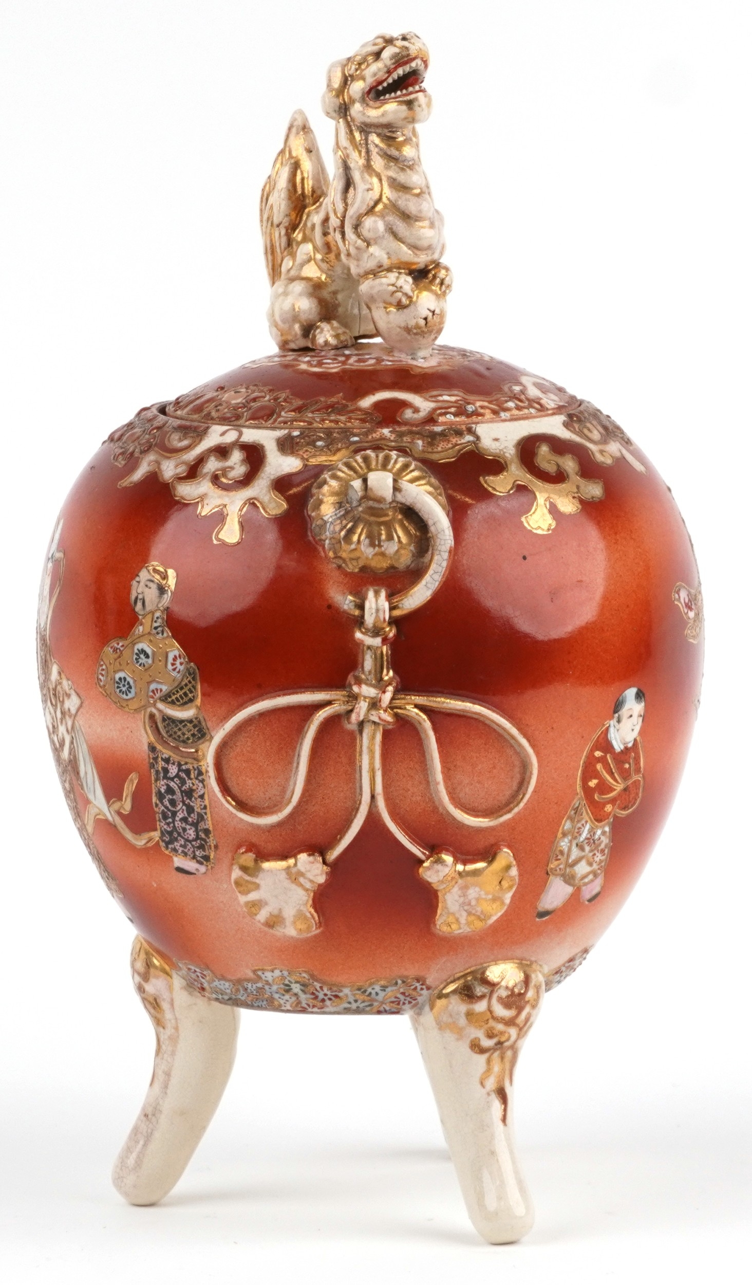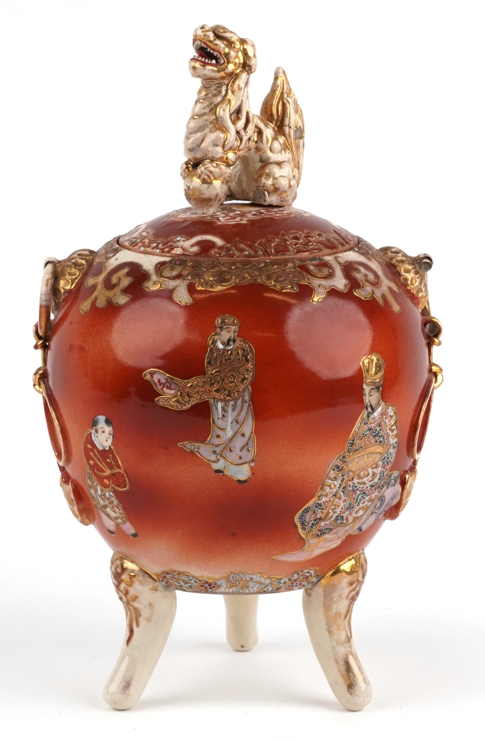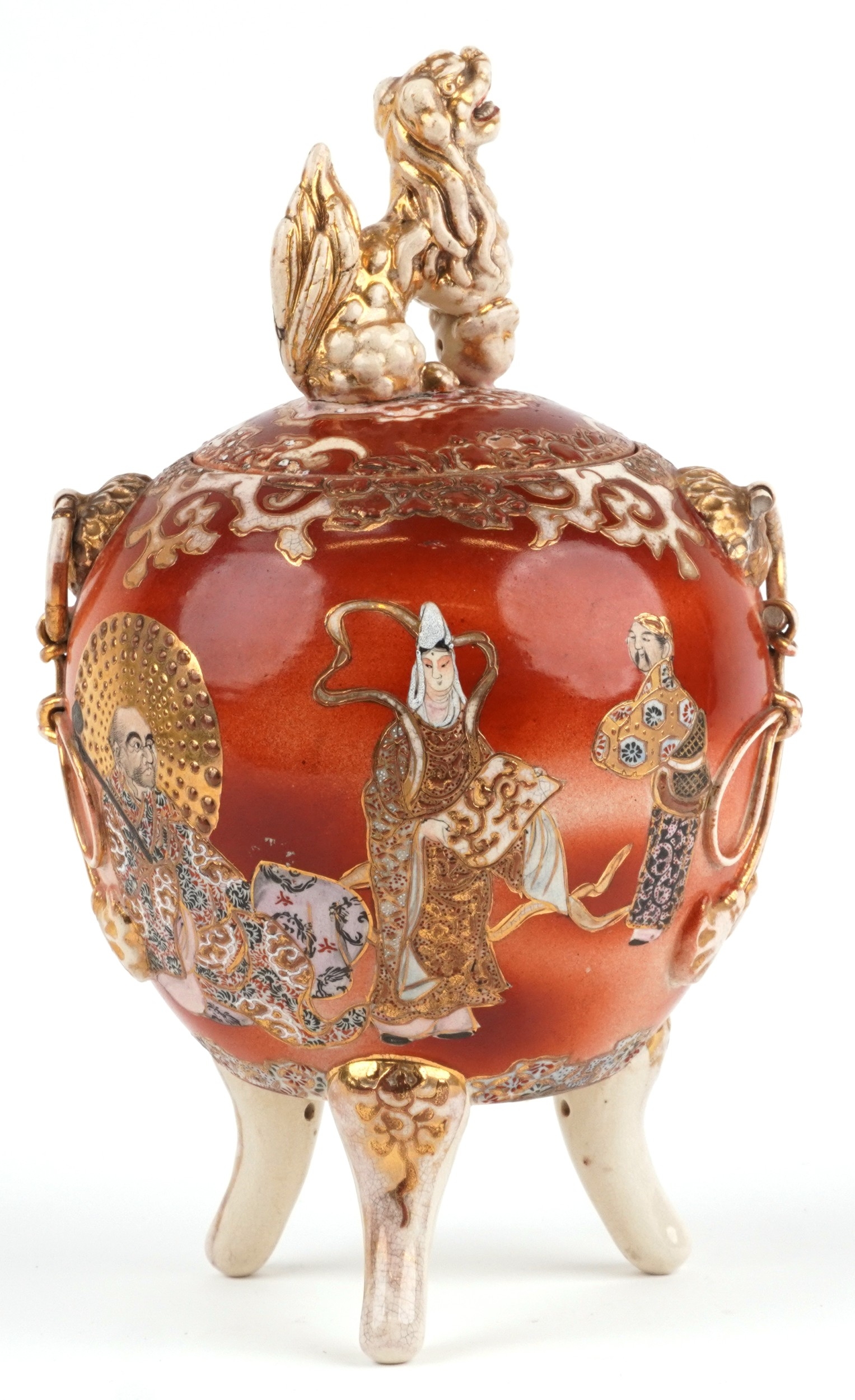 A Japanese Satsuma tripod censer and cover having a dog of Foo knop, hand painted with an emperor, 35cm high.