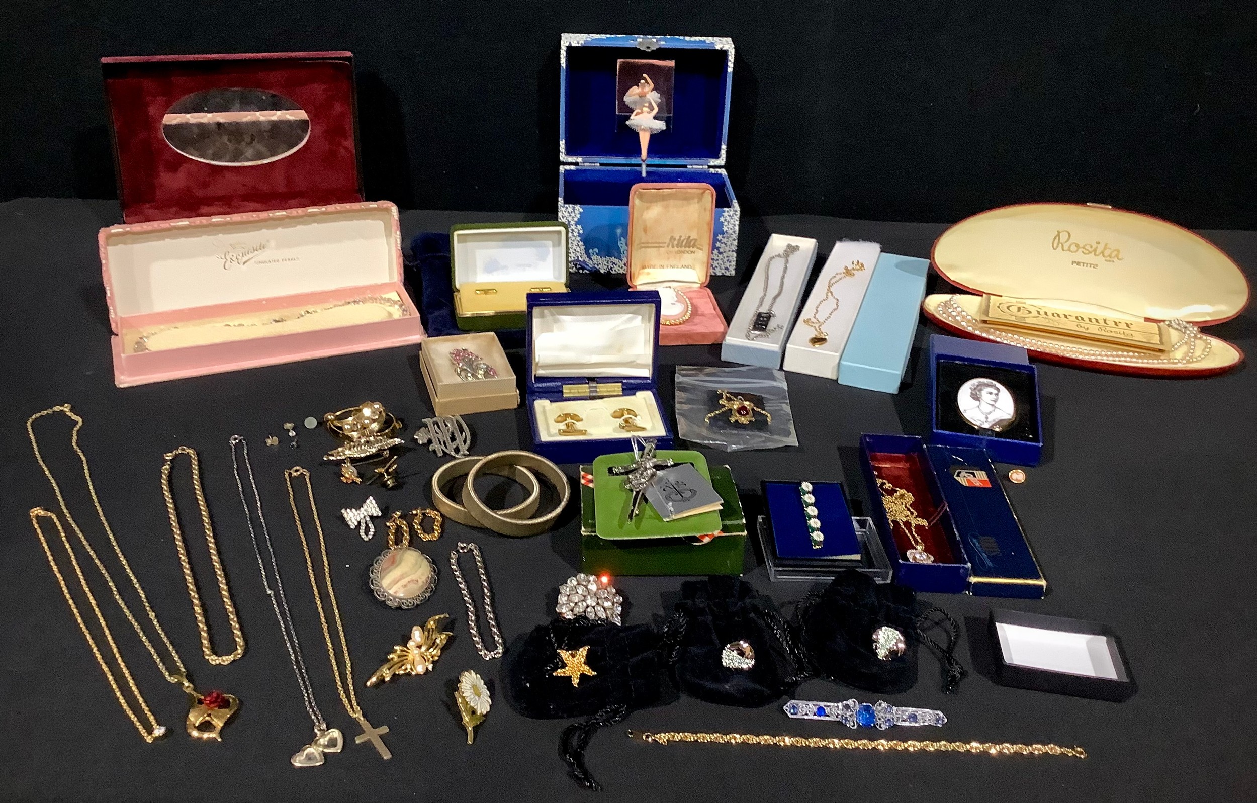to include brooches, pendant necklaces, pin badges, pairs of cufflinks boxed, a Rosita triple strand simulated pearl necklace boxed with certificate and a small children's ballerina jewellery box