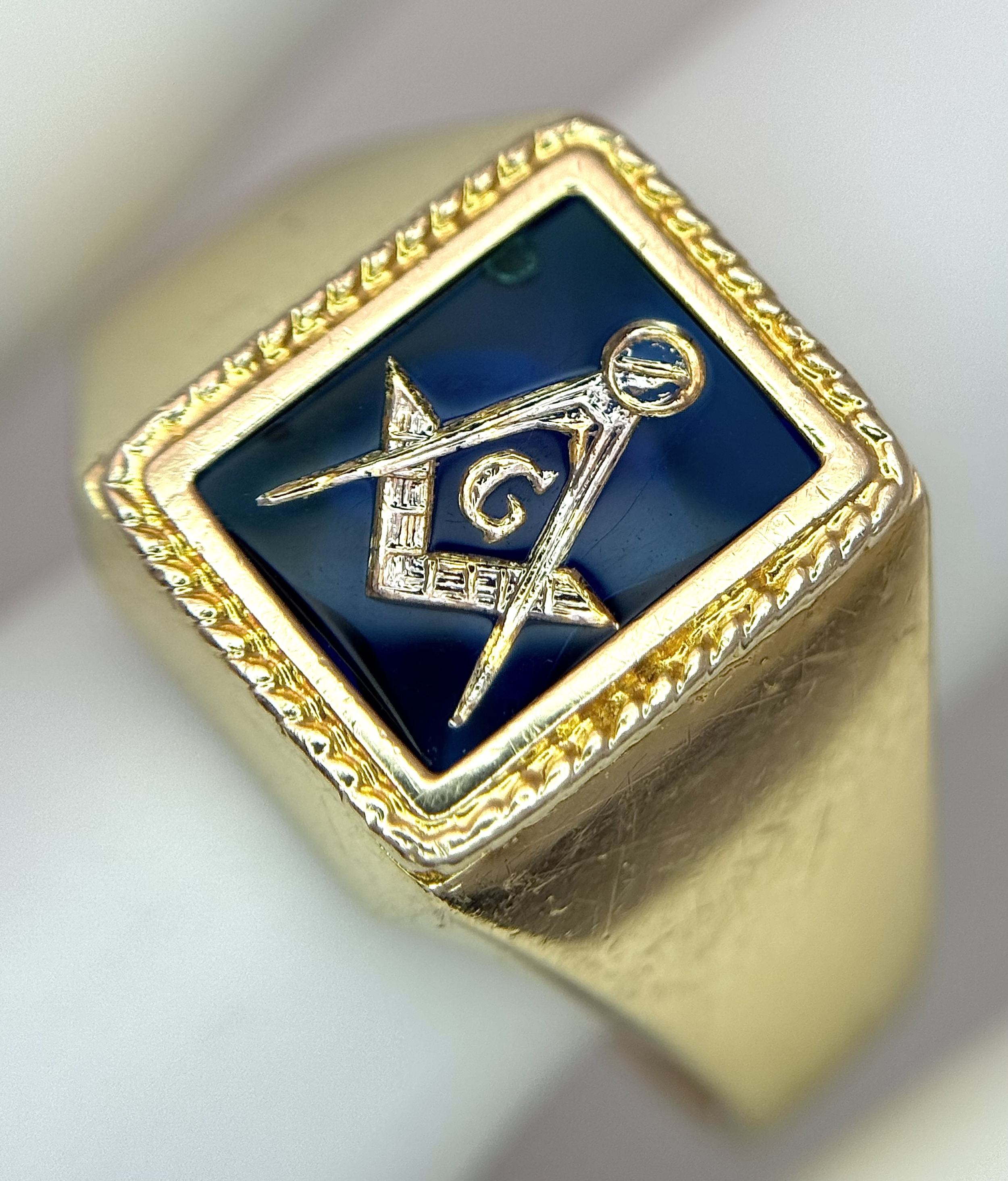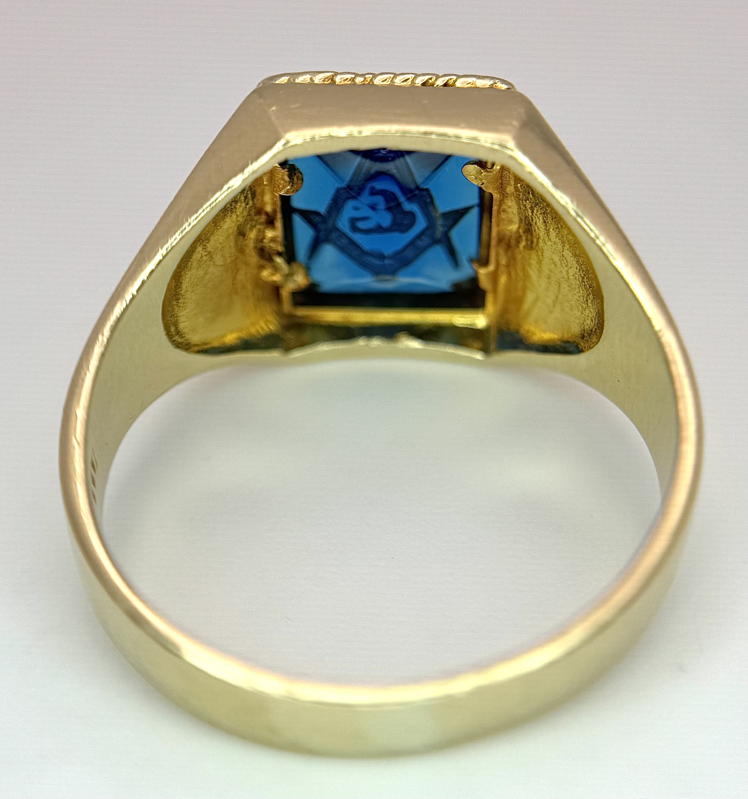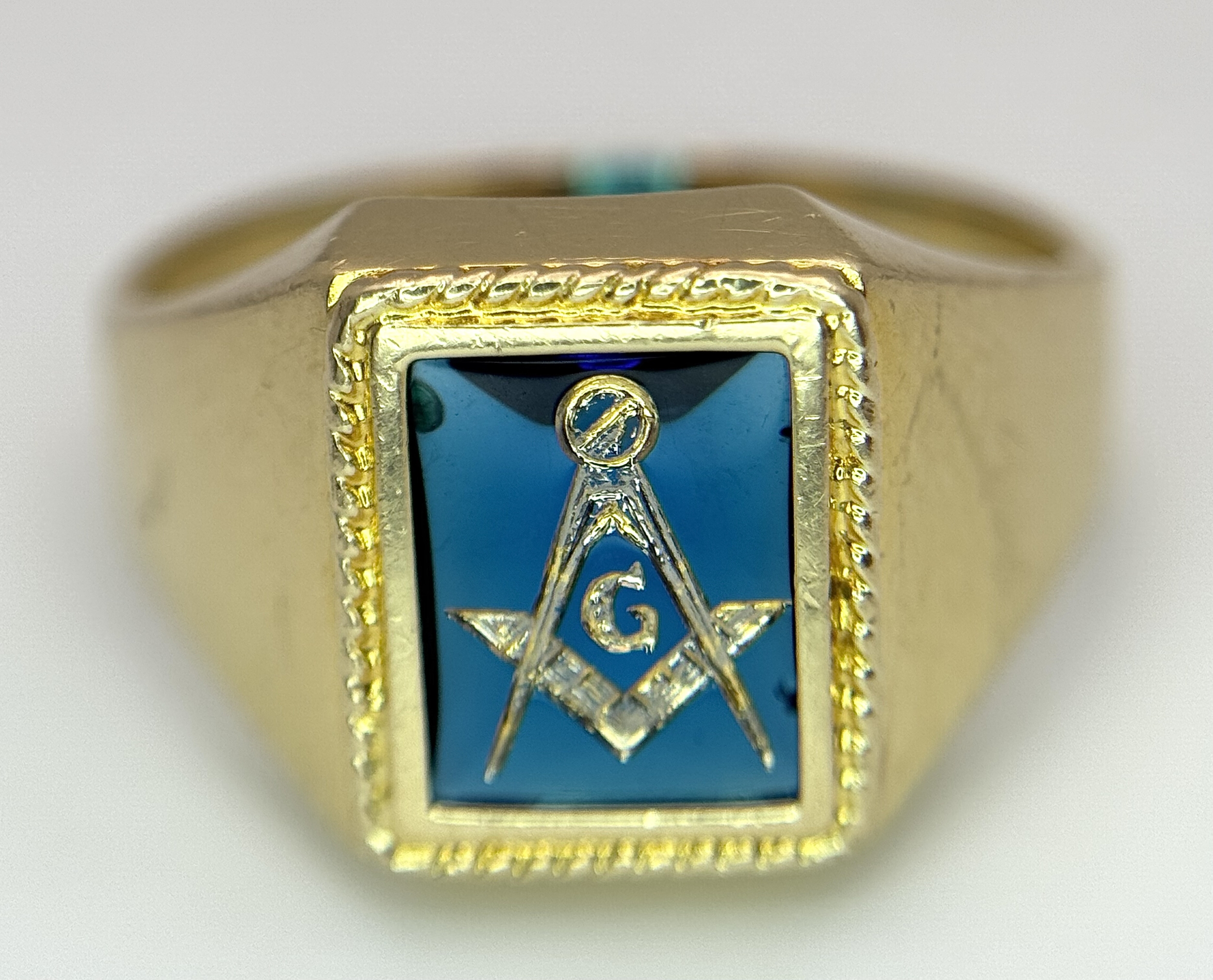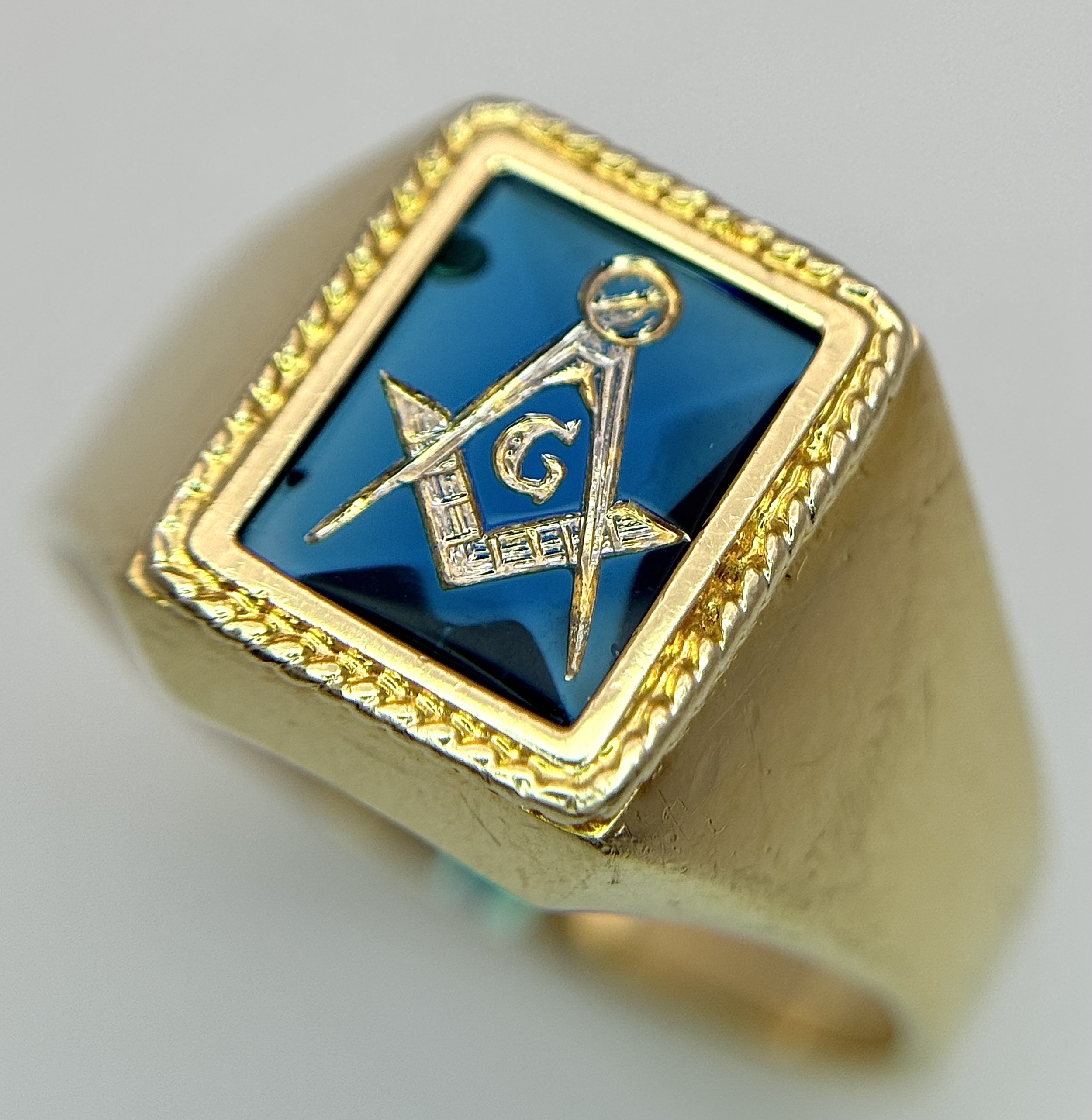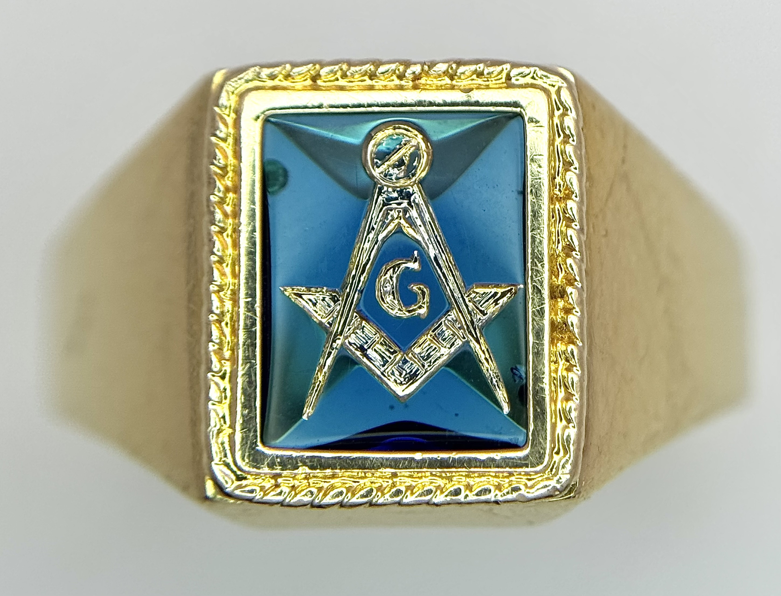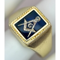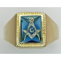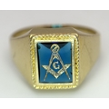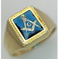 A 14K Yellow Gold and Blue Stone Gents Masonic Signet Ring. Size T. 6.45g. Ref: 27614.