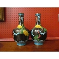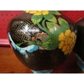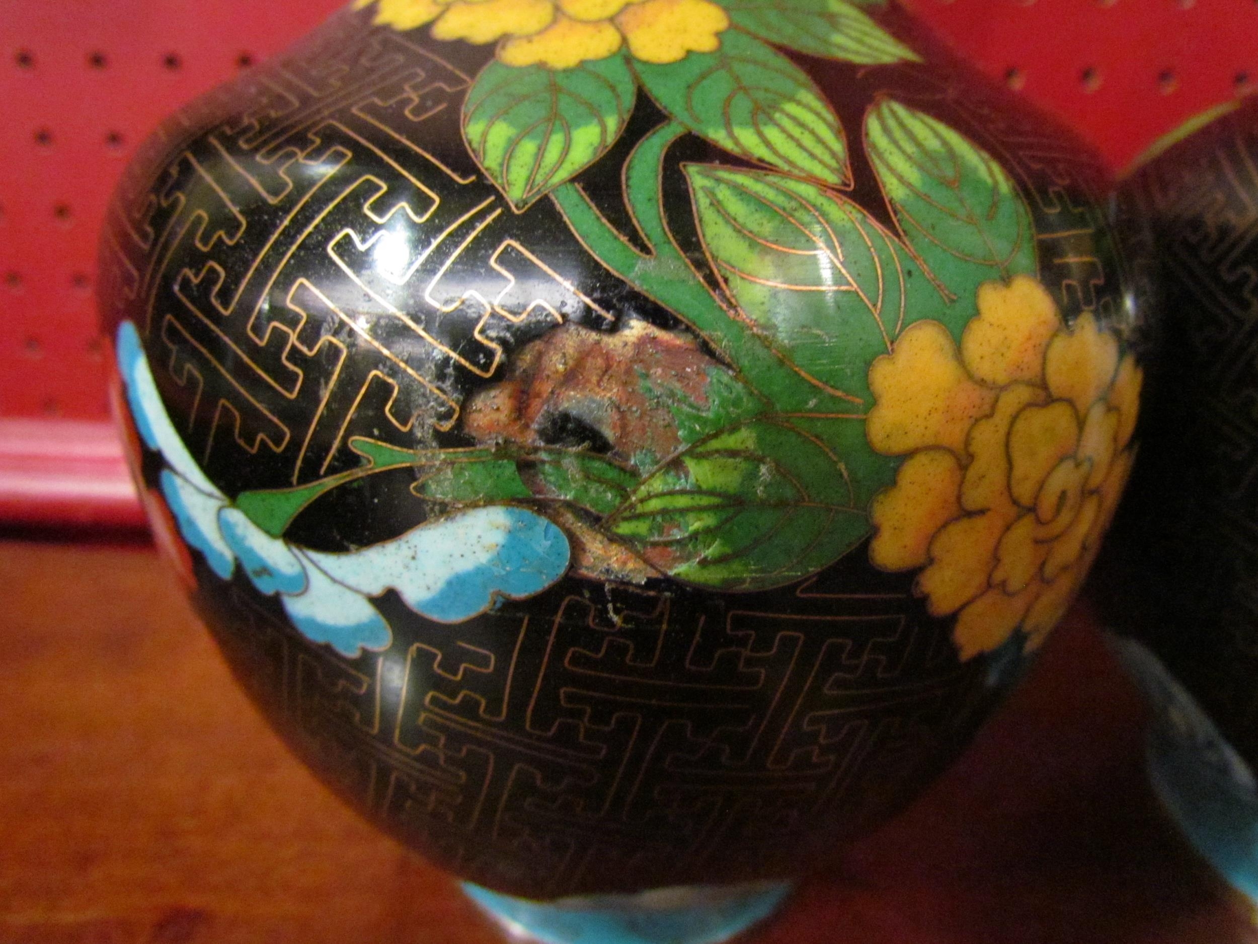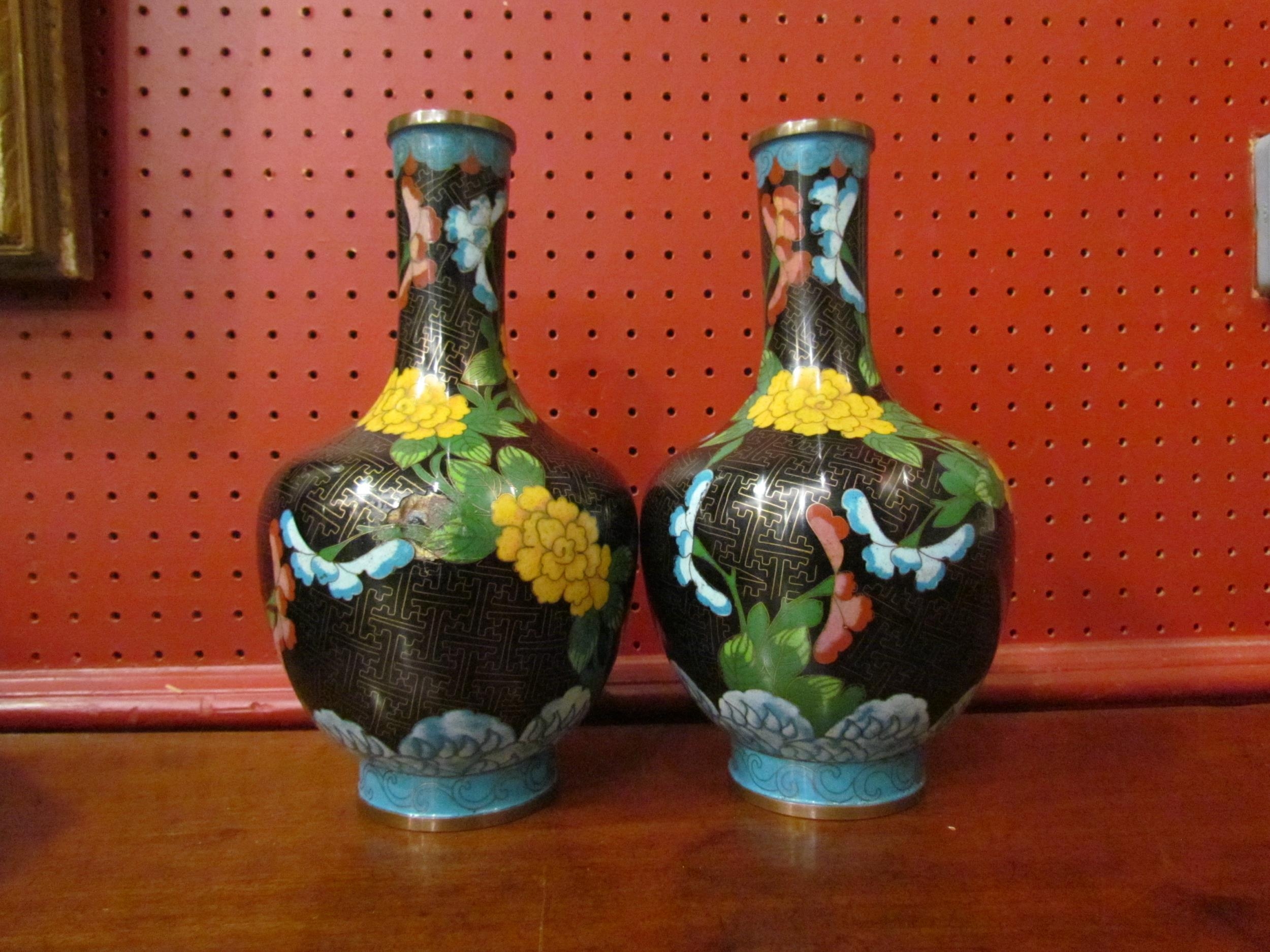A pair of modern cloisonne vases of bottle form, black ground with butterflies and floral pattern, dent to one, 24.5cm tall