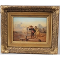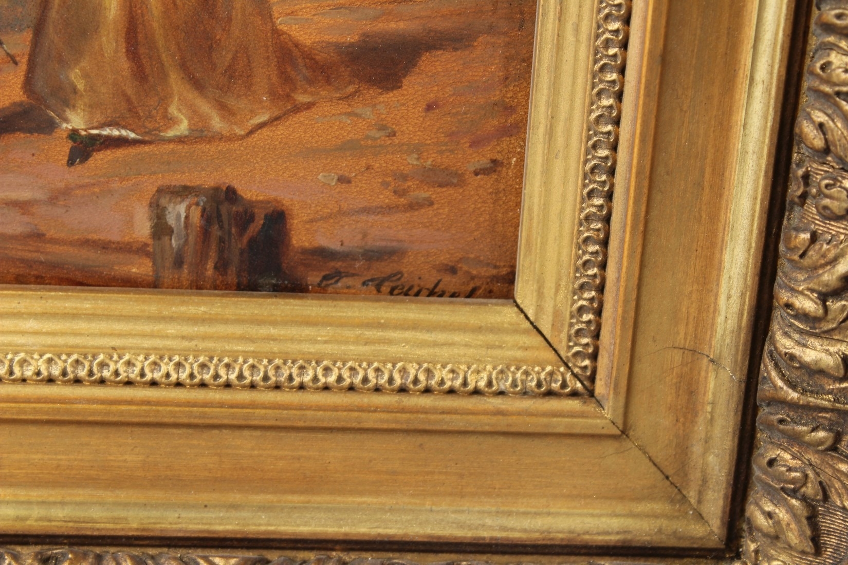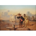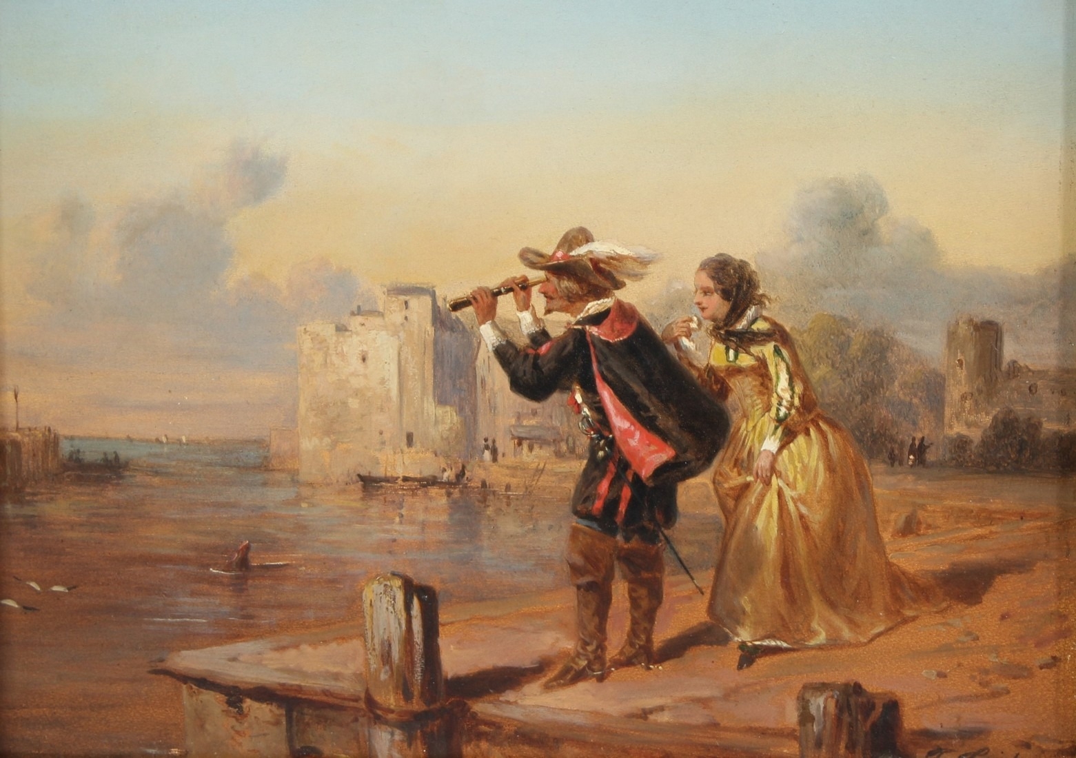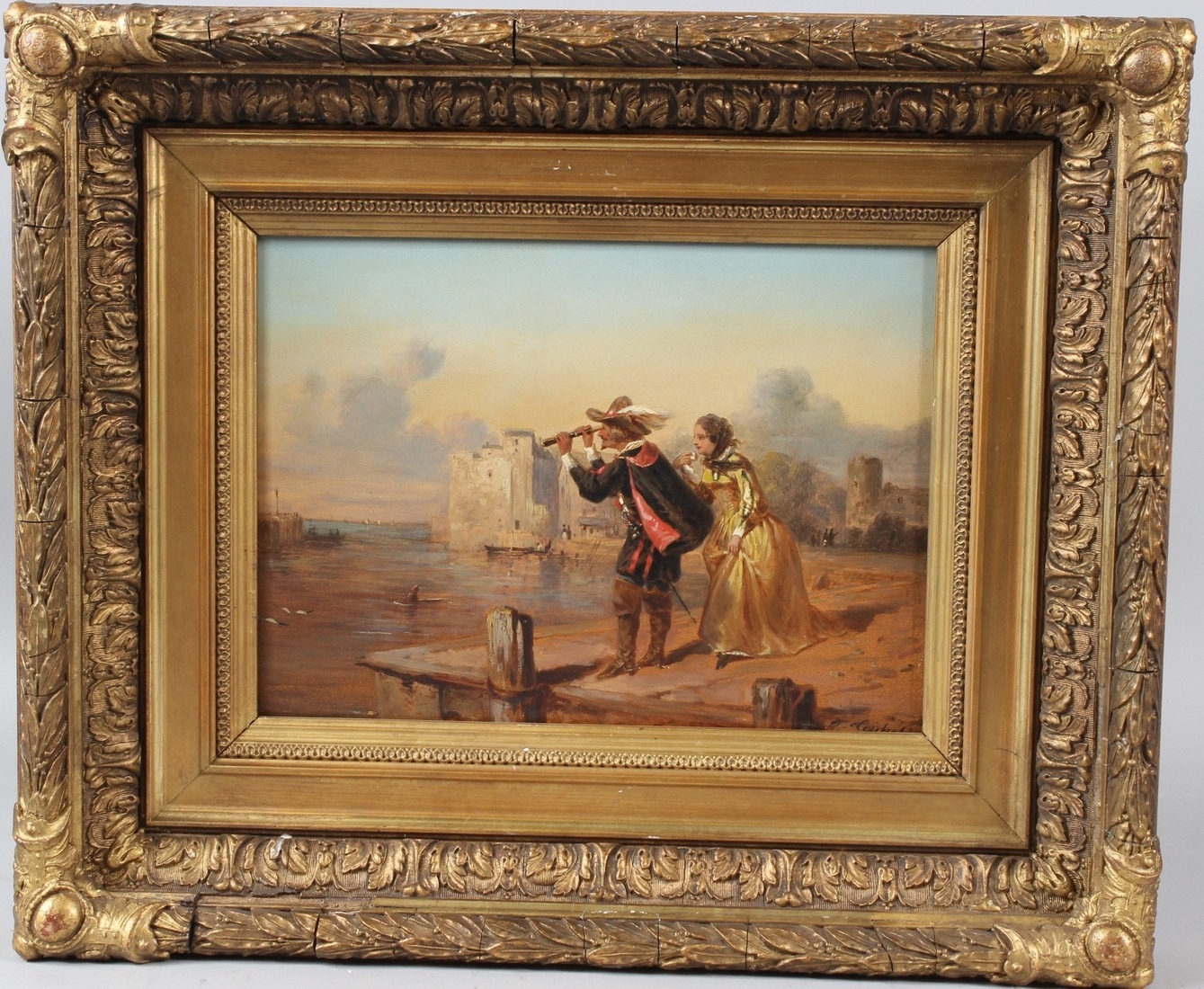CONTINENTAL SCHOOL View of a coastal castle with a couple looking out to sea oil on board signed indistinctly 19.5 x 27cm
