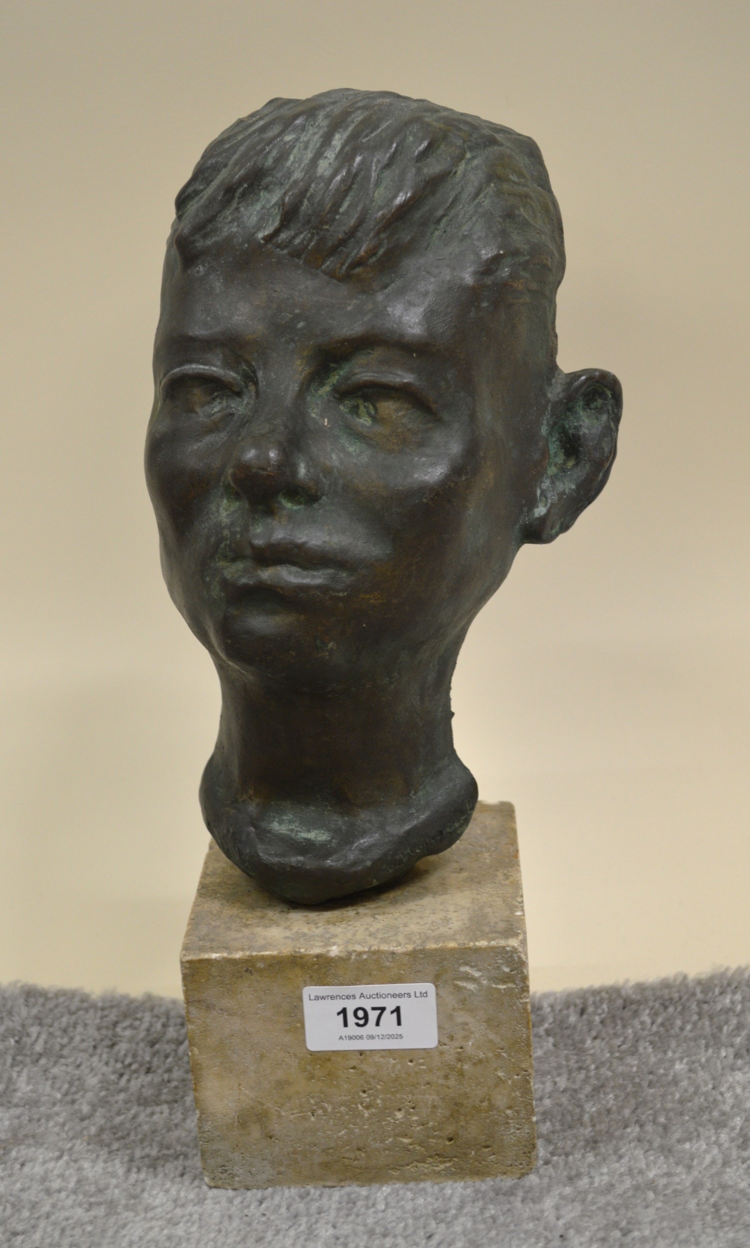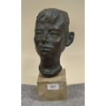 20th Century brown patinated bronze sculpture, head of a boy, signed indistinctly in the bronze, mounted on a square stone base, 30cm high