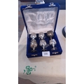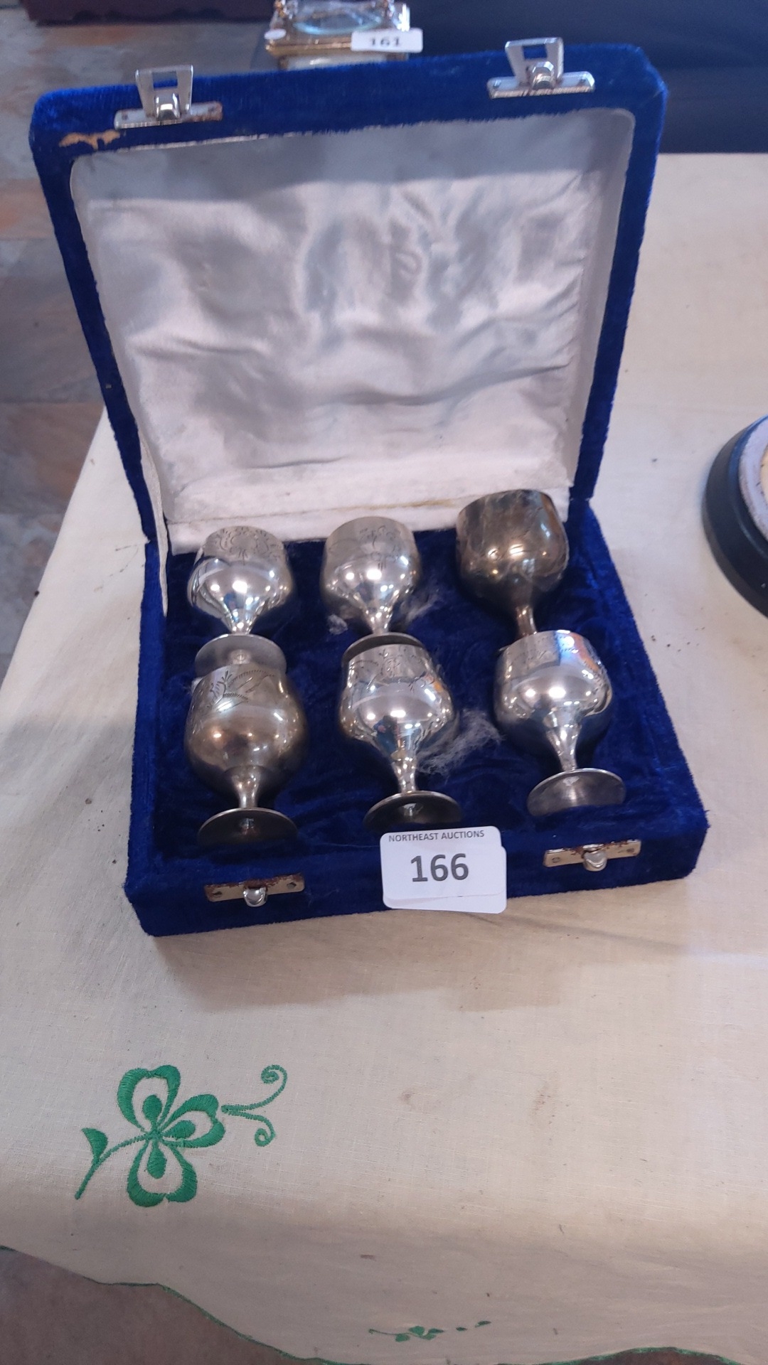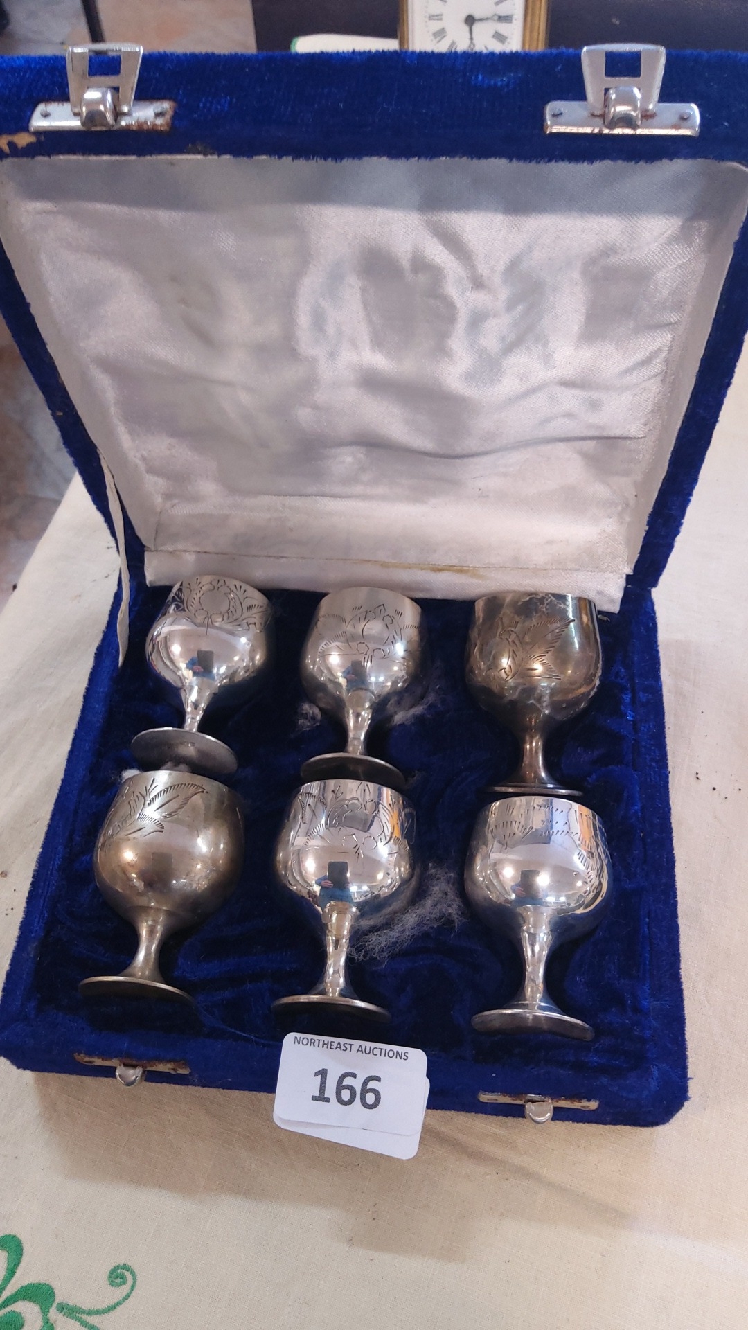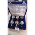 A fitted case containing six silver-plated liqueur goblets, each of rounded bowl form on a knopped stem and spreading foot, the bowls engraved with foliate scrollwork.