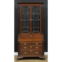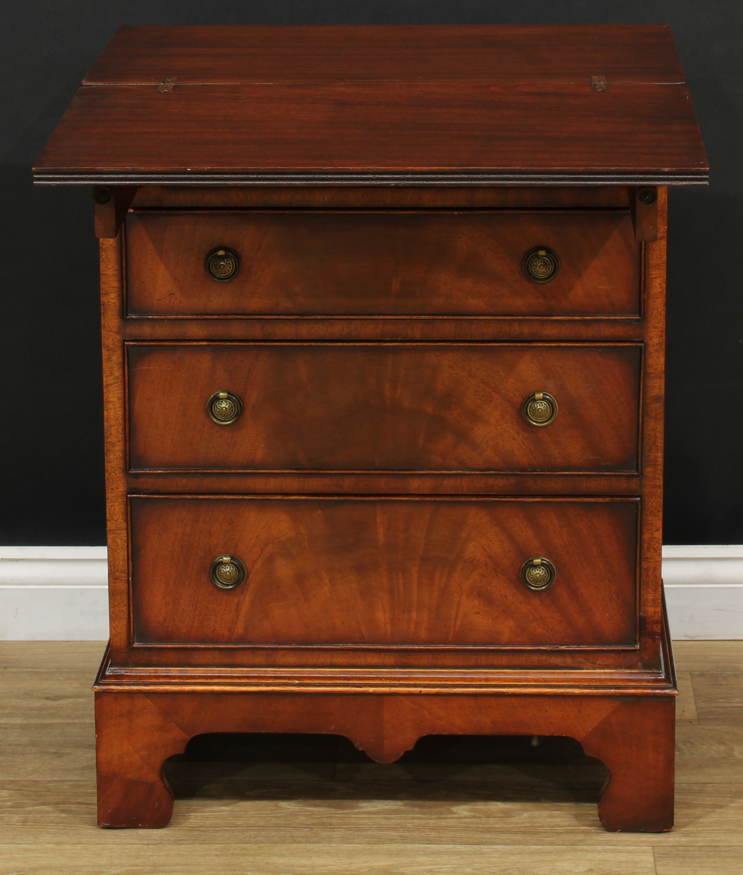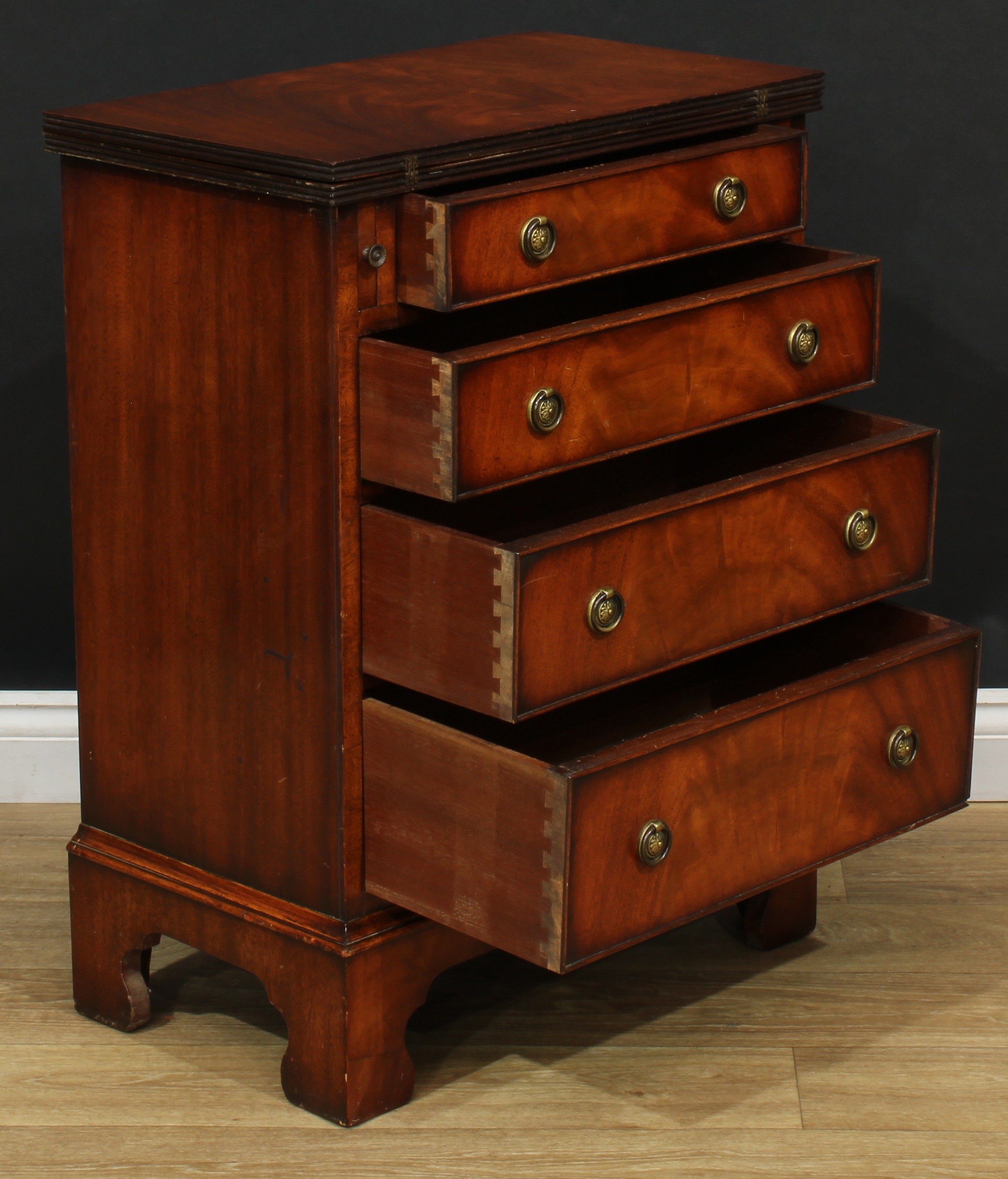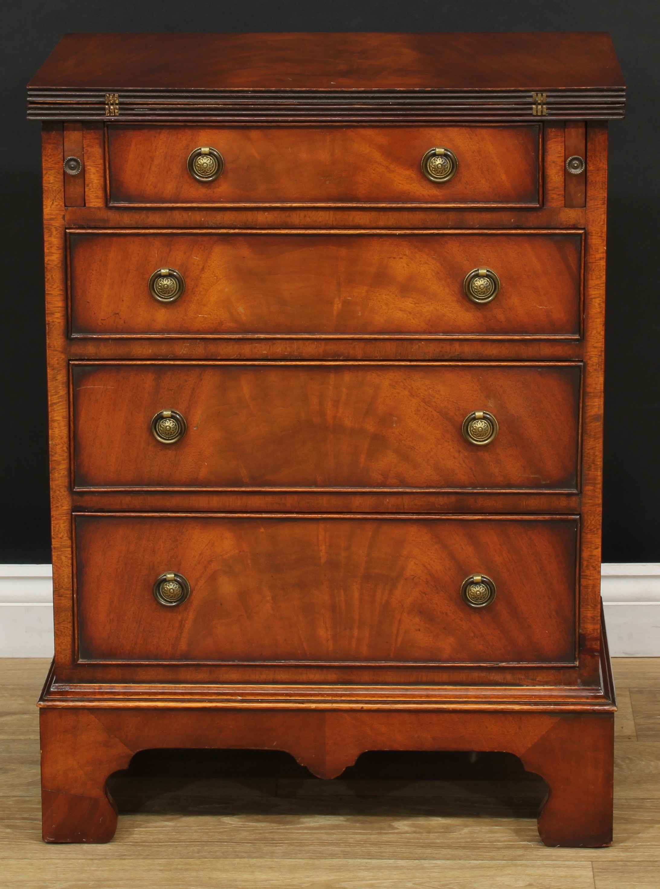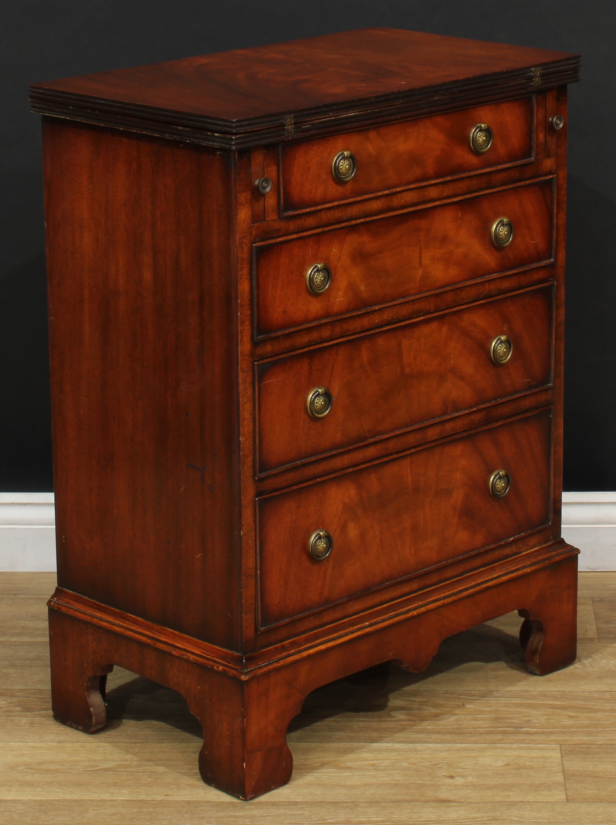 A Queen Anne style bachelor's chest, fold-over top above four long graduated drawers, skirted base, bracket feet, 79.5cm high, 59cm wide, 35cm deep