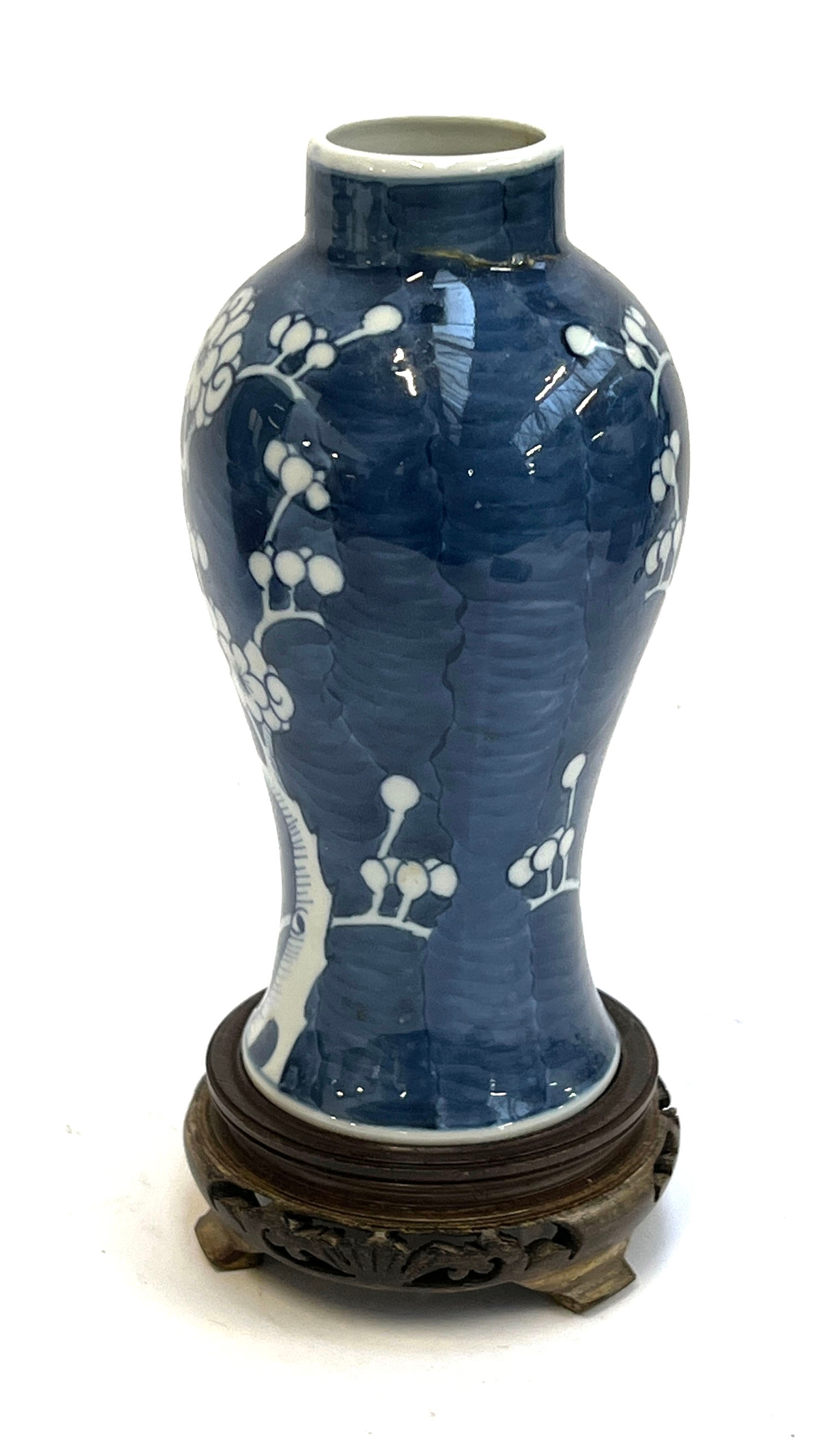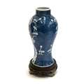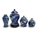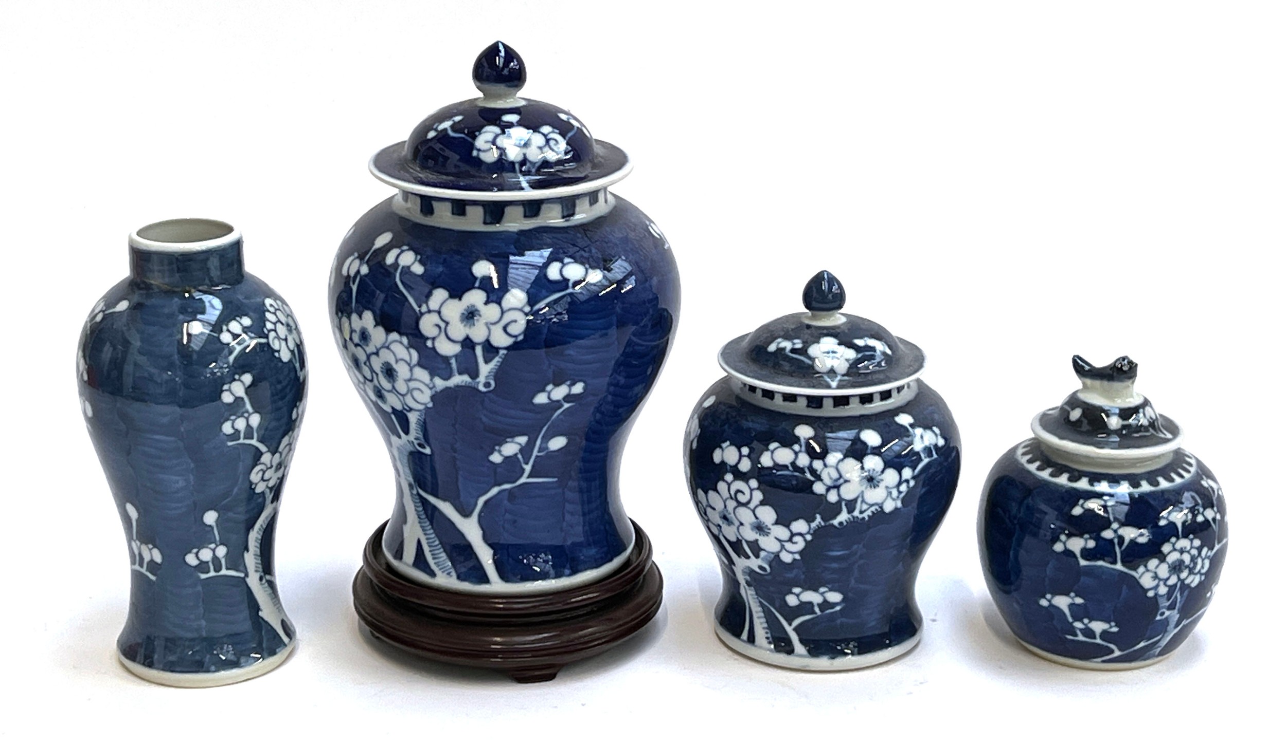 A collection of Chinese blue and white porcelain prunus ginger jars and vase, the tallest 24cmH including carved hardwood stand