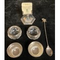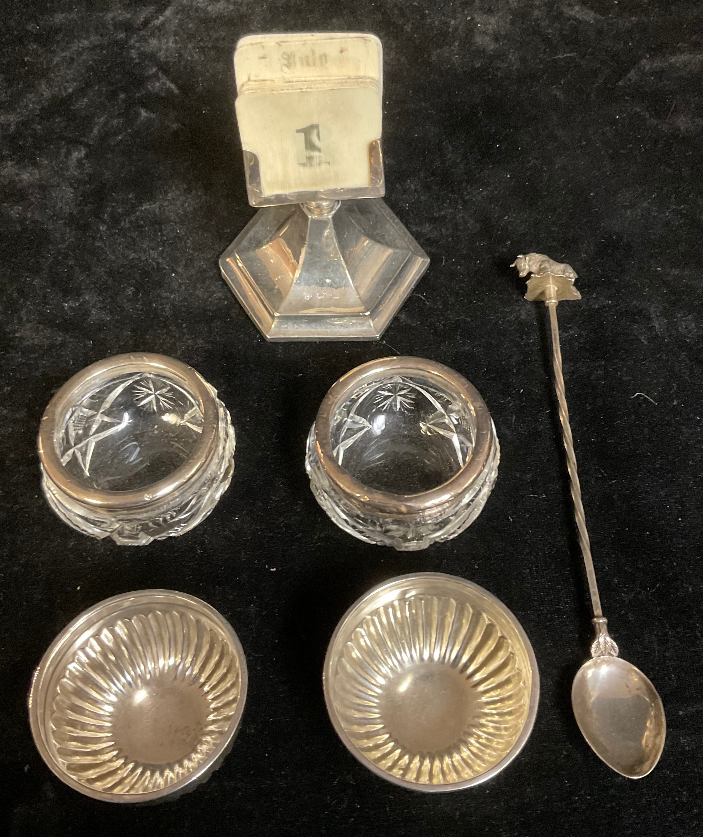 A silver desk calendar, Chester 1912; a pair of silver table salts, Sheffield 1904; a pair of clear glass silver mounted salt cellars; an unmarked spoon (6)