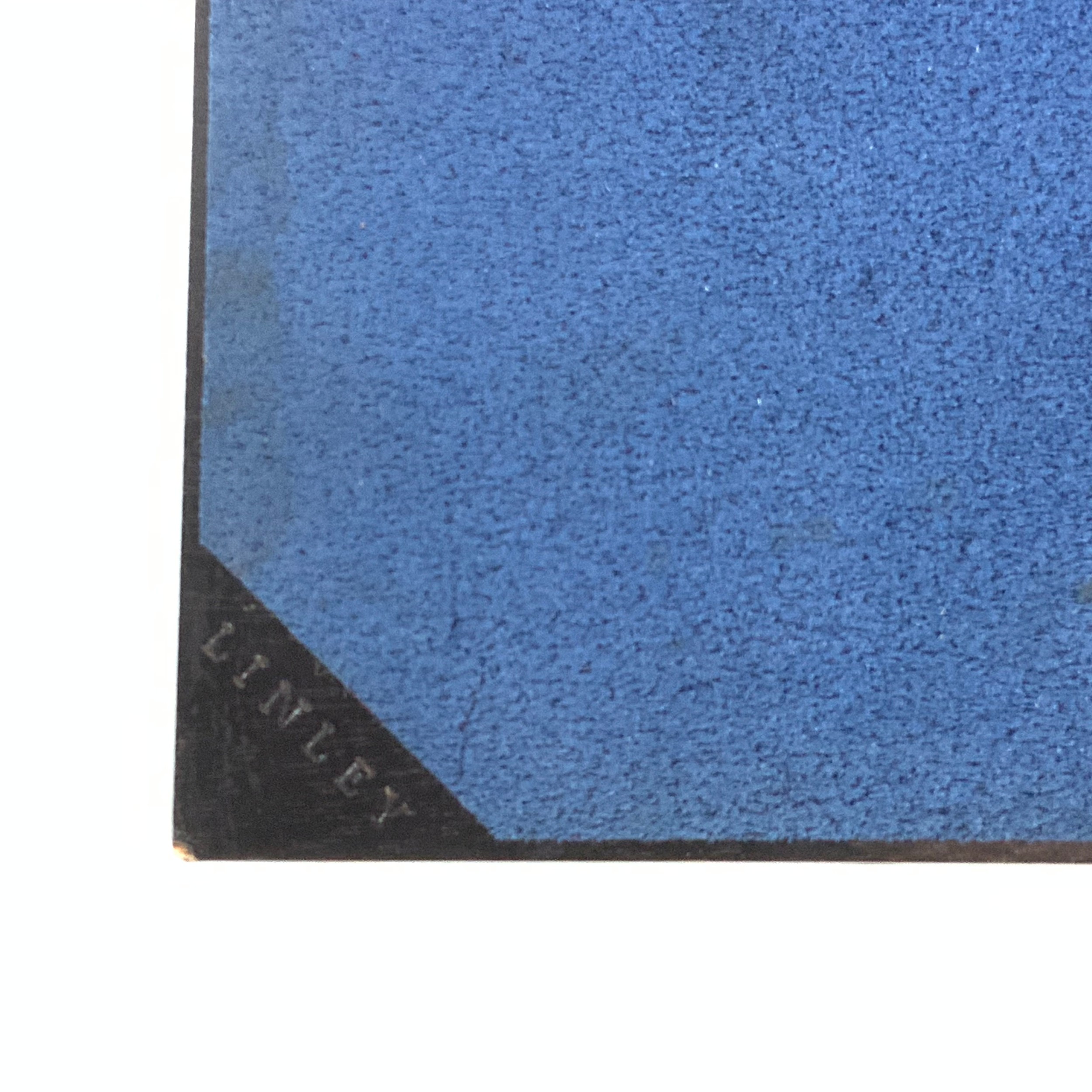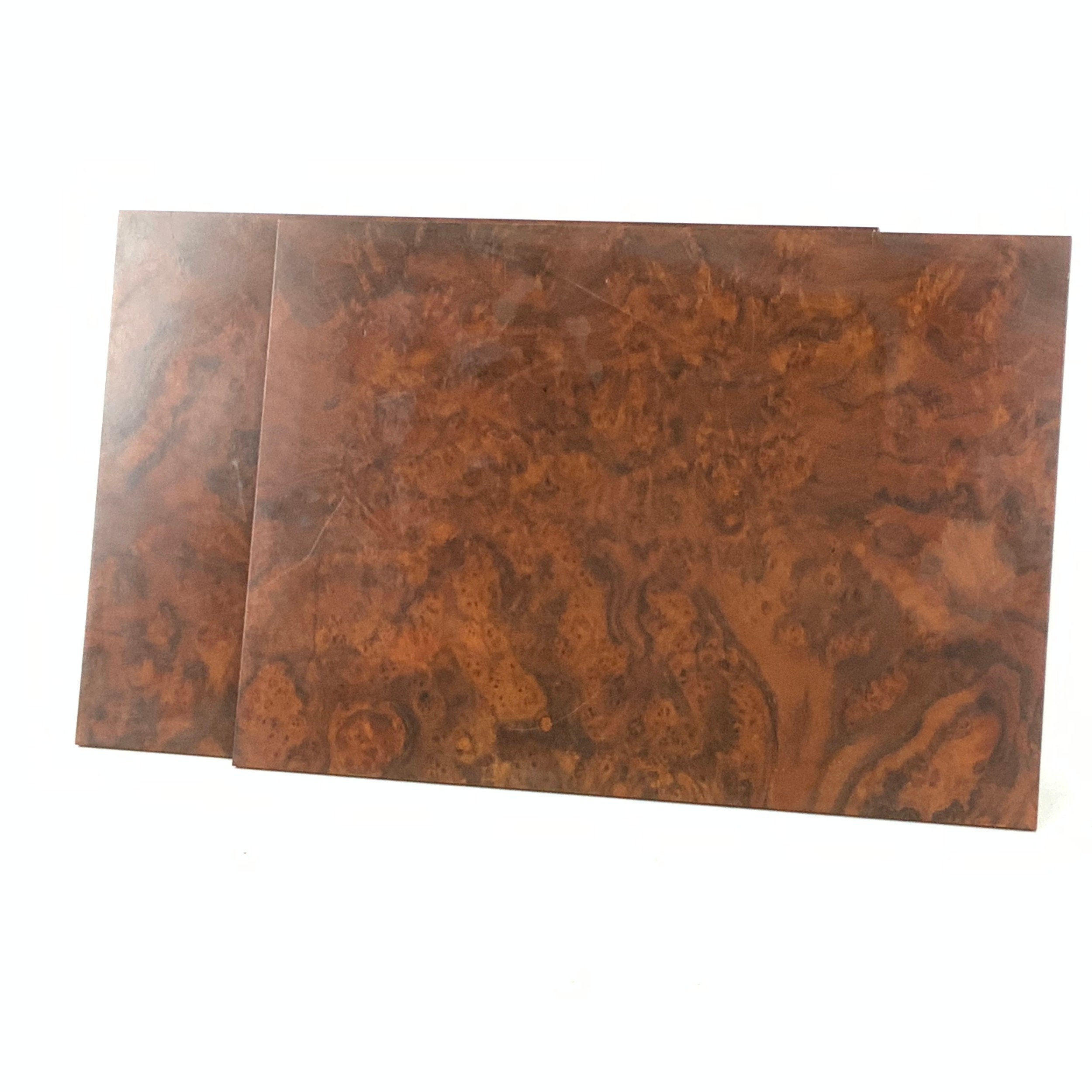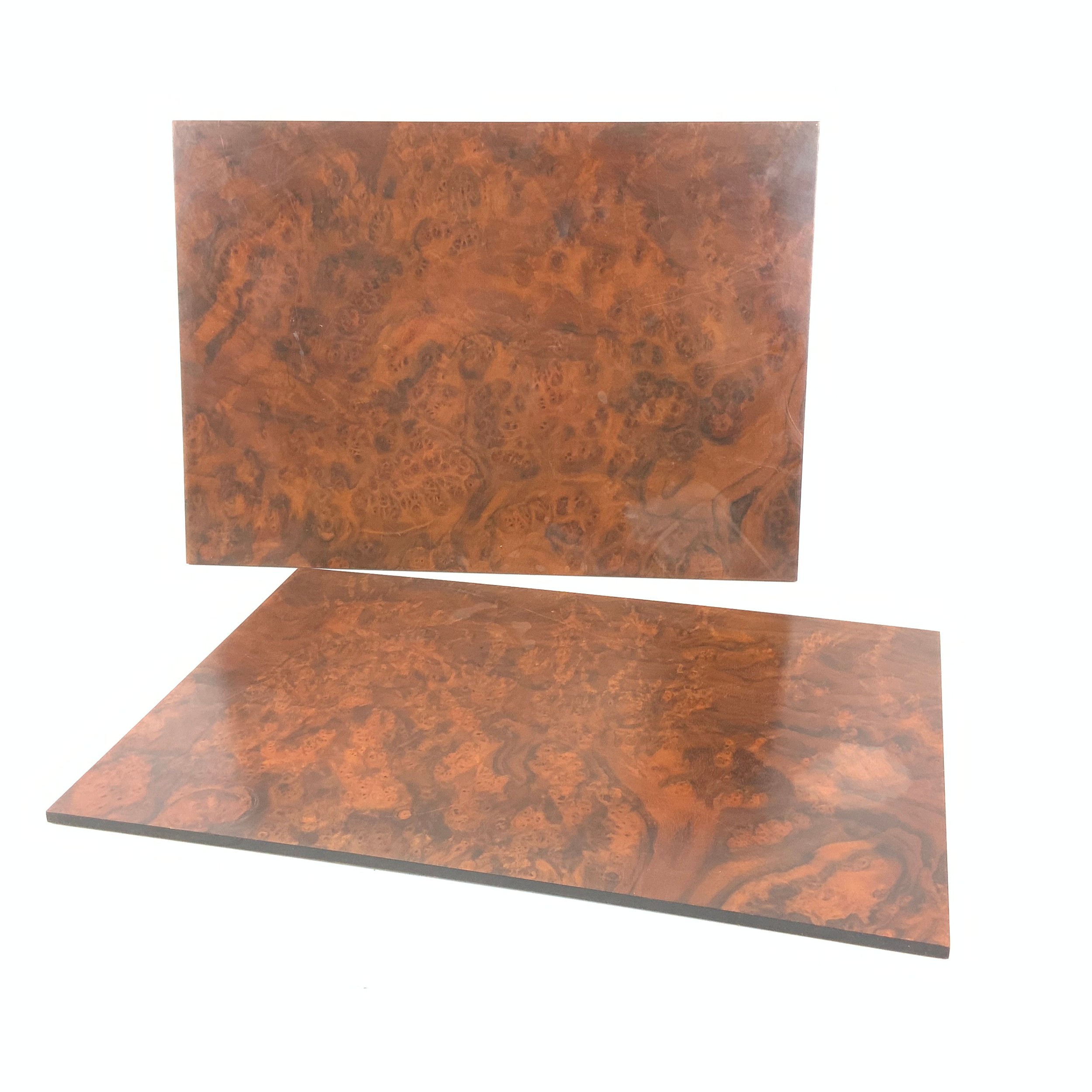 David Linley table place mats. Burr walnut with blue baize to underside. Stamped 'Linley' to underside corner of each mat. Each W45cm, D32cm (2).