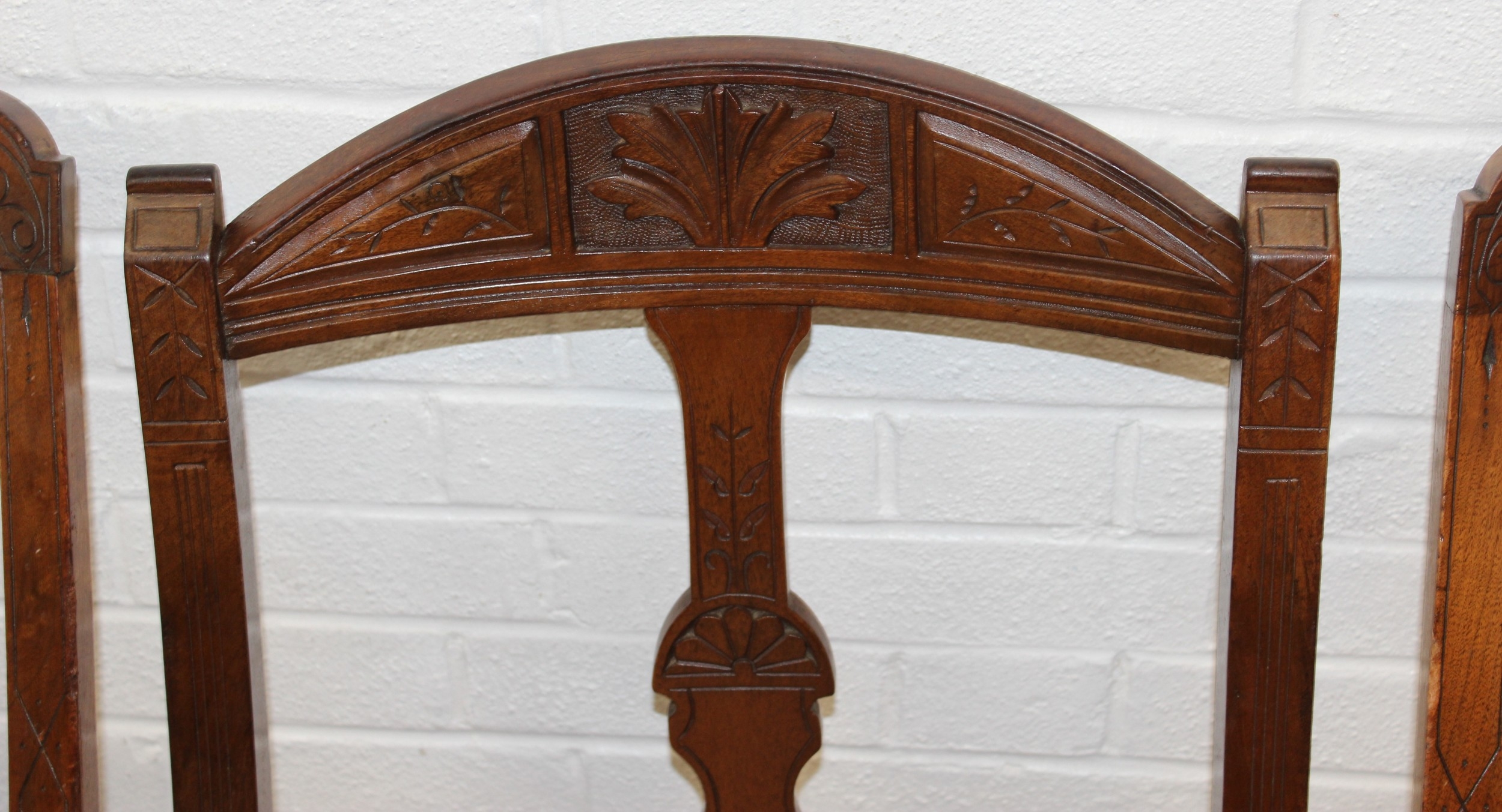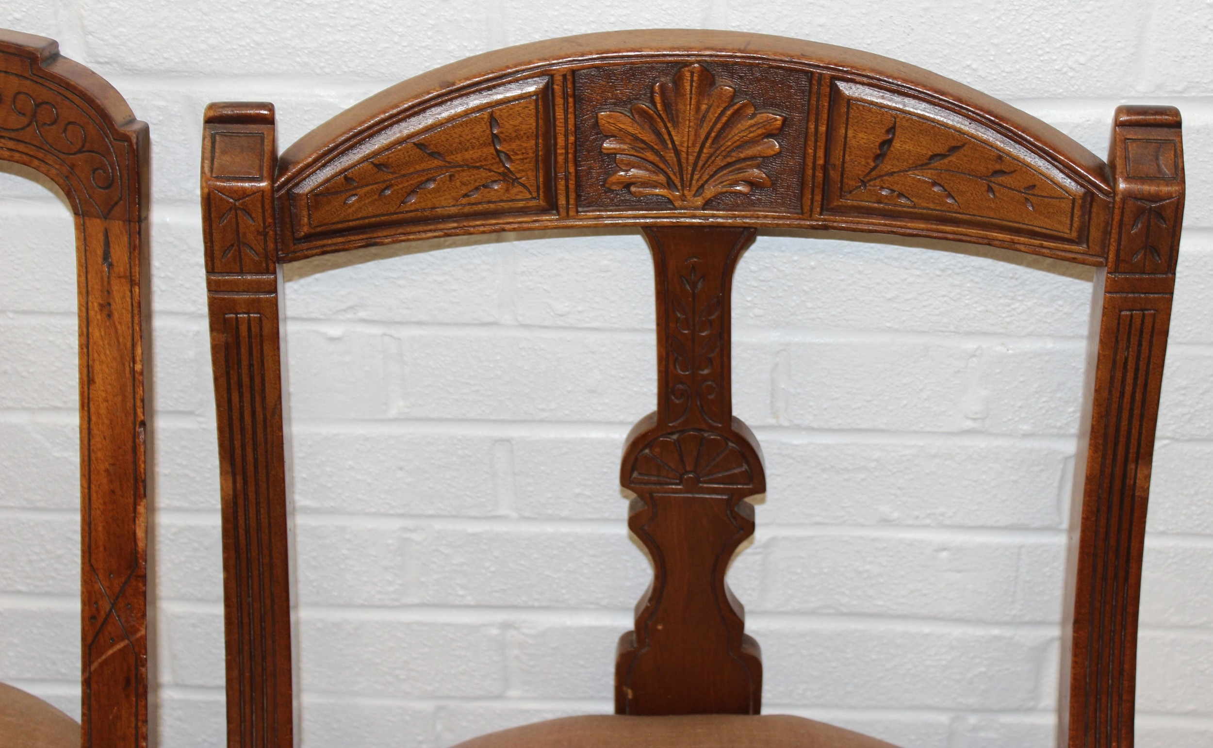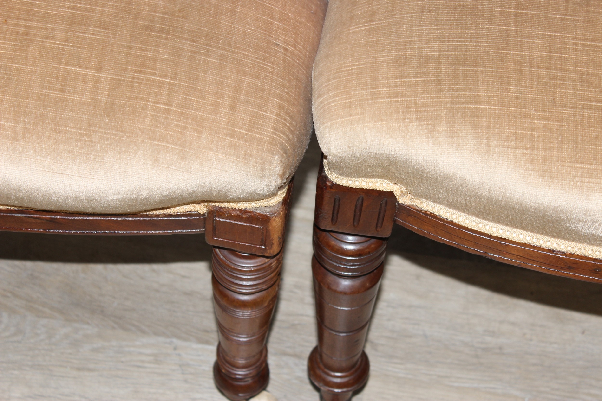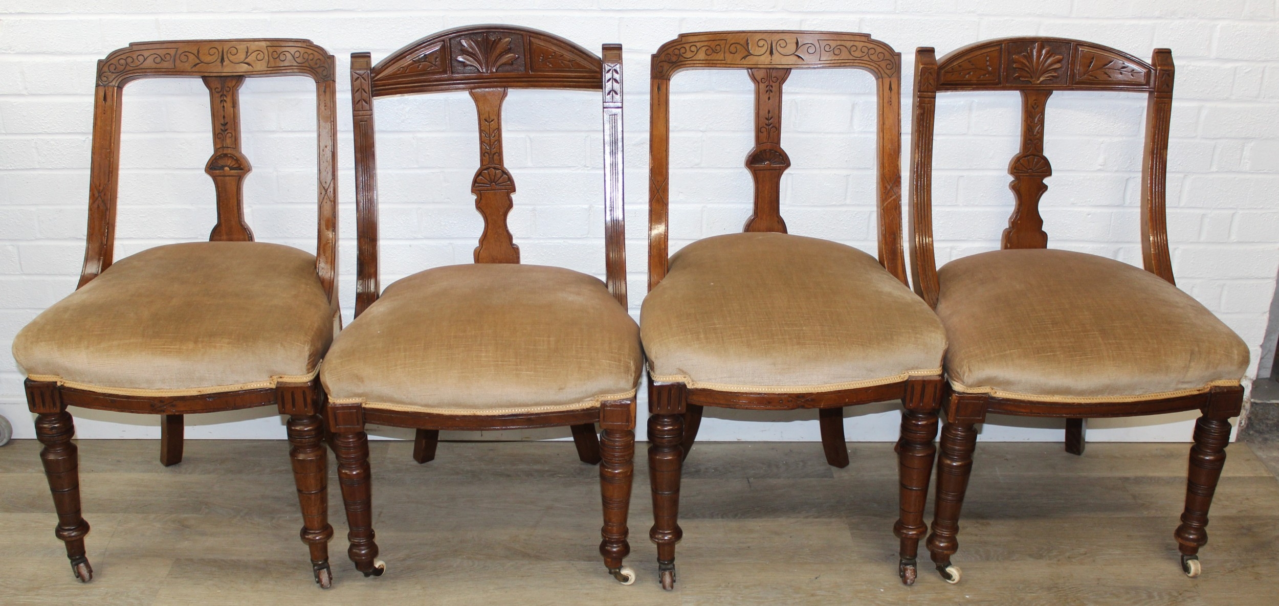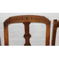 A set of Four matched salon chairs with carved and curved backs and gold coloured upholstery, each 87cm tall [4]