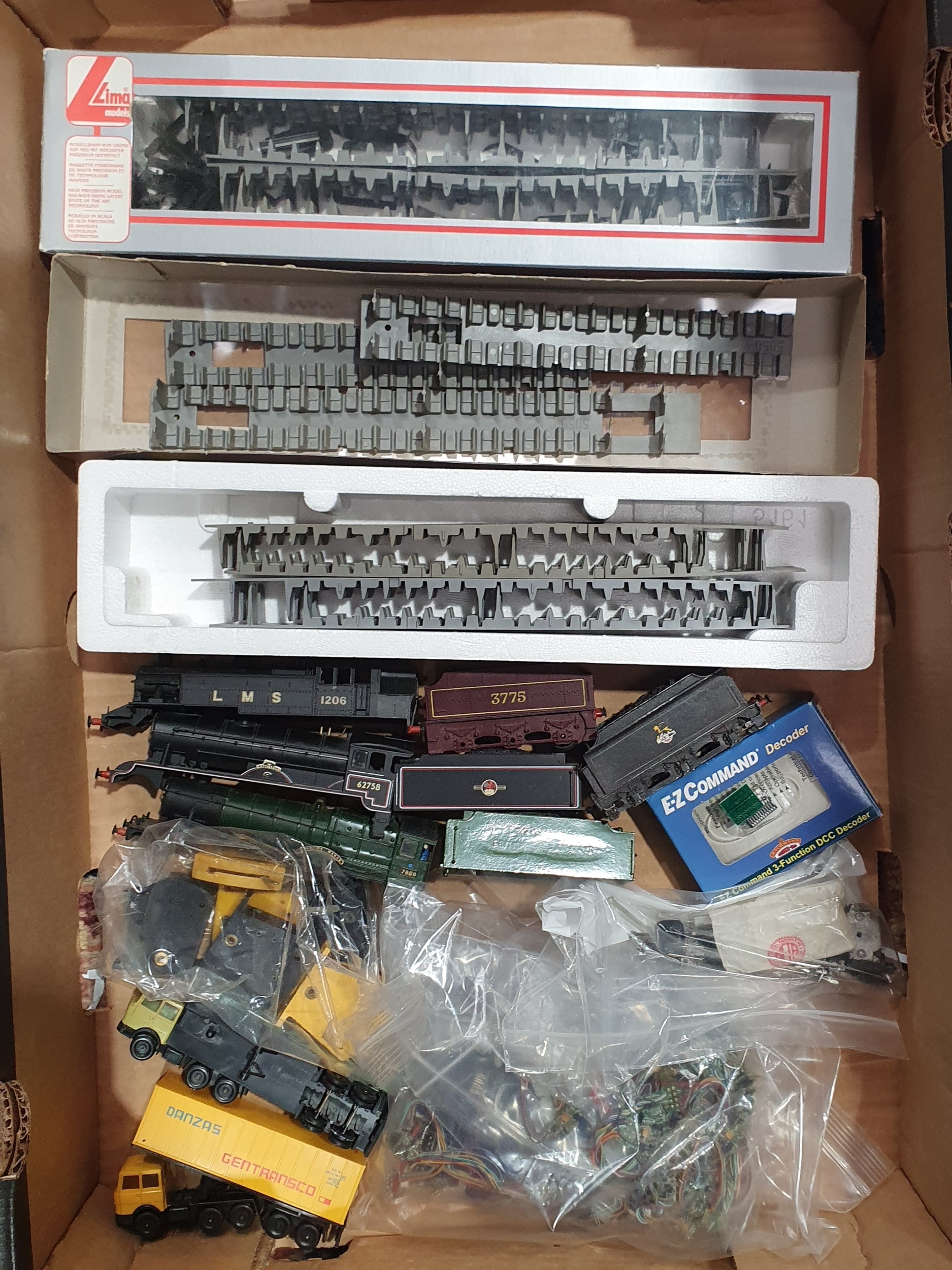 A quantity of 00 gauge Locomotive Bodies, Coach Interiors and Electrical Spares to include; loco bodies (Ivatt Tank, D49 Hunt Class, GWR Manor, 2x Tender Tops & 2x Tenders, both incomplete); quantity of Coach Interiors and Corridor Connectors, F-G; large quantity of Locomotive Decoders (all untested), quantity of Hornby Switches for signals and points, 2x plastic Lorries and quantity of locomotive Spares