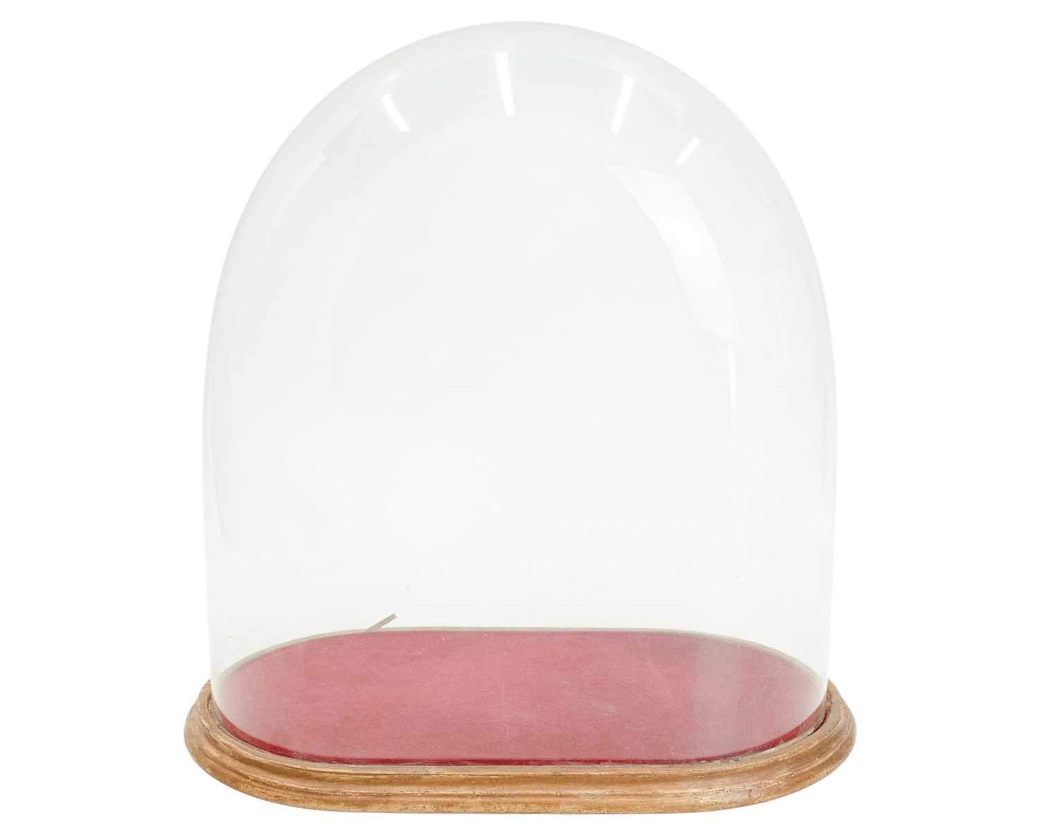 A Victorian large glass dome, height 43cm. The internal base 40x21.5cm, on a velvet lined stand. There are no chips or cracks. Internal base size 40x21.5