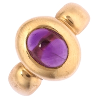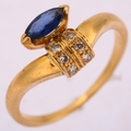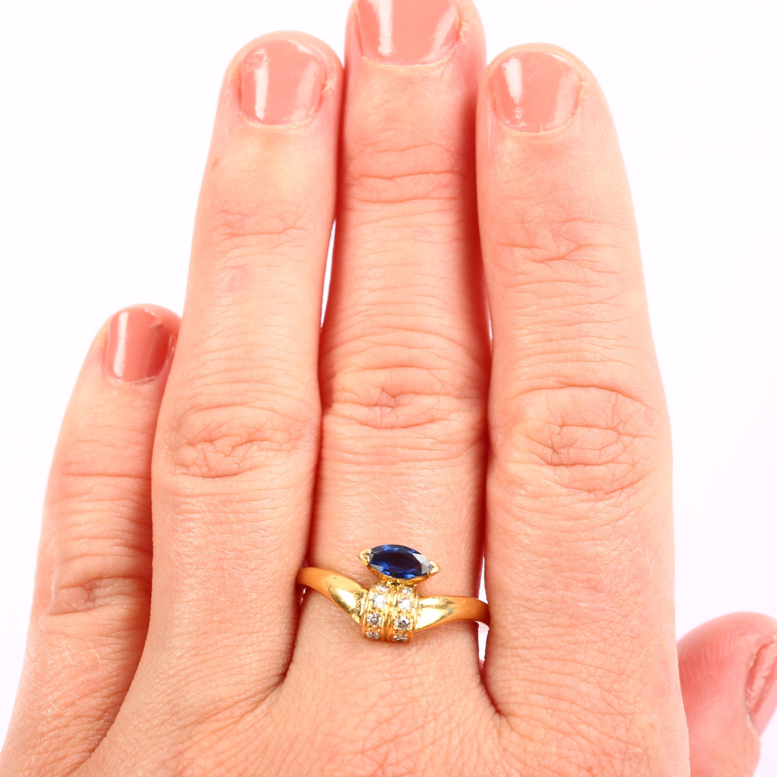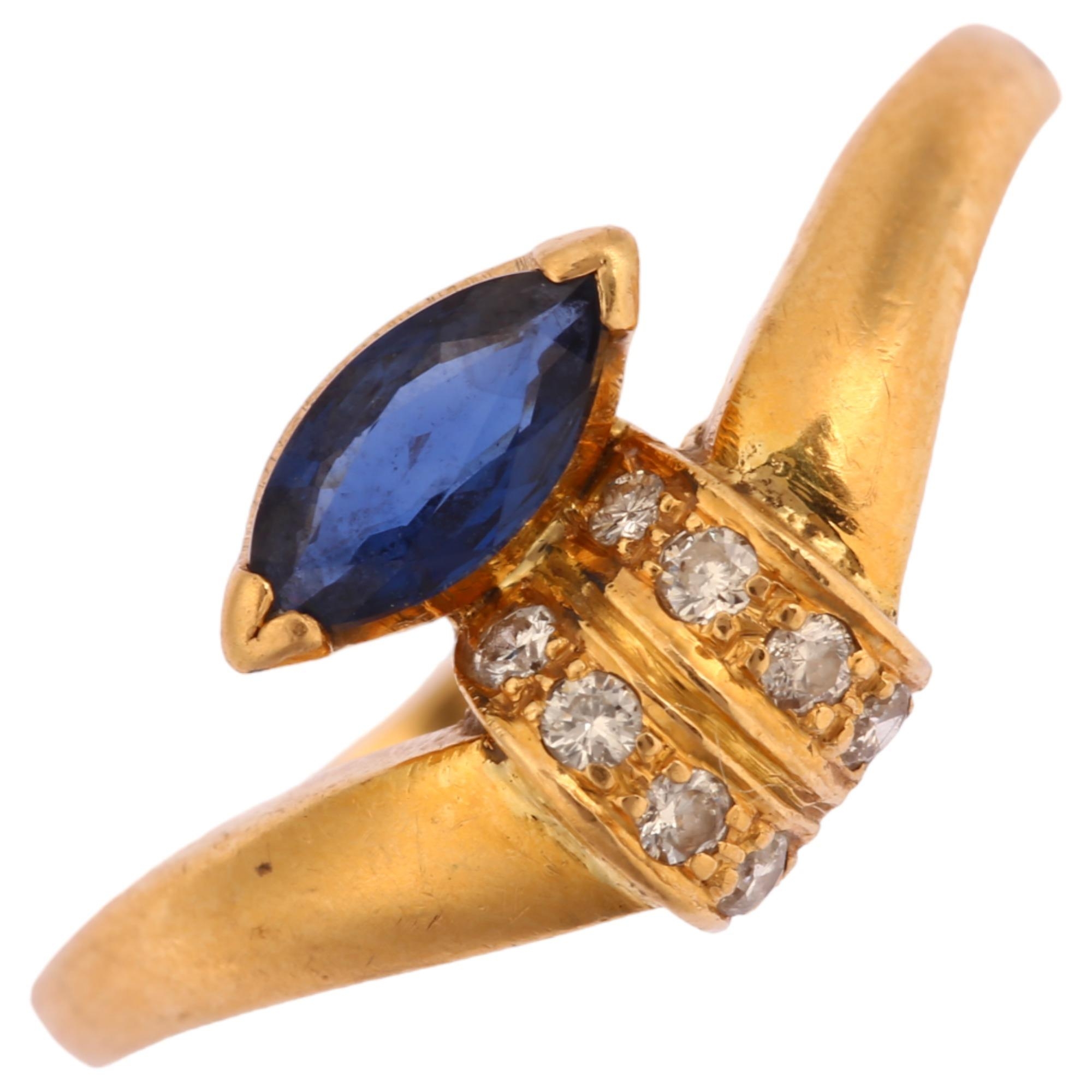 An 18ct gold sapphire and diamond dress ring, set with marquise-cut sapphire and modern round brilliant-cut diamonds, setting height 9.6mm, size N, 3.8g