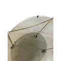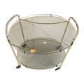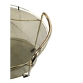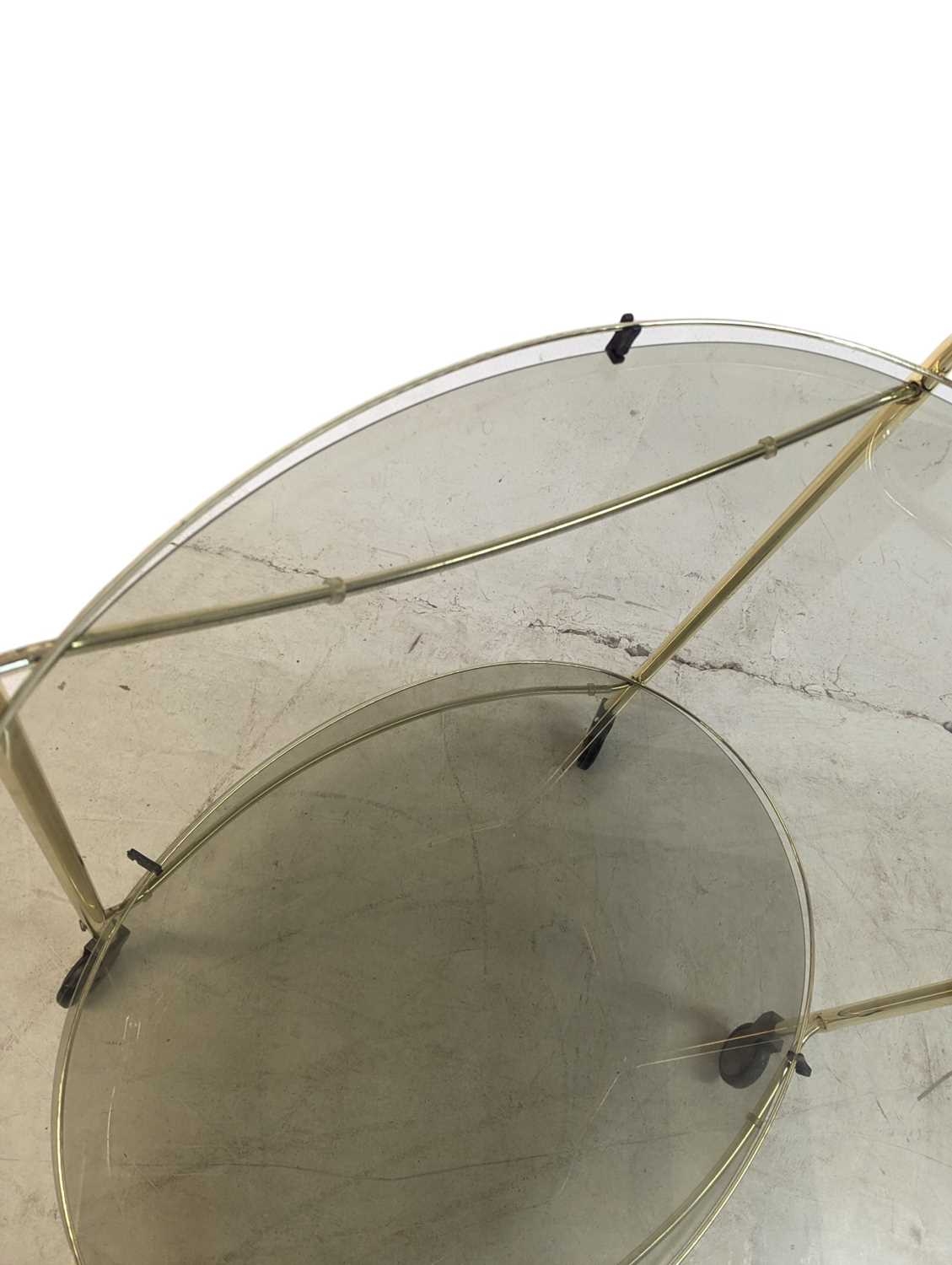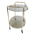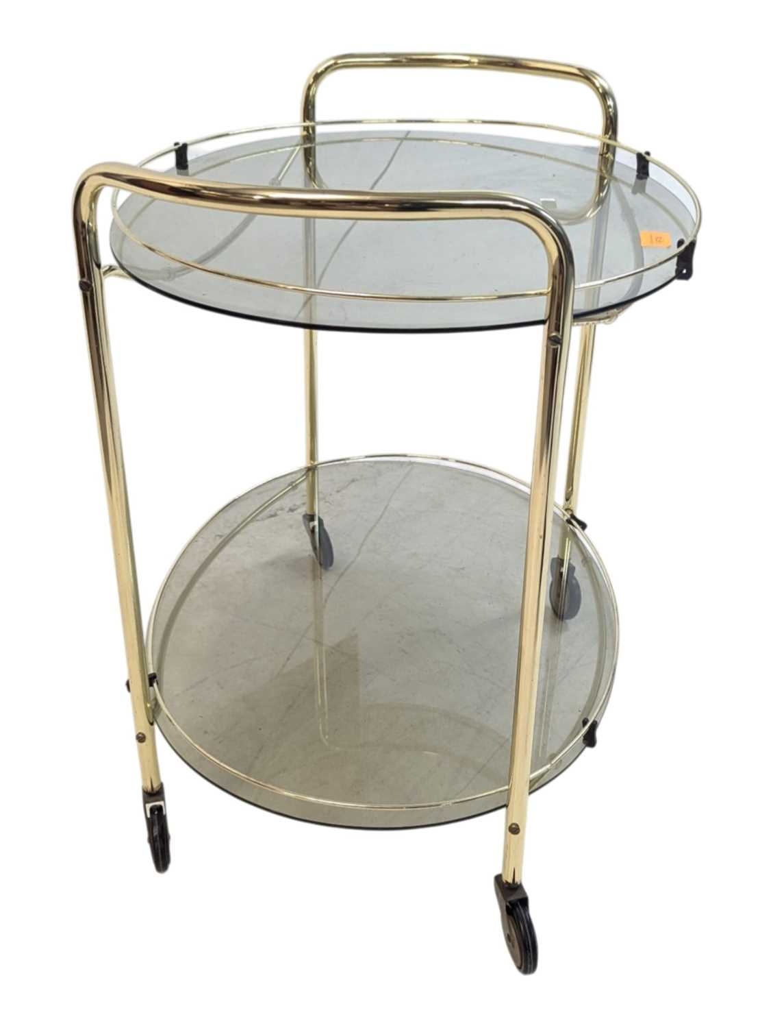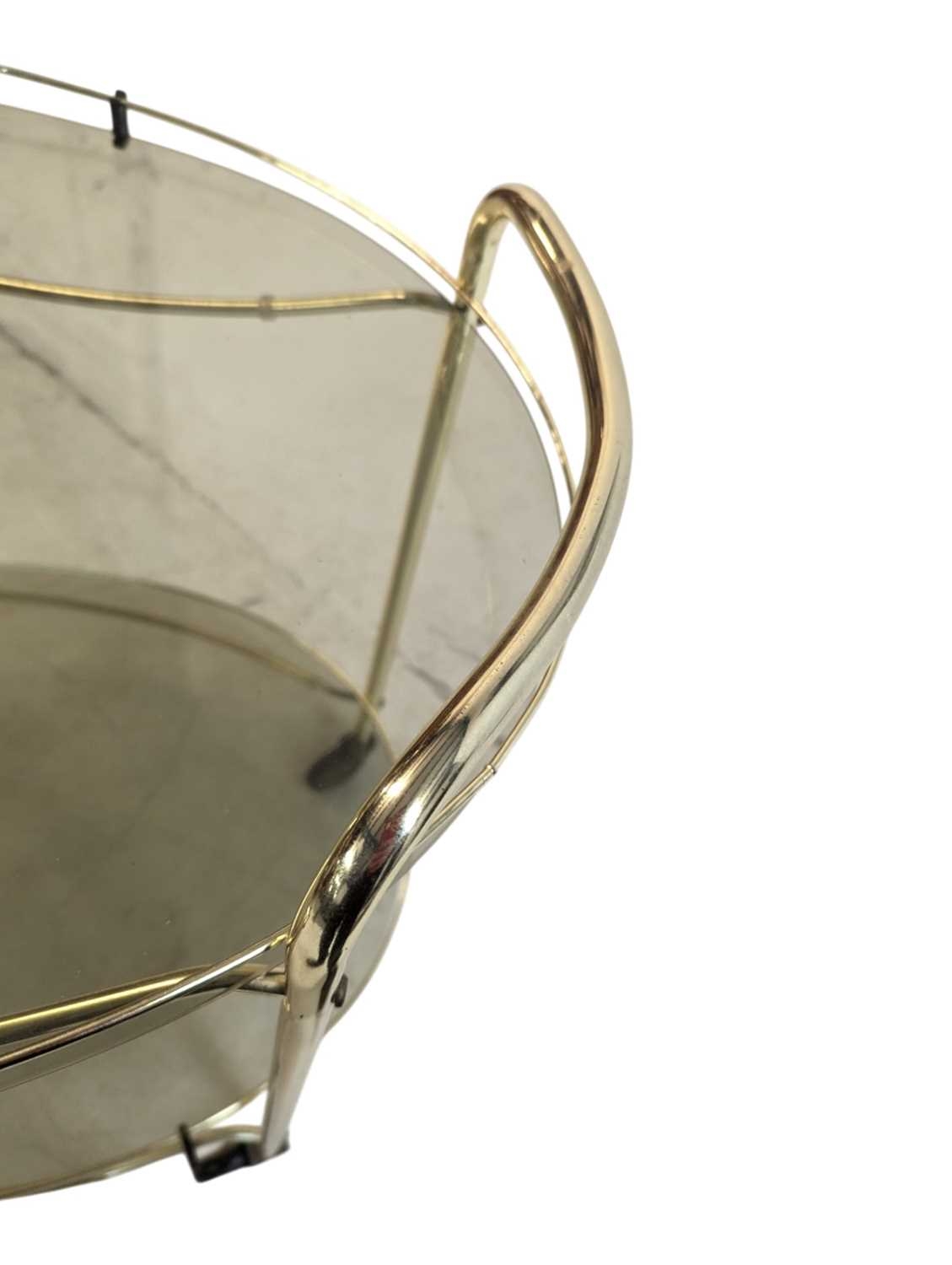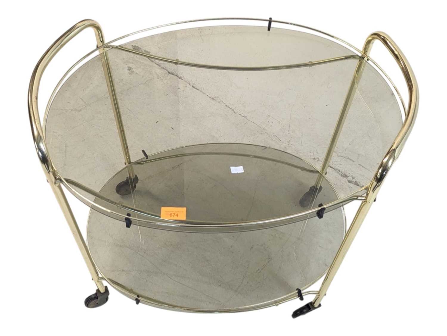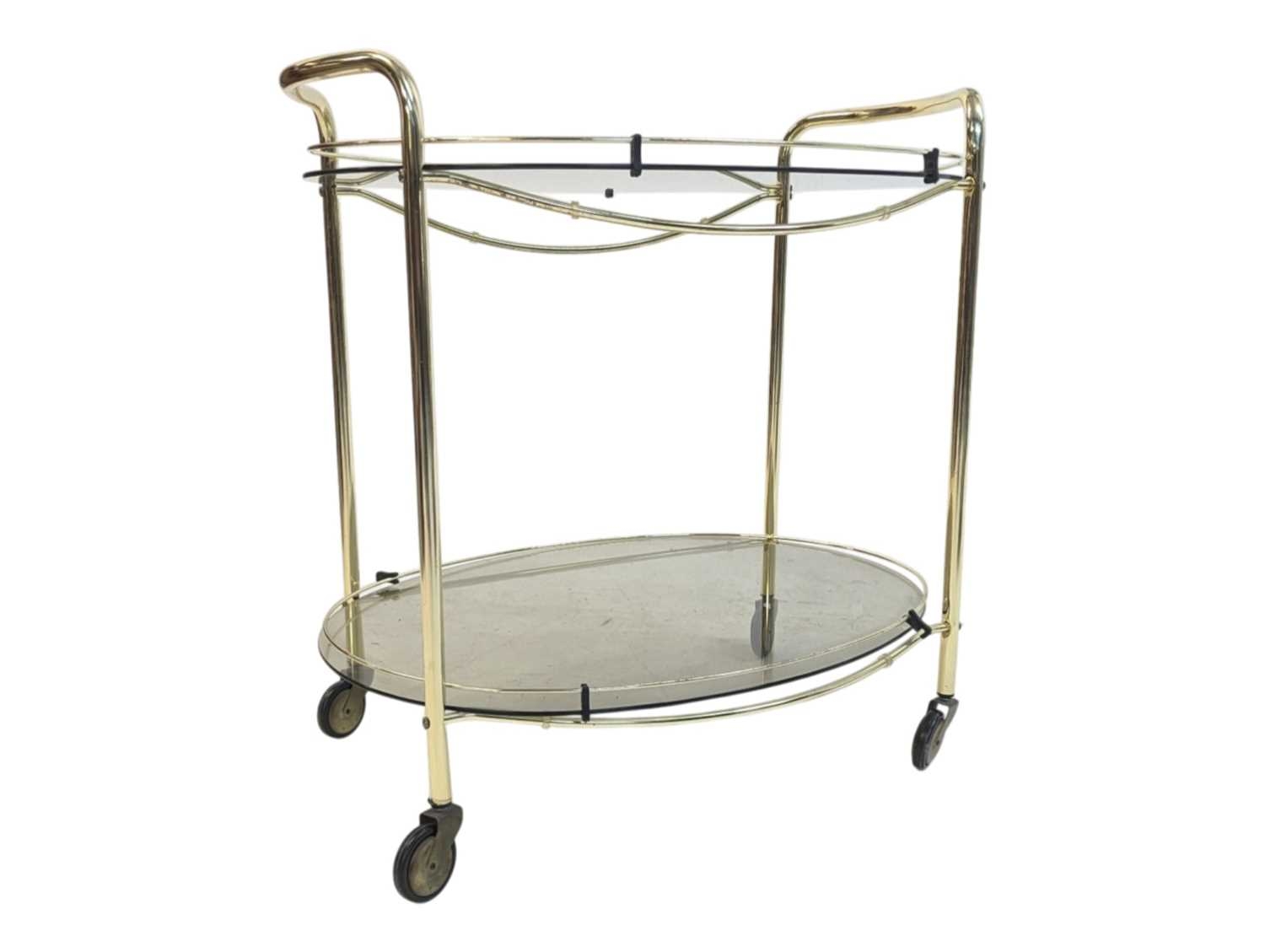 A contemporary brass and smoked glass drinks / hostess trolley in the Art Deco style. Having gilt tubular frame and smaked glass oval shelves, all raised over castors. Measures approx: 63x63x48cm