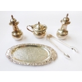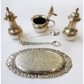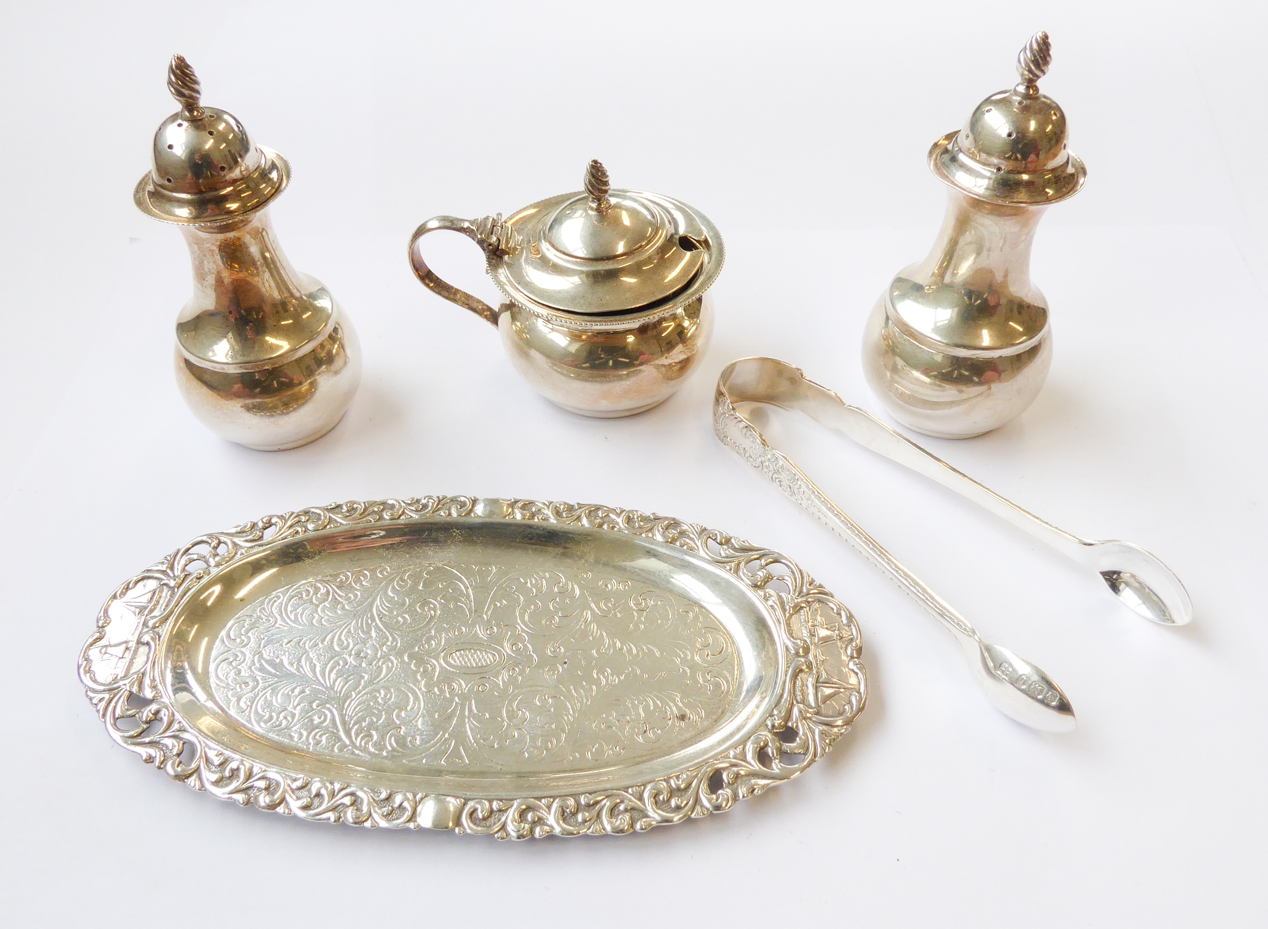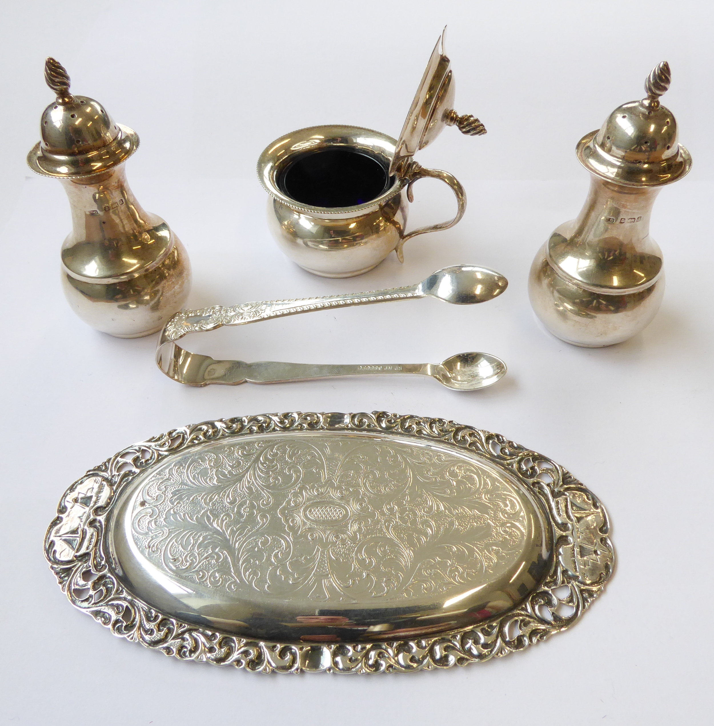 a pair of baluster-shaped hallmarked silver pepperettes and matching mustard with blue-glass liner;