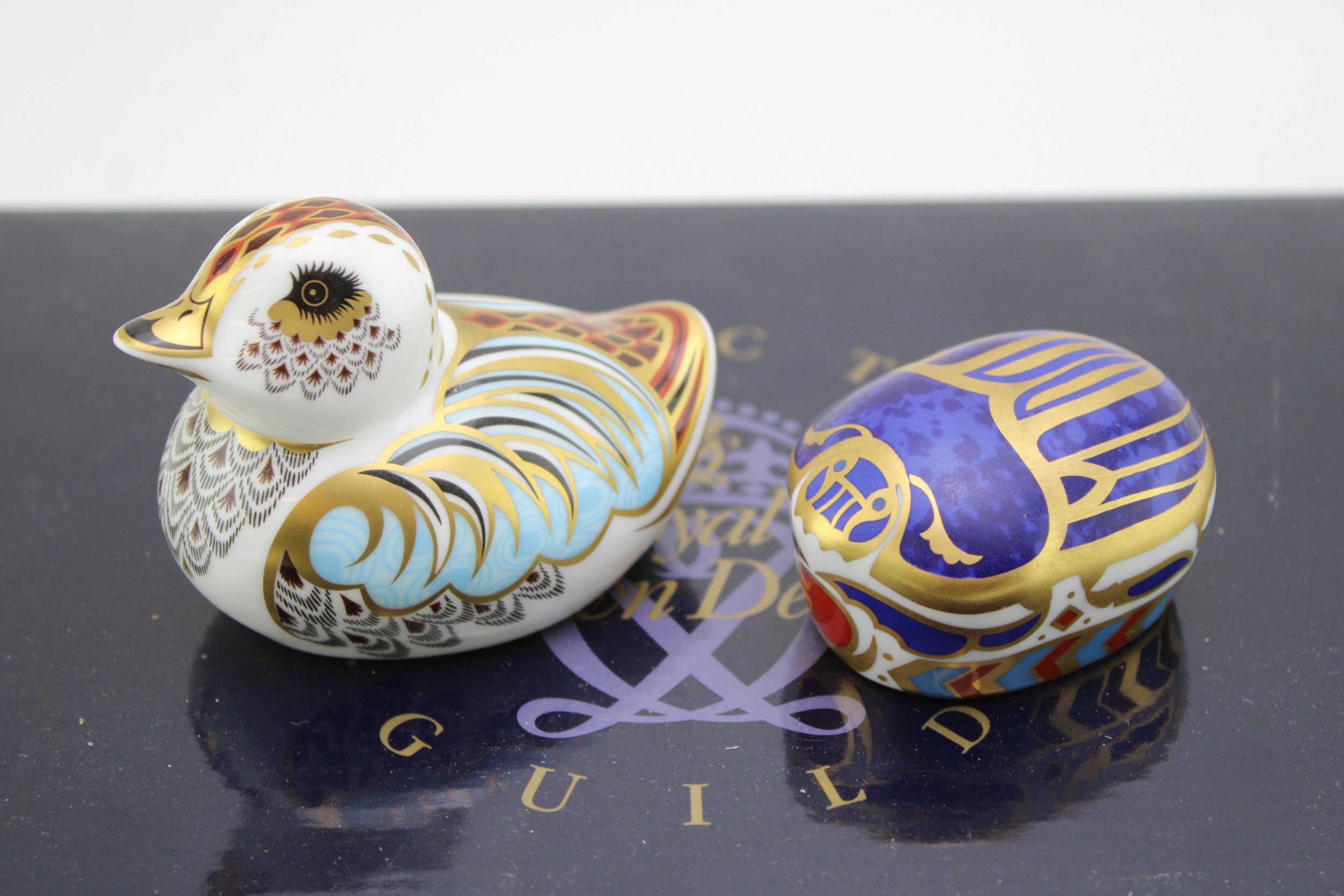 Boxed Royal Crown Derby paperweights to include a duckling and a millennium bug, first quality (2).