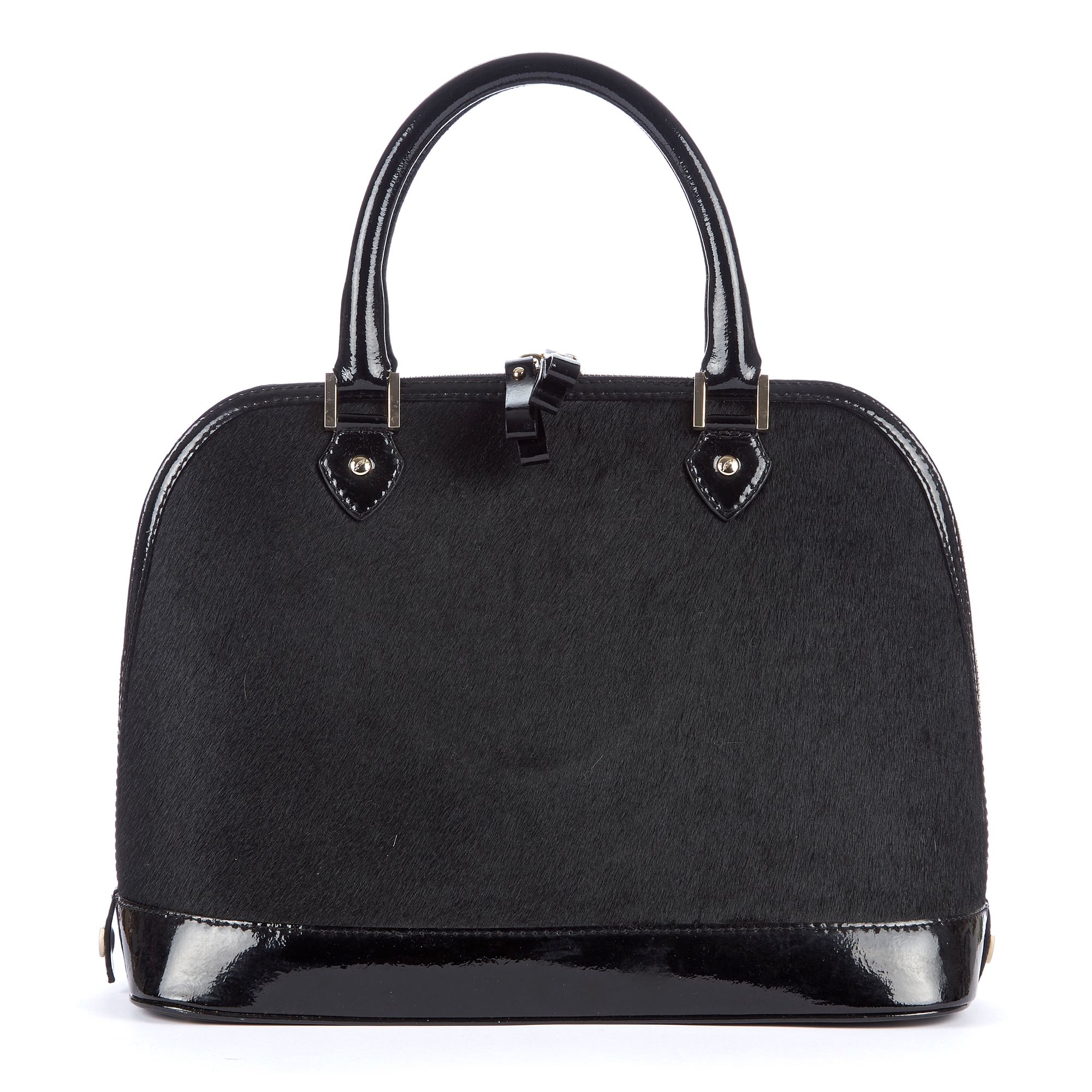 Aspinal of London, a Hepburn handbag, designed with a black pony hair exterior and black patent leather trim, with polished gold-tone hardware, rolled leather top handles, double wraparound zip fastening and a red grosgrain lined interior, measuring 17 by 26 by 33, with maker's dust bag