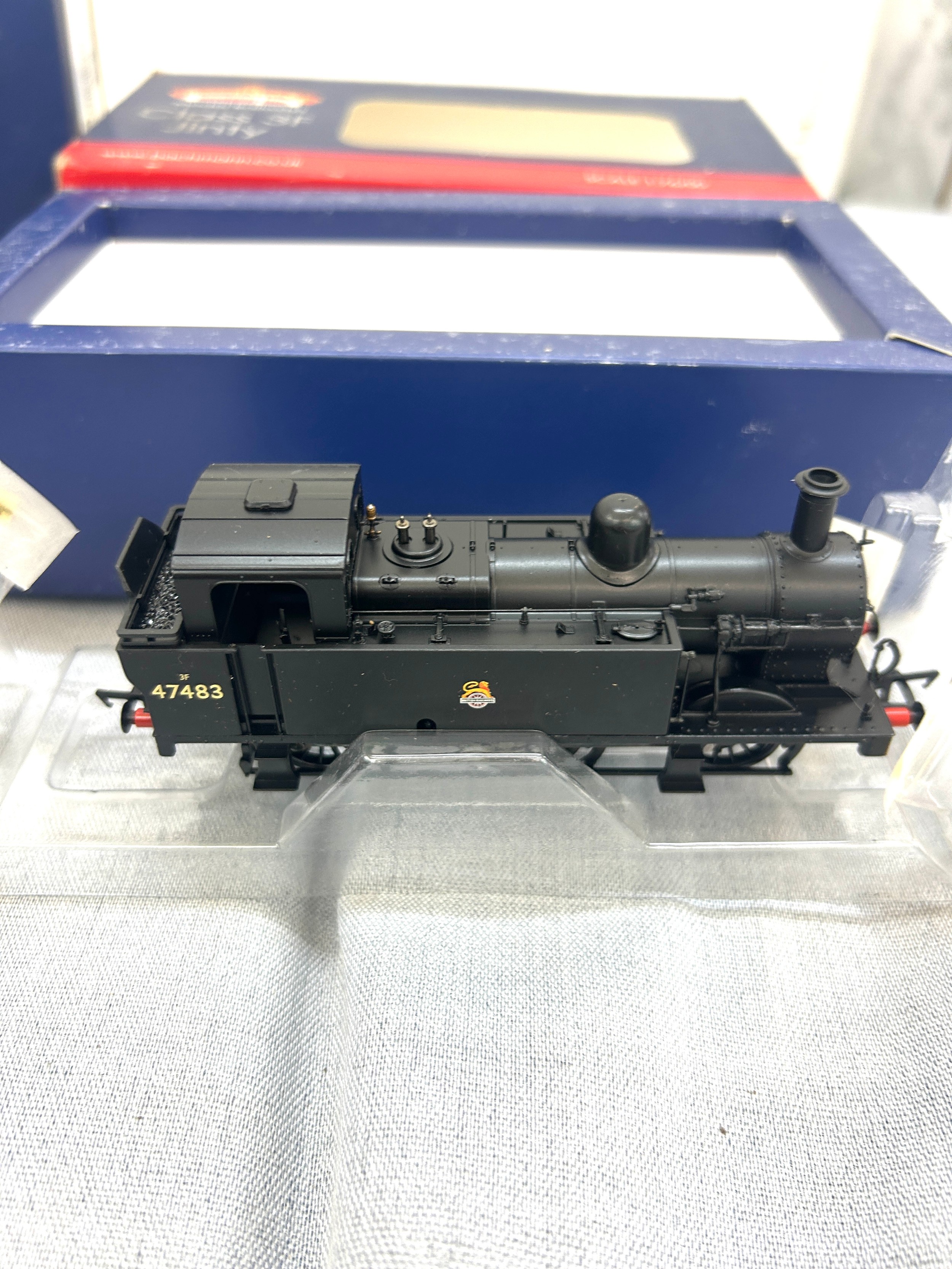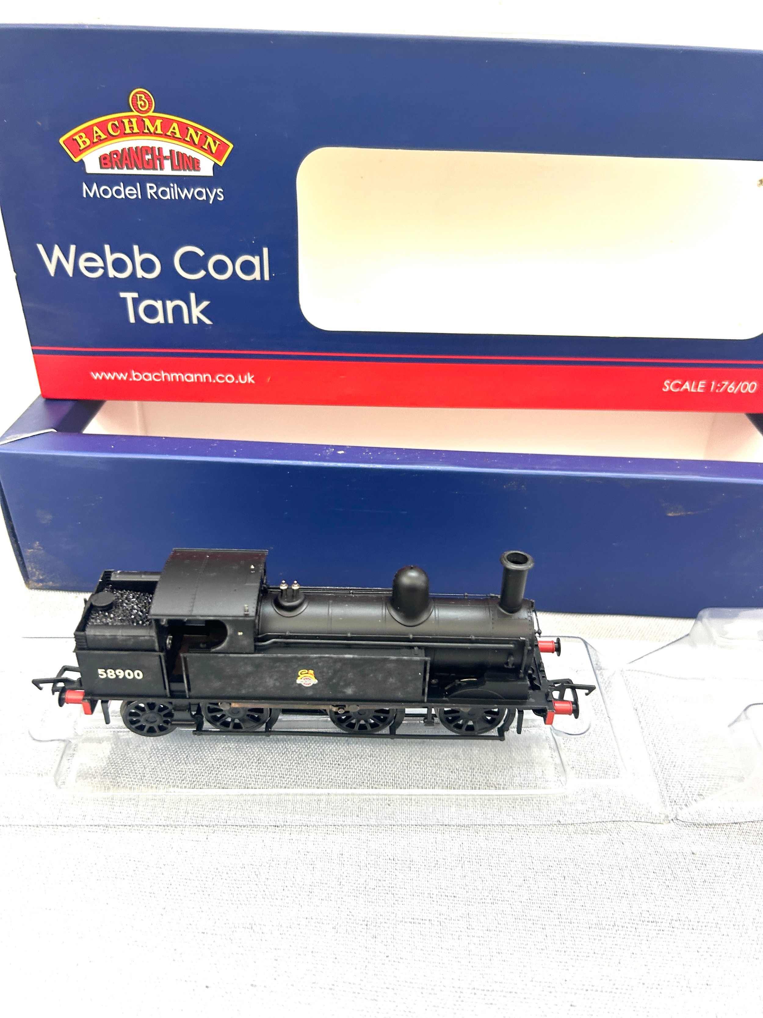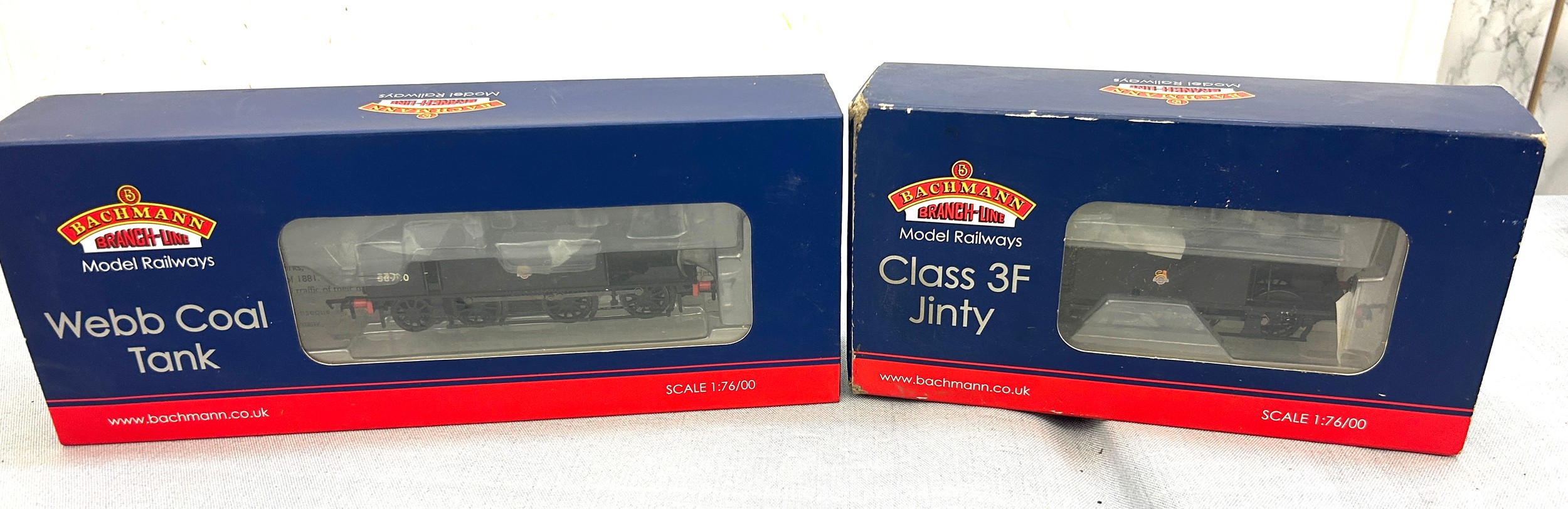 Boxed Bachmann Branch-line Class 3F Fowler Jinty 47483 BR Black early emblem, LNWR Webb Coal tank 58900 BR black early emblem, both have damp damage to boxes