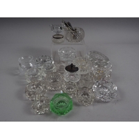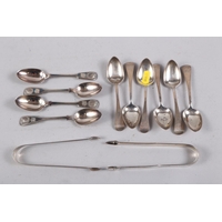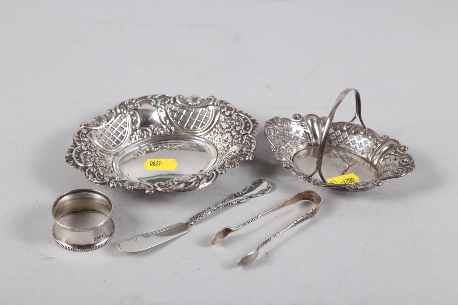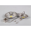 A silver bonbon dish with pierced and embossed decoration, a similar dish with handle, a napkin ring, a pair of sugar tongs and a butter knife, 4.1oz troy approx
