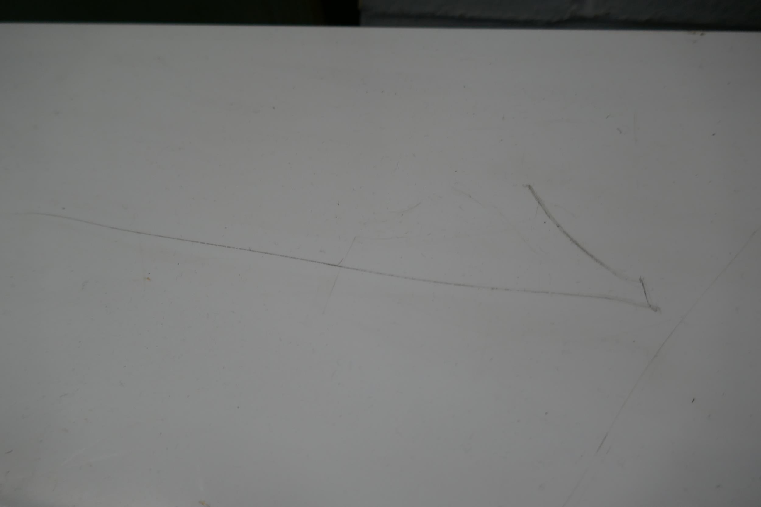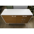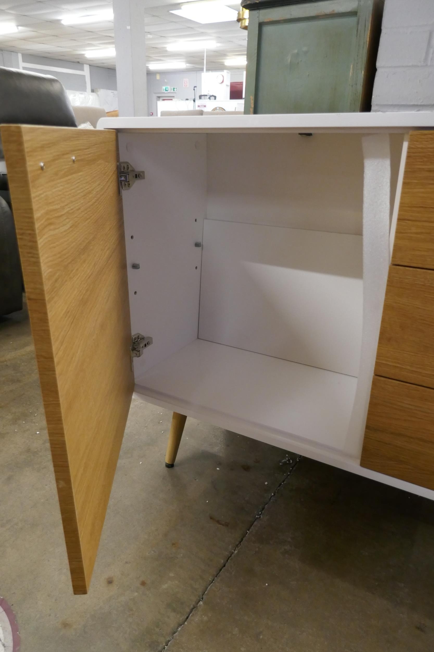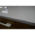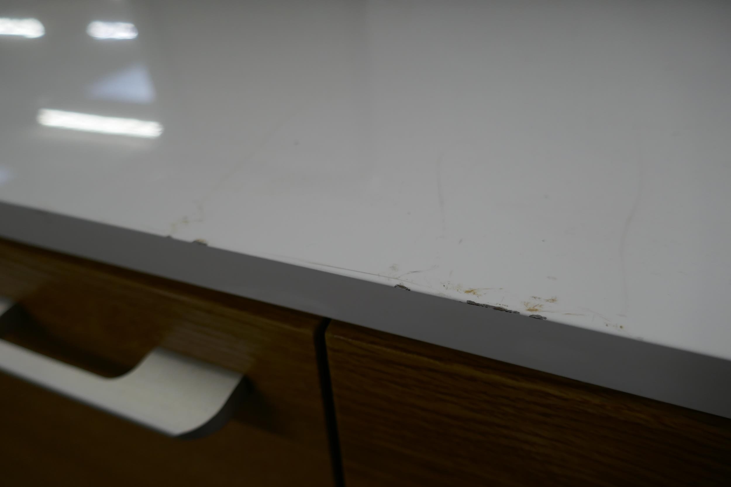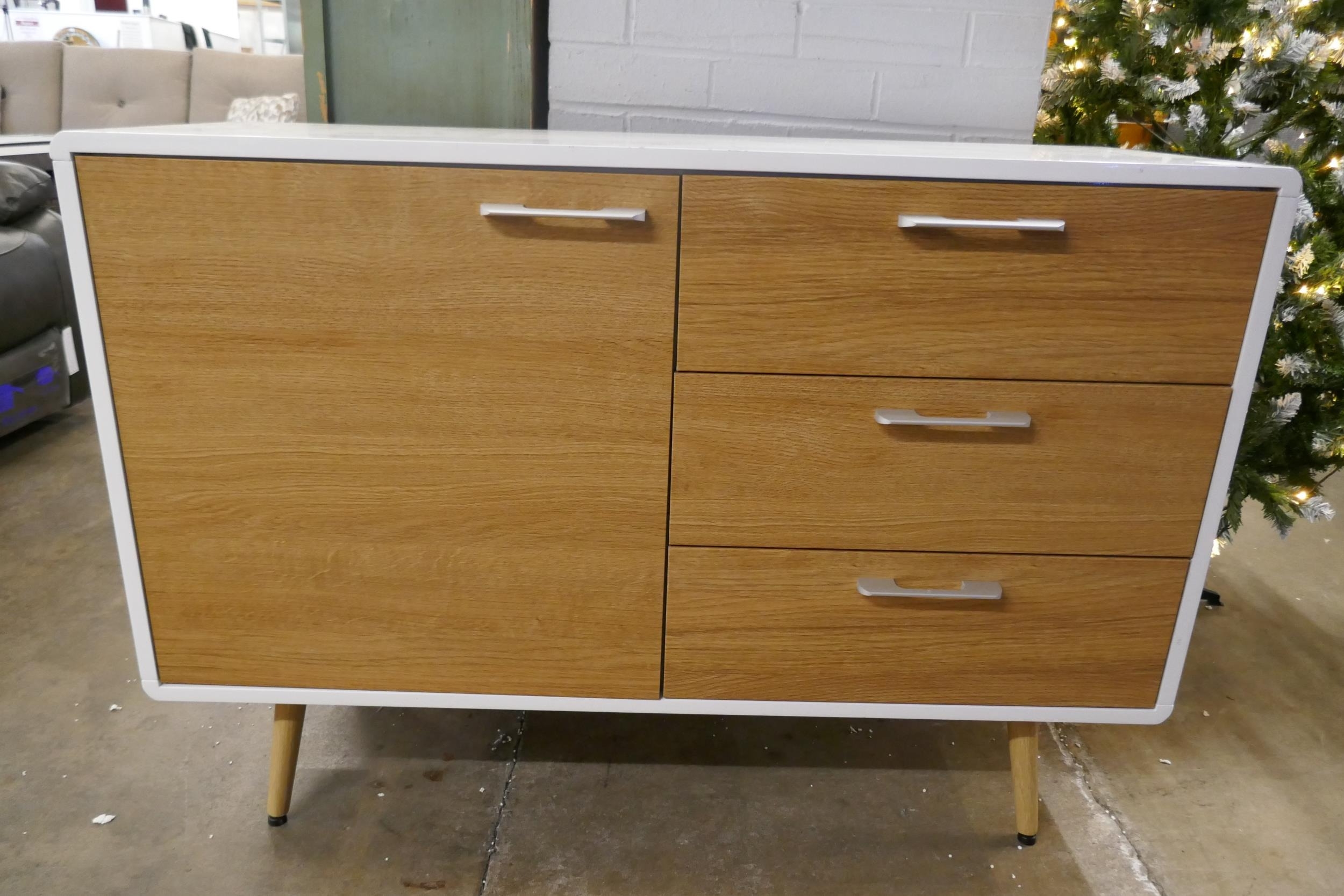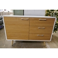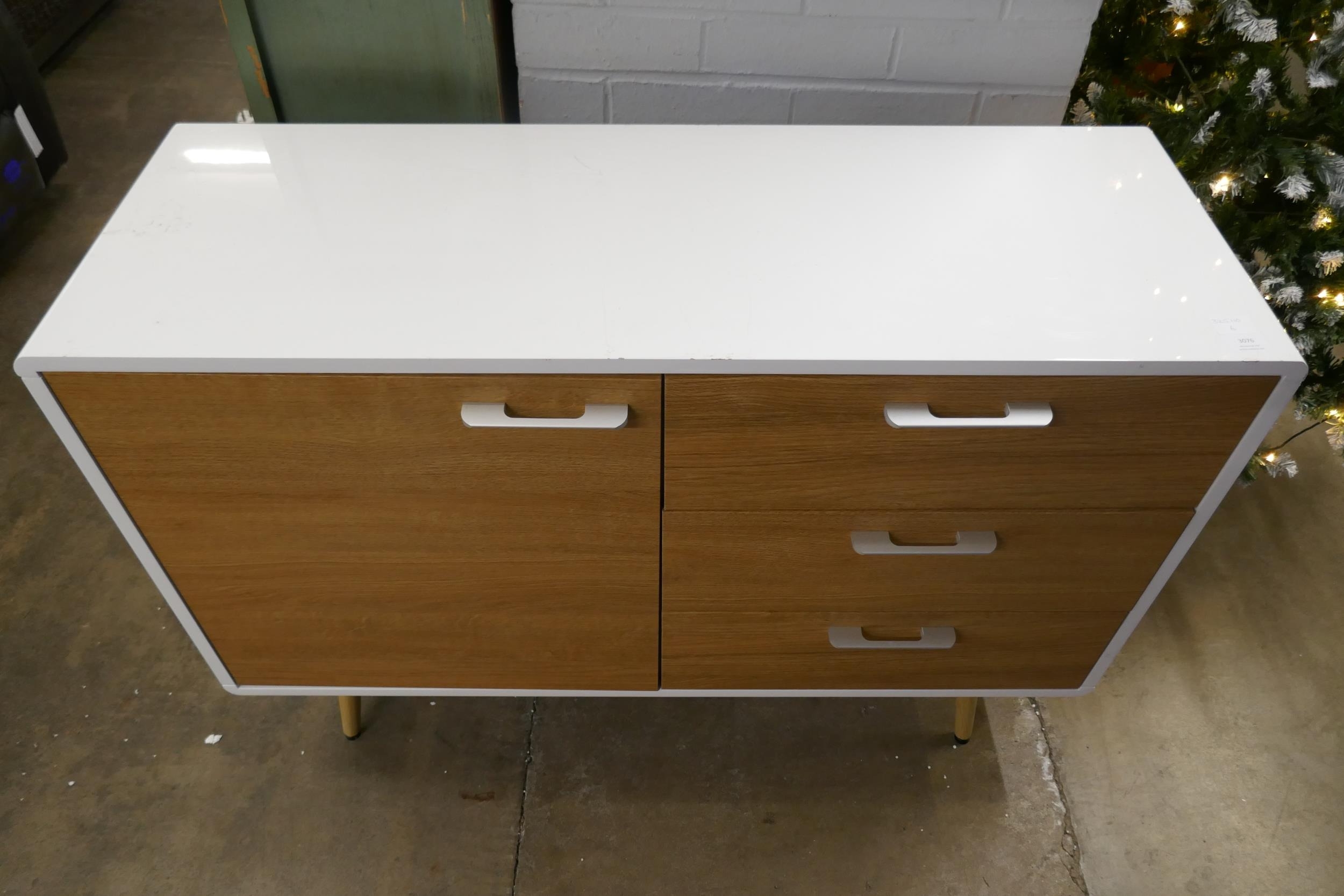 A white high gloss single door, three drawer sideboard (marked top)