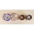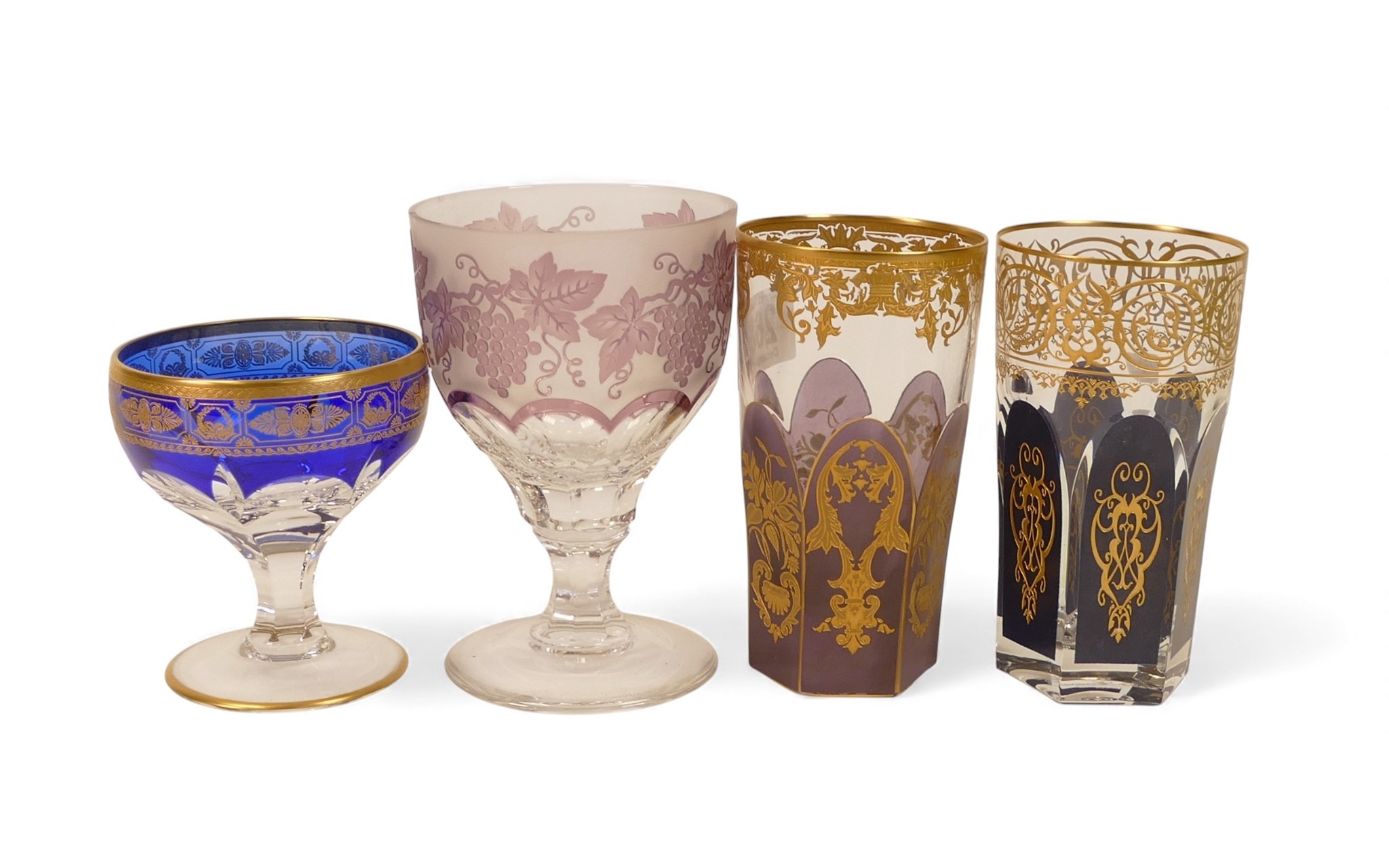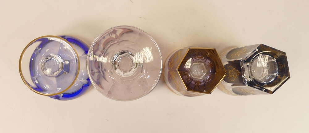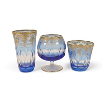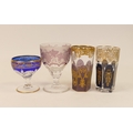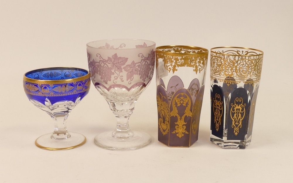 De Lamerie Fine Bone China Glass Tumblers, Champagne Glass and Wine Goblet, coloured and heavily gilded with various designs. Made in England. (4)
