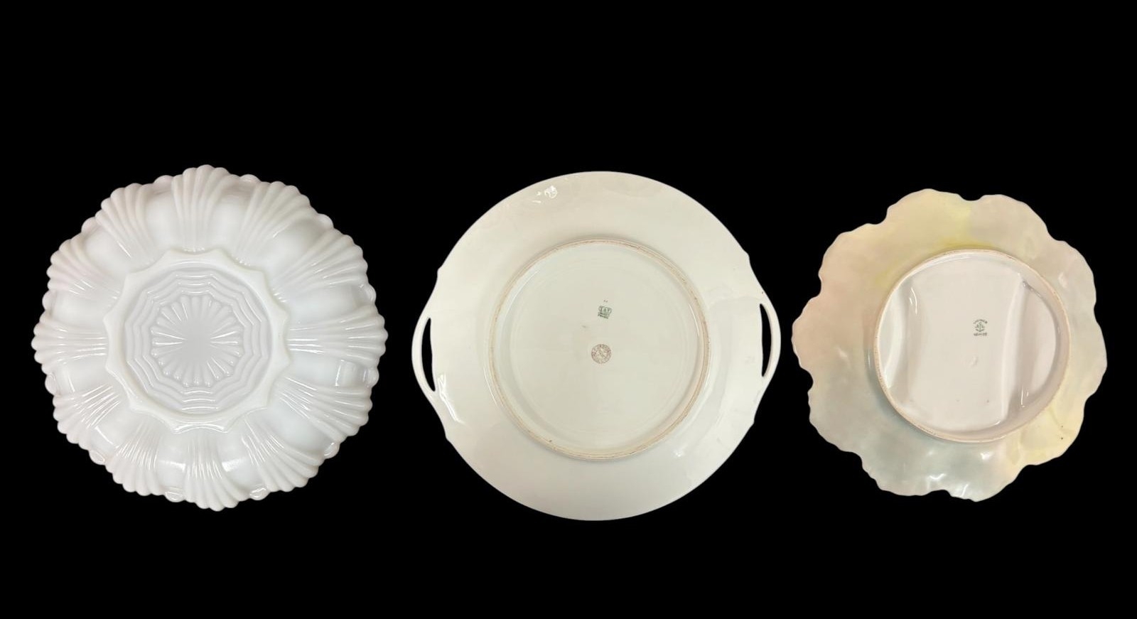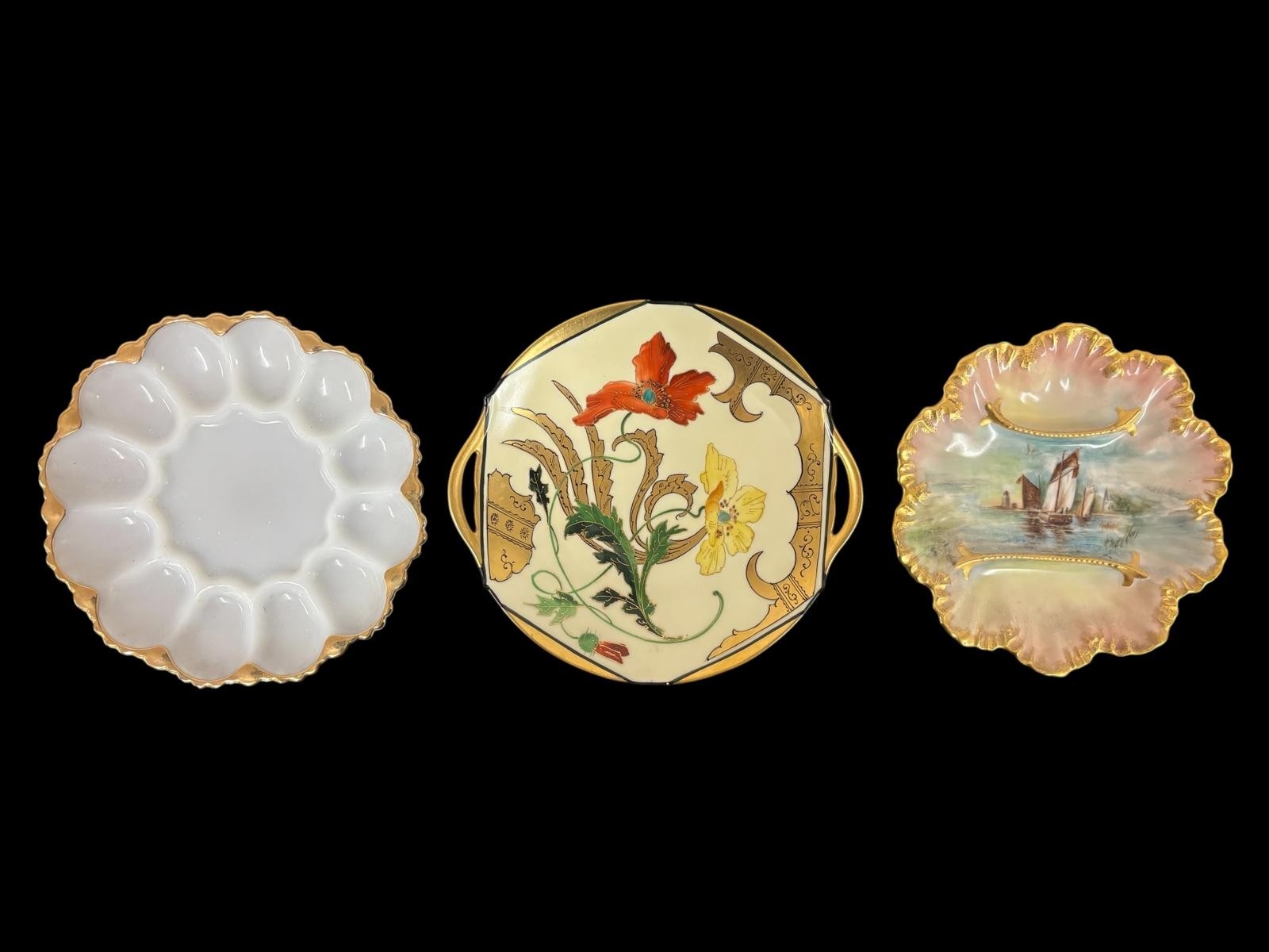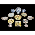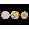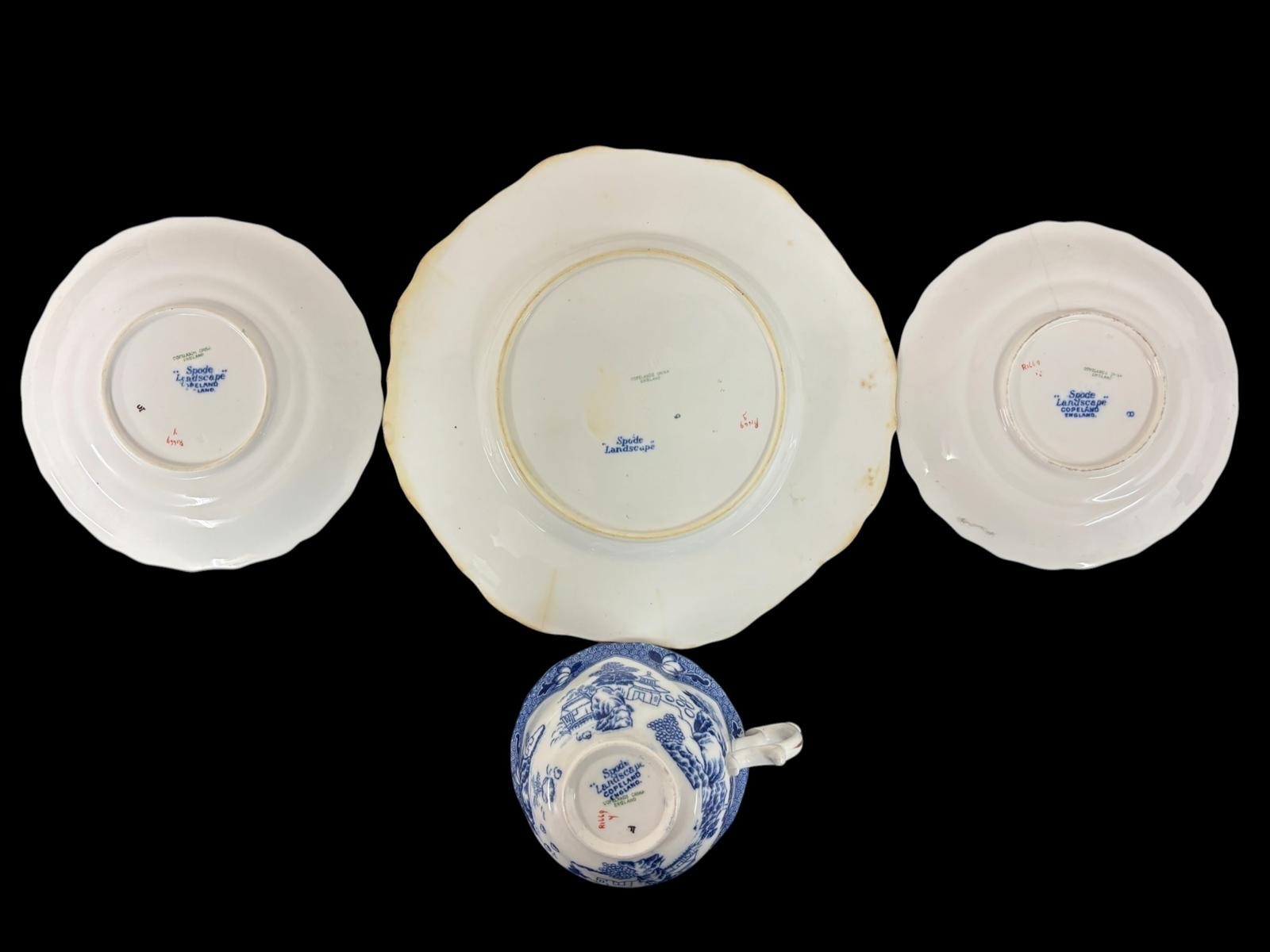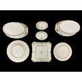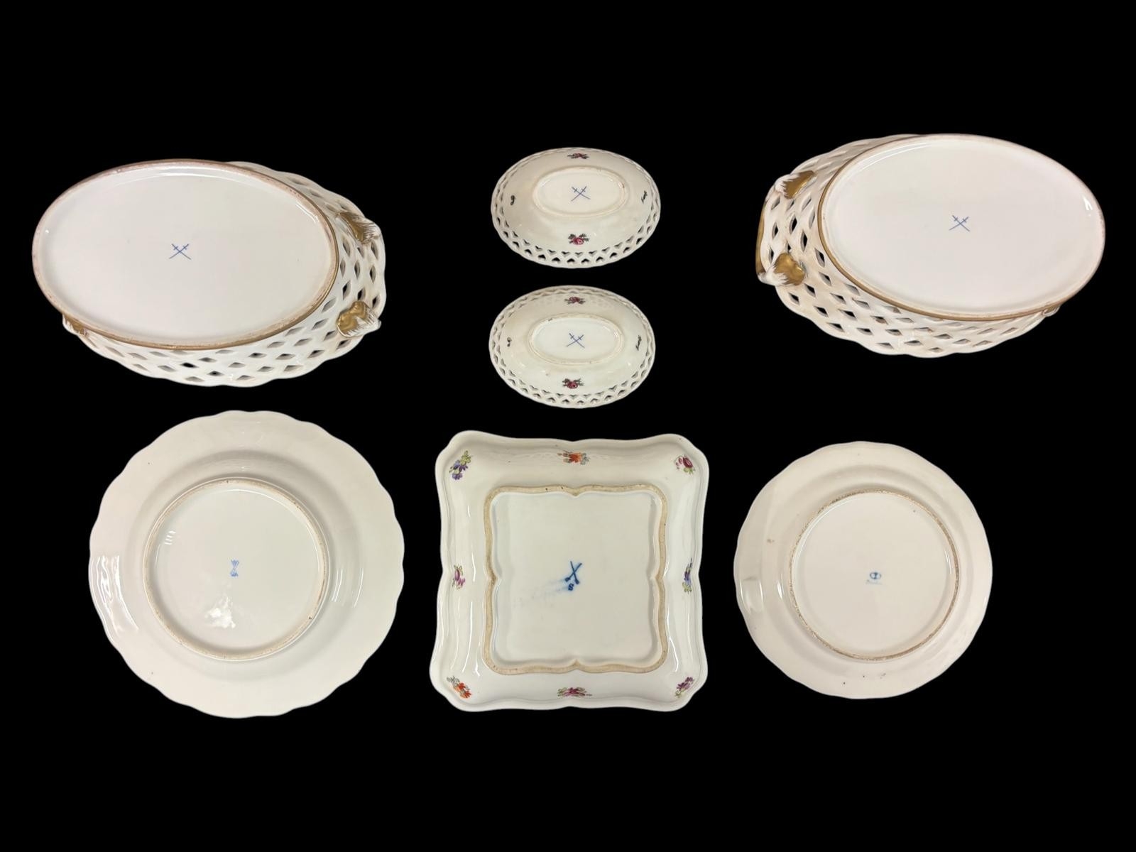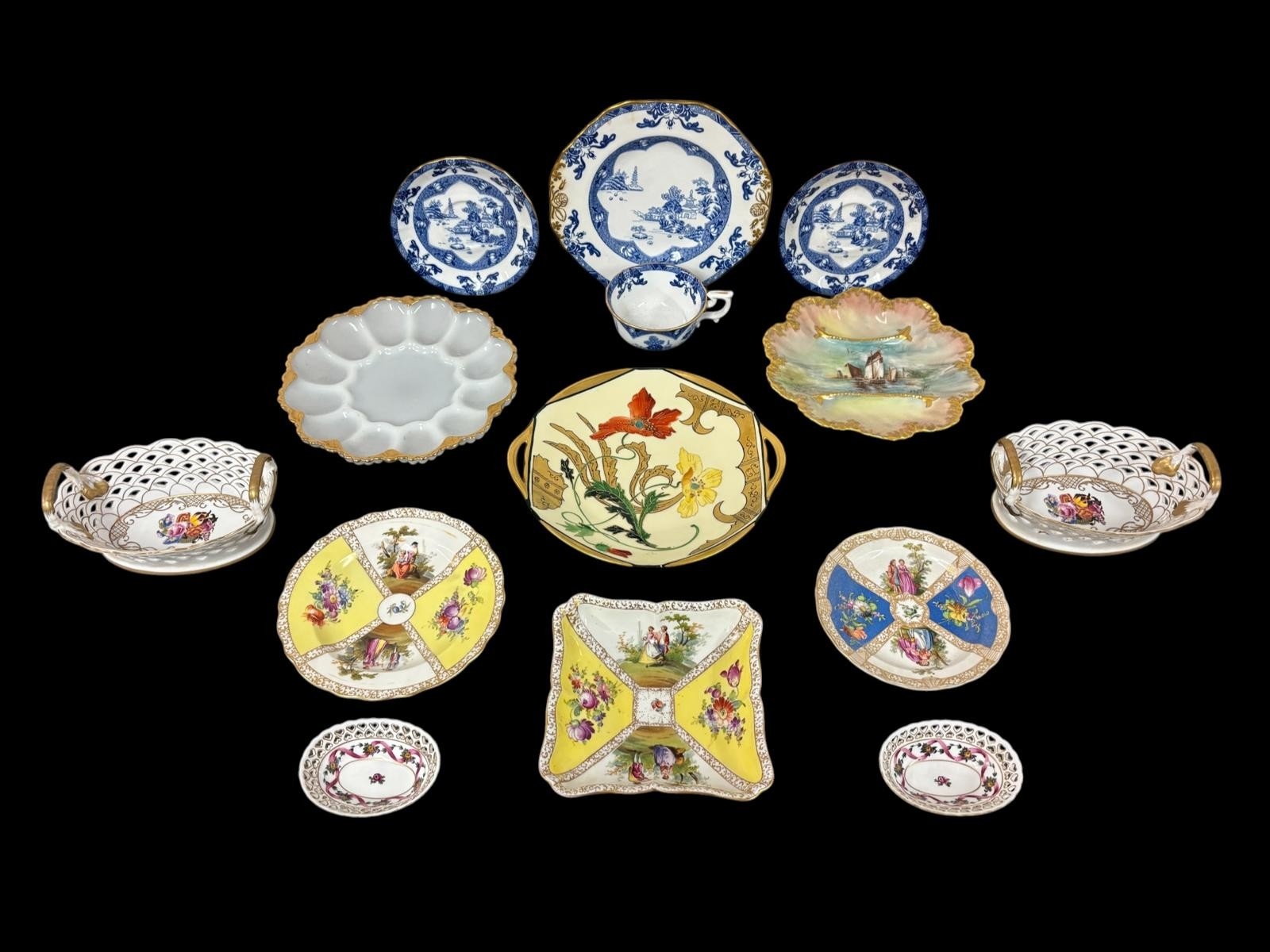 A COLLECTION OF FINE CONTINENTAL AND ENGLISH PORCELAIN to include a matched pair of pierced double handled baskets with marks indicating Dresden, two parcel gilt Limoges plates and a similarly gilded milk glass plate, four pieces of Spode in the 'Landscape' pattern, etc. (AF) (14)