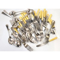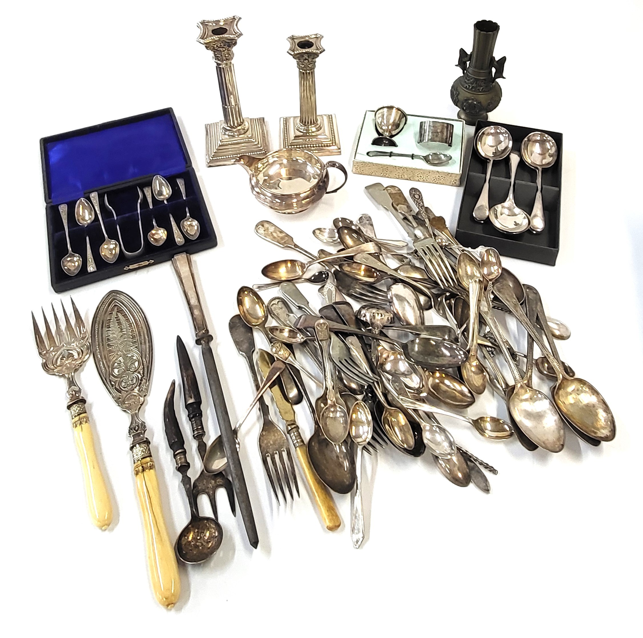 A large quantity of EPNS including flatware, candlesticks, boxed napkins, and a cream jug.