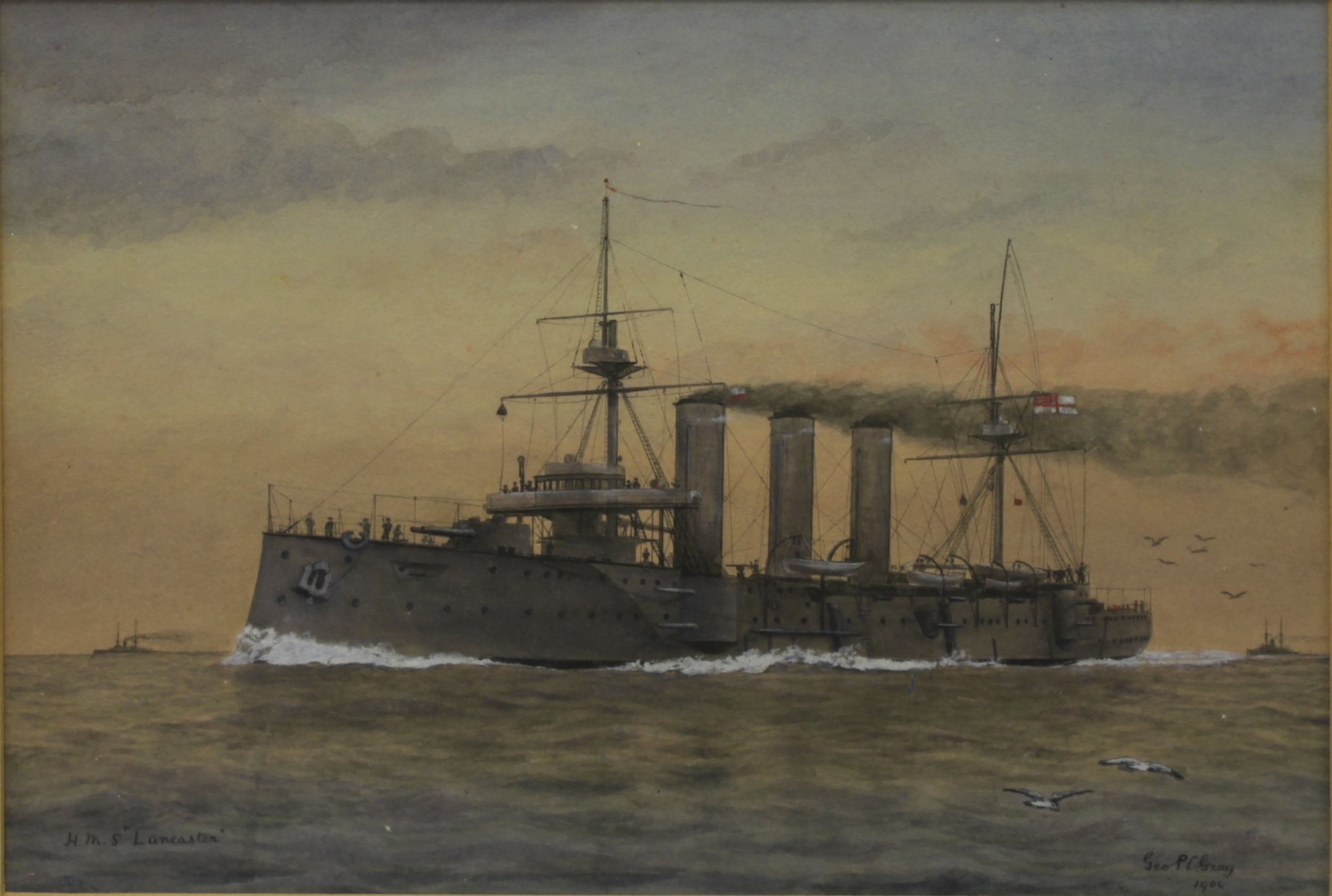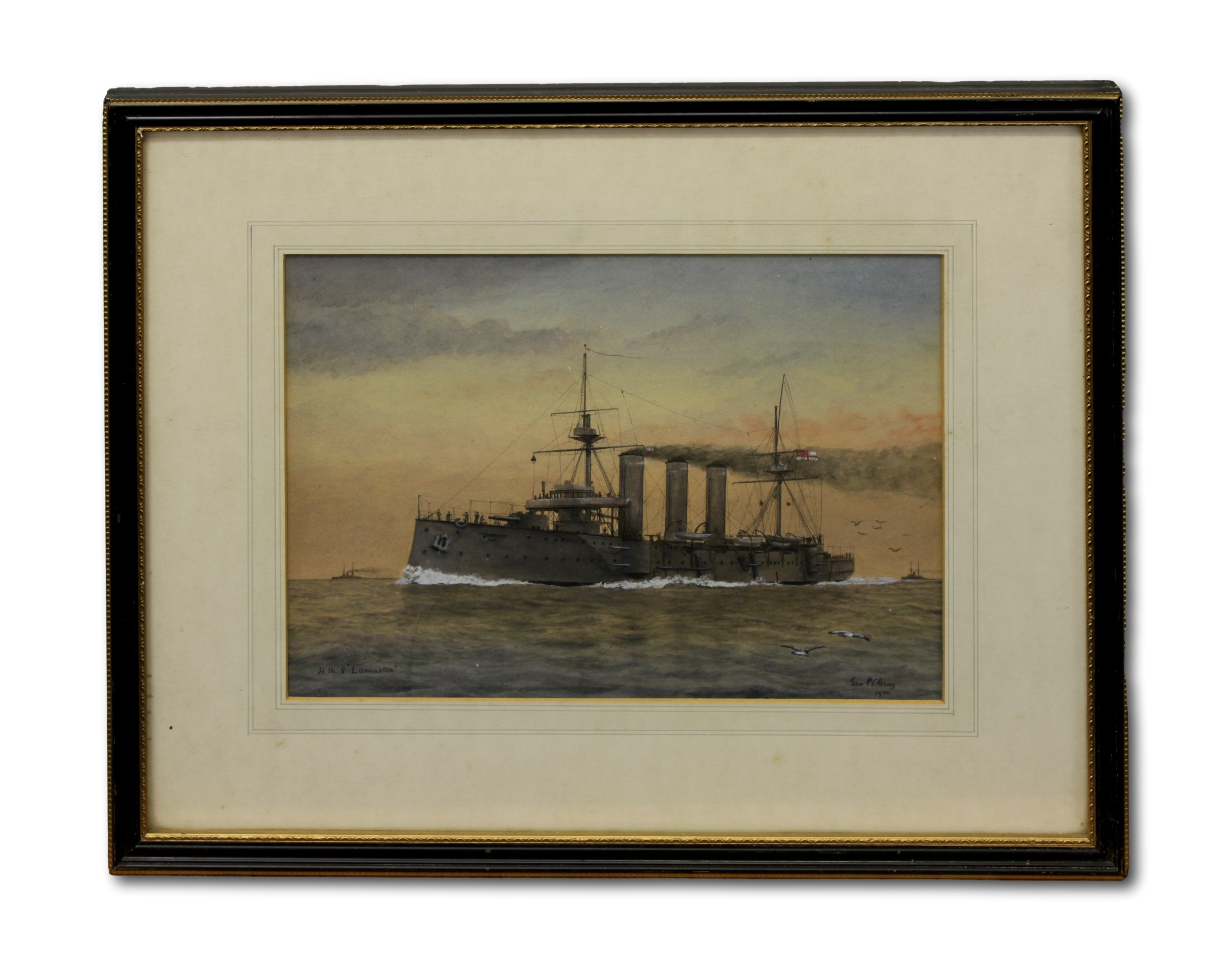George Gray (British, 20th Century), "H.M.S Lancaster"Signed, inscribed and dated 1904, watercolour heightened with white, 23.5cm x 33cm