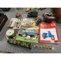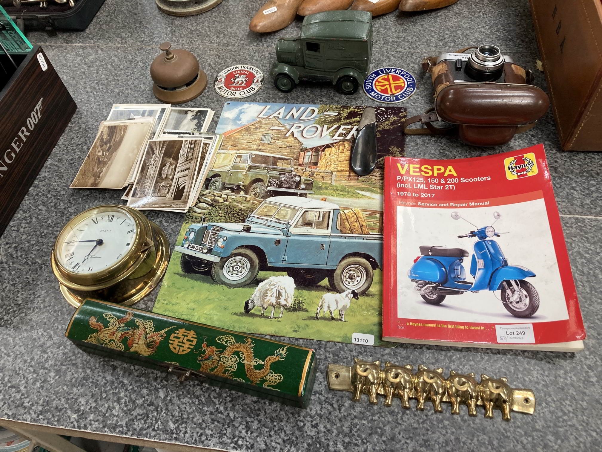 Collectables inc. cast vehicle, postcards, brass Kienzle clock, brass Pig key hooks, brass desk bell, cased Voigtlander Vitoret Prontor 125 camera, Haynes Vespa manual etc.
