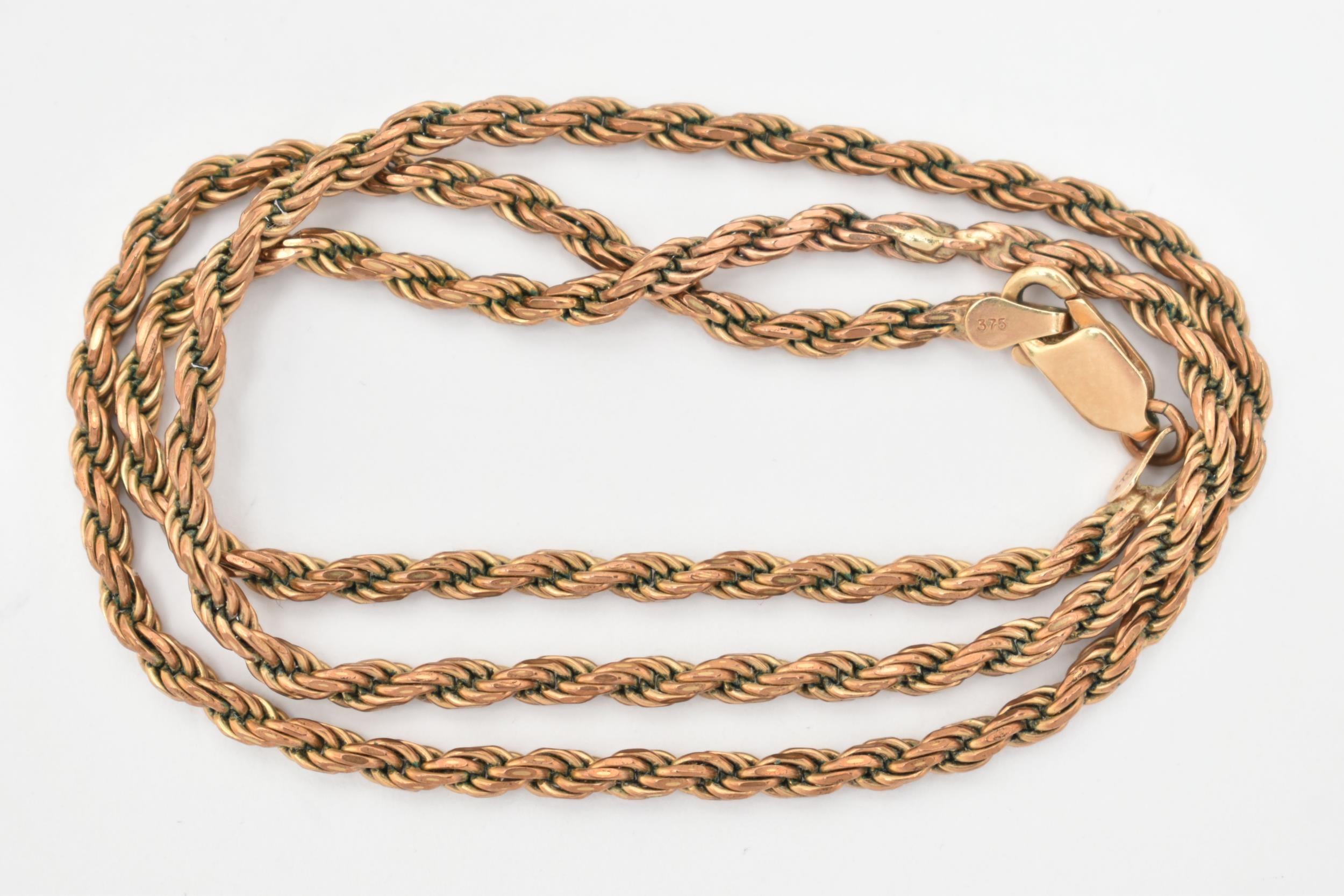 A 9CT GOLD CHAIN NECKLACE, a yellow gold rope chain, fitted with a lobster clasp, approximate length 455mm, hallmarked 9ct Birmingham import, approximate gross weight 12.6 grams, (condition report: general moderate wear, overall condition good)