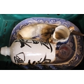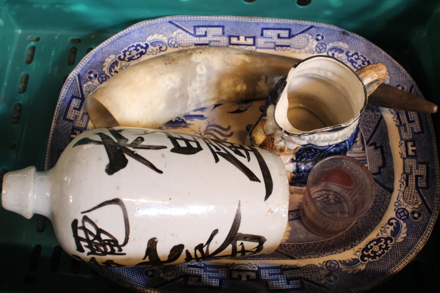 Chinese Pottery Vase with applied character writing, Large Blue and White meat plate, Toby Jug, etched glass and a drinking horn