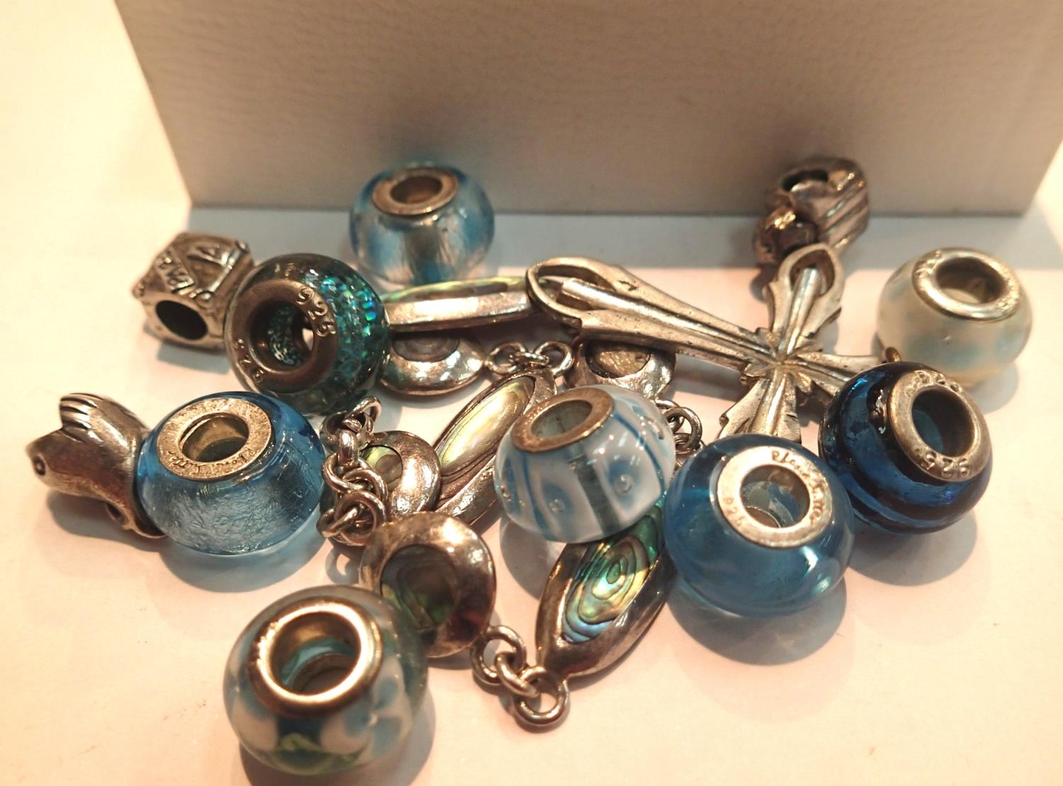 Ten 925 silver and silver mounted charms with a silver and abalone bracelet. P&P Group 1 (£14+VAT for the first lot and £1+VAT for subsequent lots)