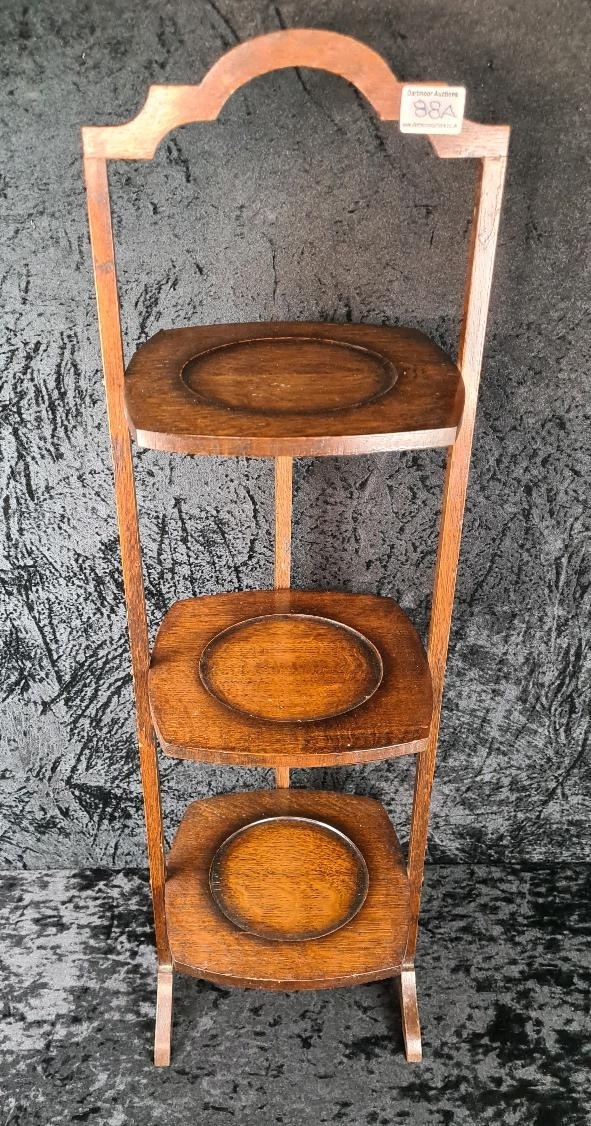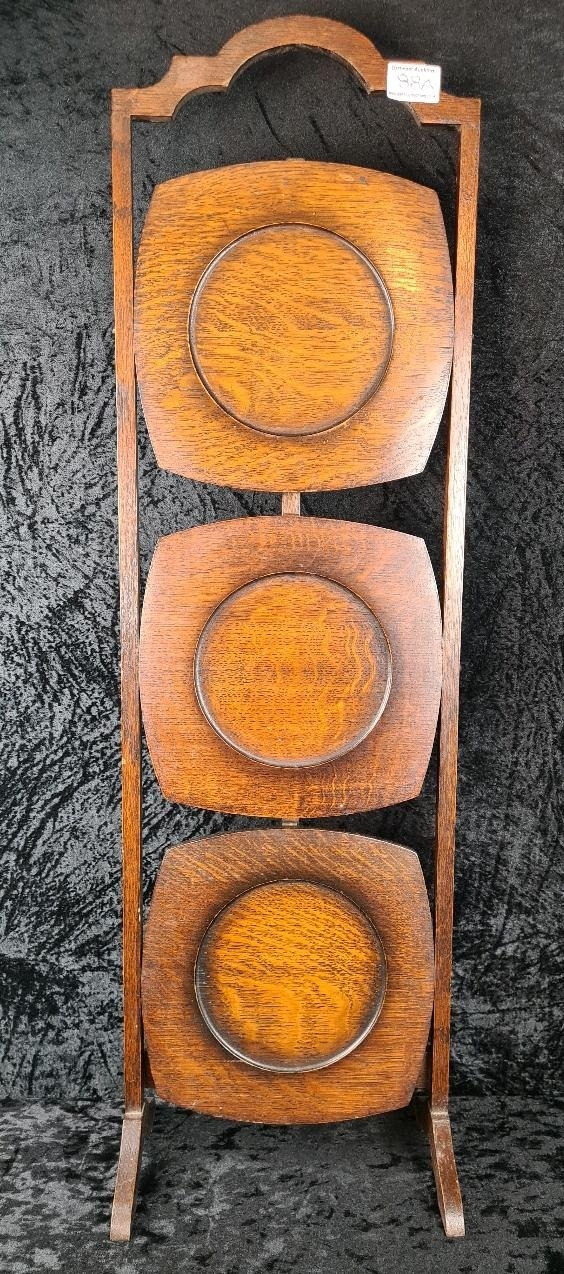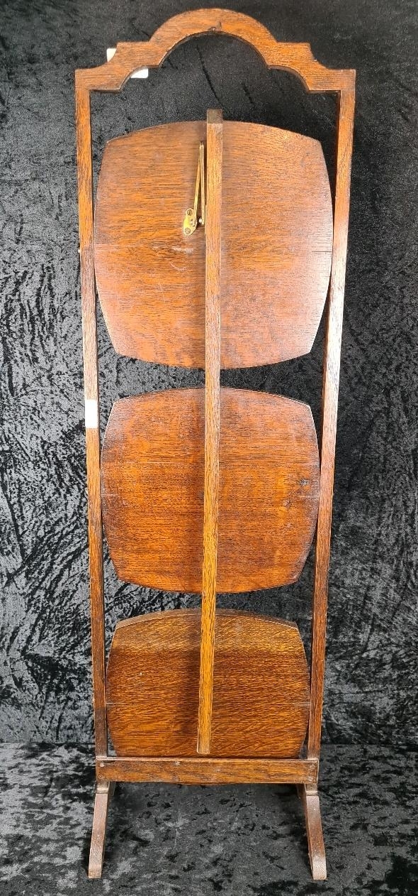 Antique Edwardian three-tier oak folding cake stand, can also be used to display houseplants. Approx H92cm.