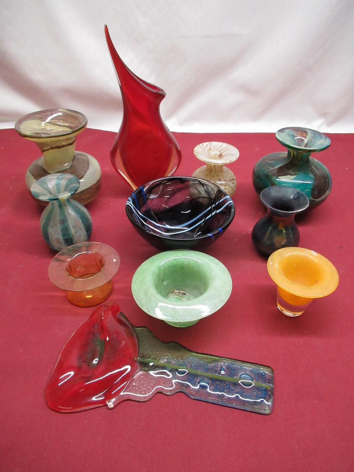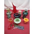 Murano Sommerso red glass vase H27cm, three Mdina glass vases and other art glass vases