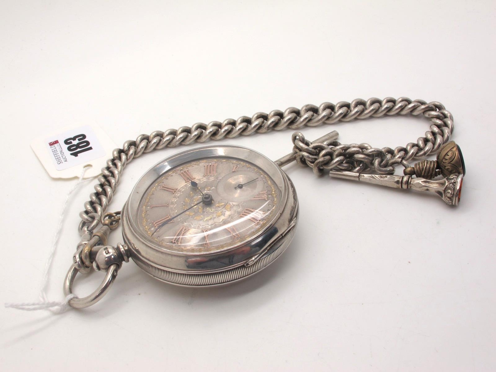 An Impressive Edwardian Hallmarked Silver Cased Openface Pocketwatch, the foliate dial with engine turned decoration, with italic Roman numerals and seconds subsidiary dial, the movement signed "L.Milrood" "Manchester", within engine turned case with vacant cartouche, Birmingham 1902, complete with a key; Together with A Graduated Solid Curb Link Albert Chain, suspending T-bar, decorative Pocketwatch key/seal and a seal fob pendant.