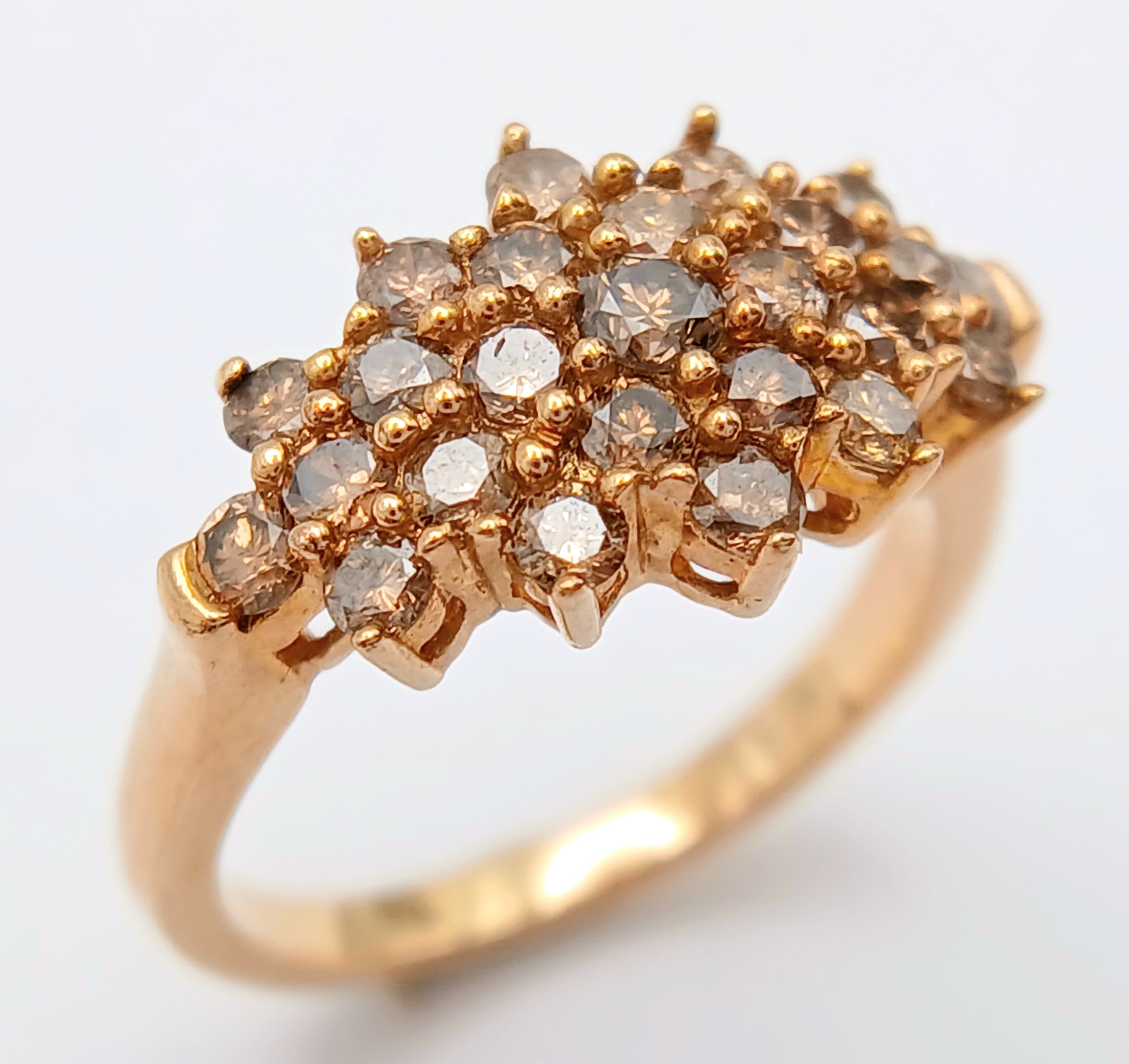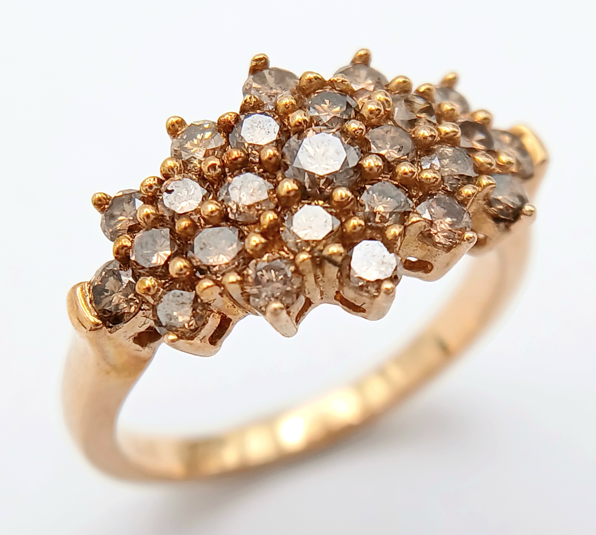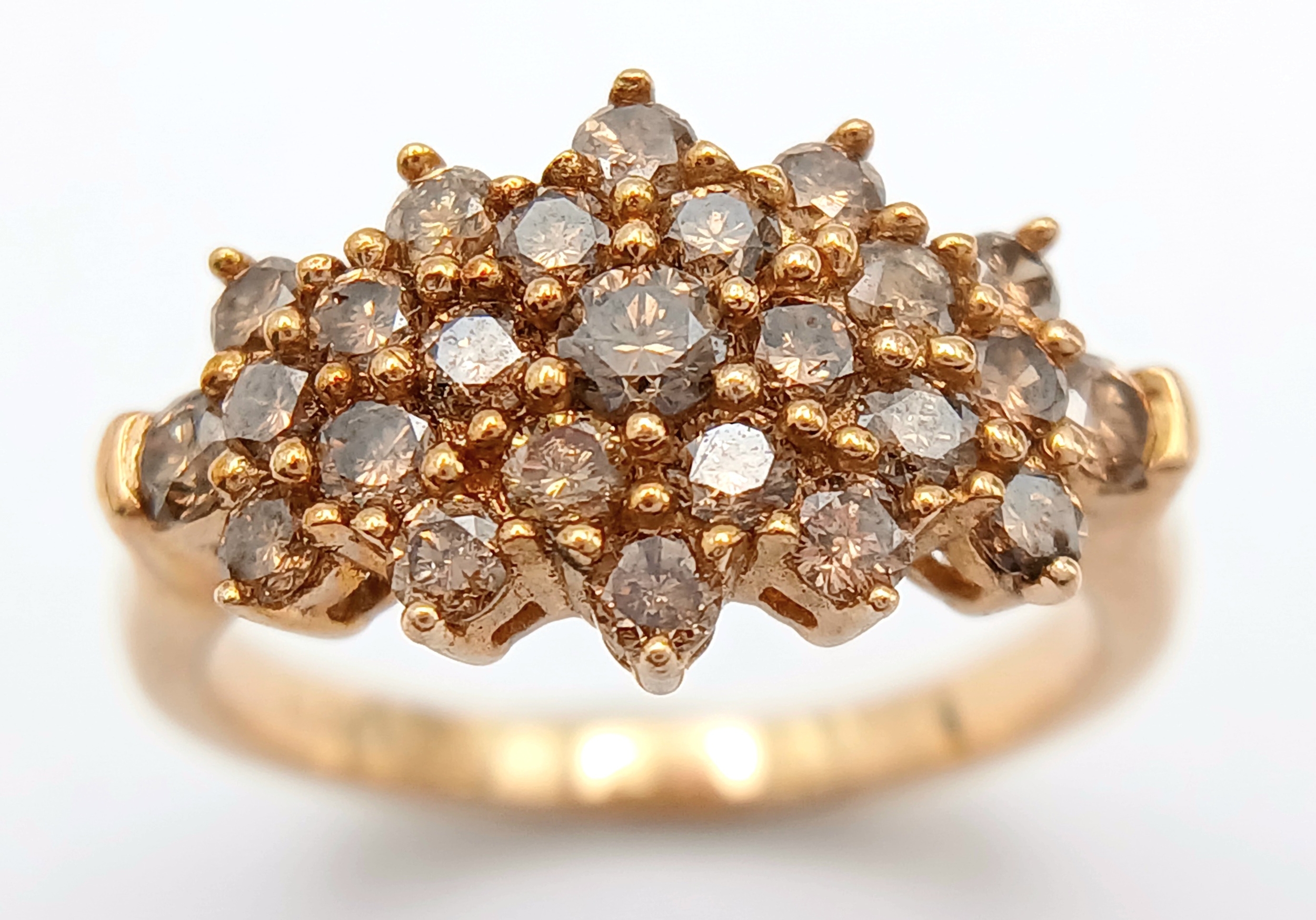 A STUNNING 9K YELLOW GOLD CHAMPAGNE DIAMOND SET CLUSTER RING, 0.50CT DIAMOND WEIGHT. TOTAL WEIGHT 3.3G. SIZE L. SC 9020