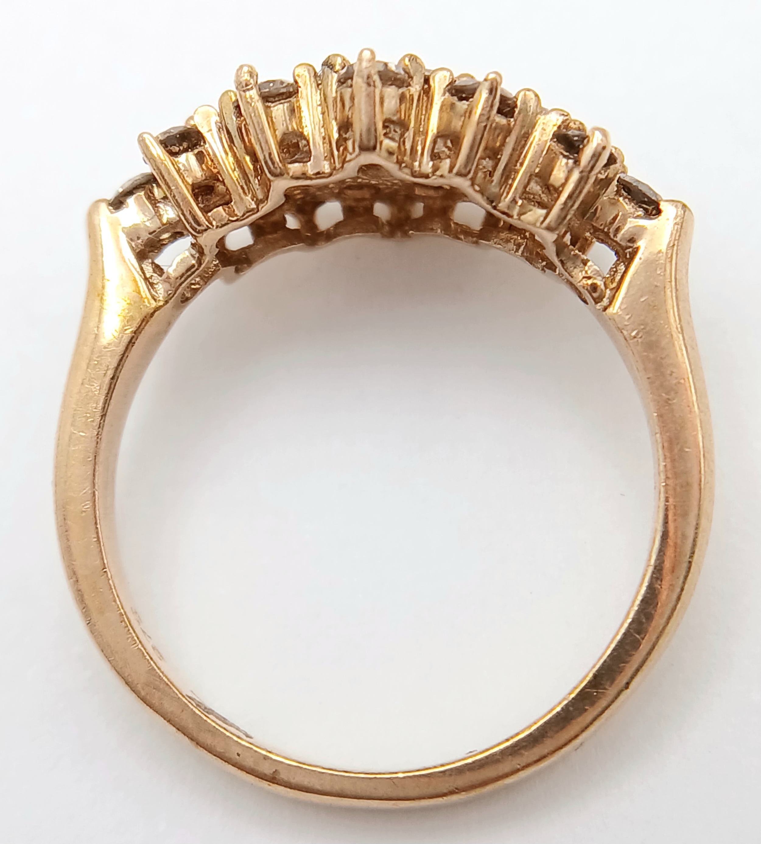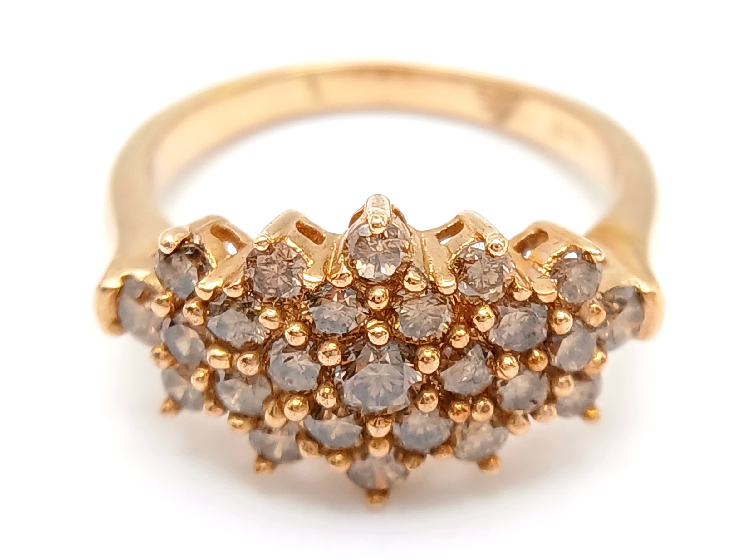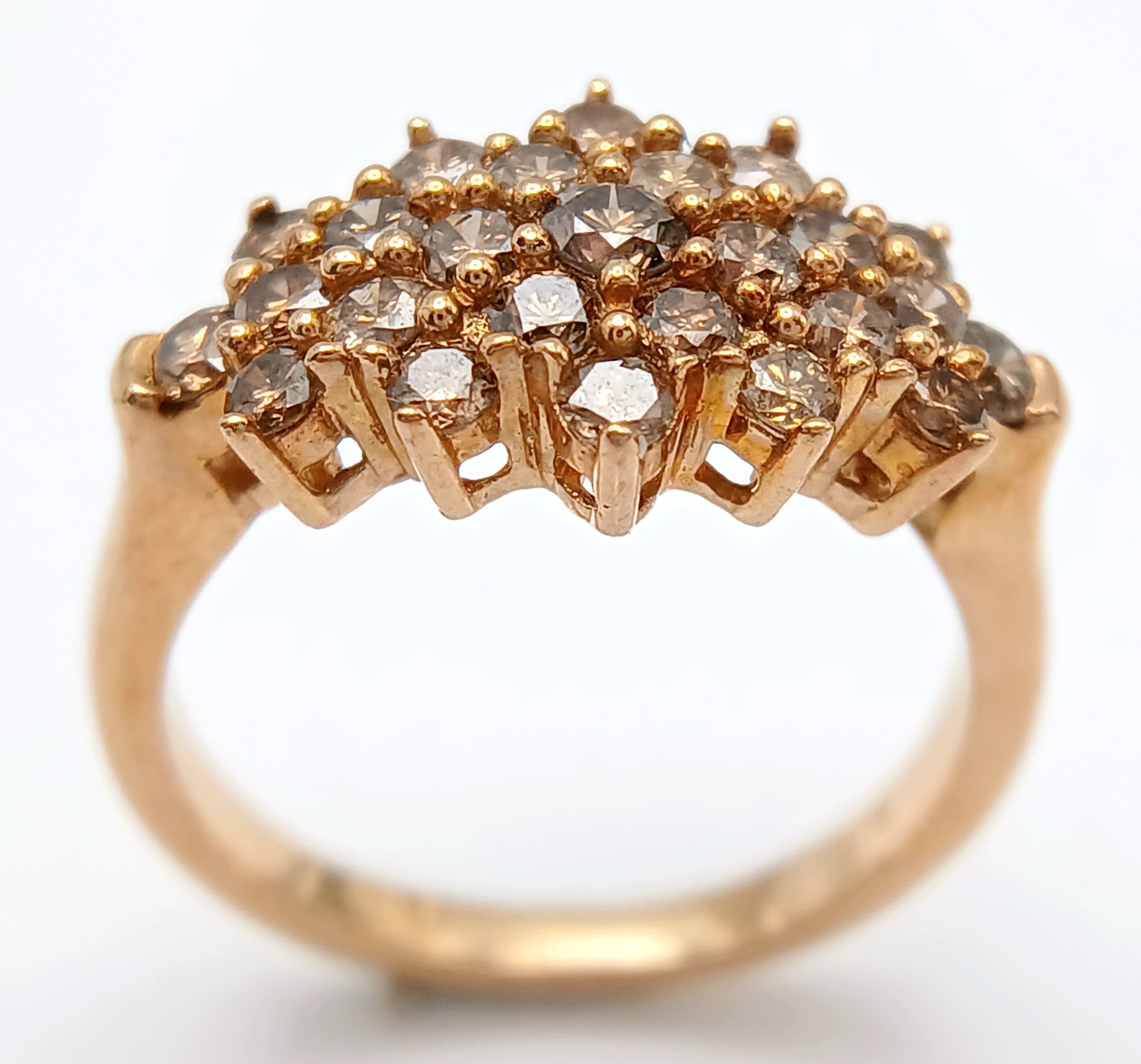 A STUNNING 9K YELLOW GOLD CHAMPAGNE DIAMOND SET CLUSTER RING, 0.50CT DIAMOND WEIGHT. TOTAL WEIGHT 3.3G. SIZE L. SC 9020