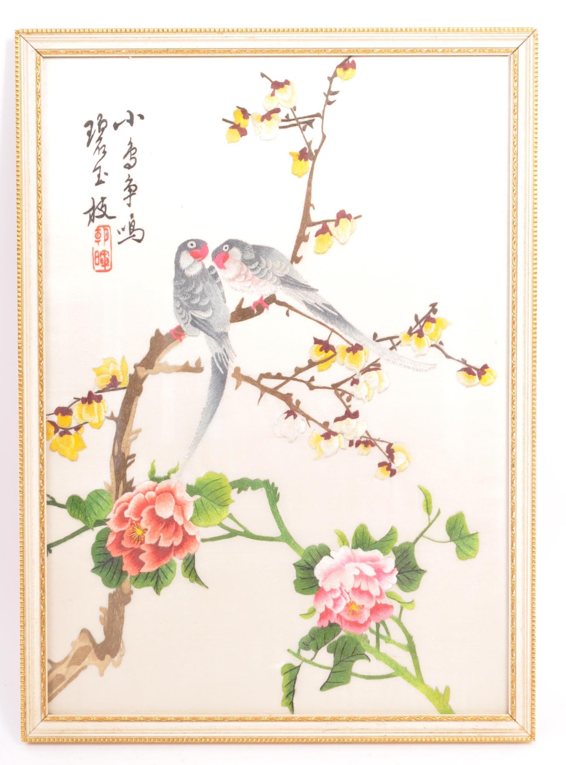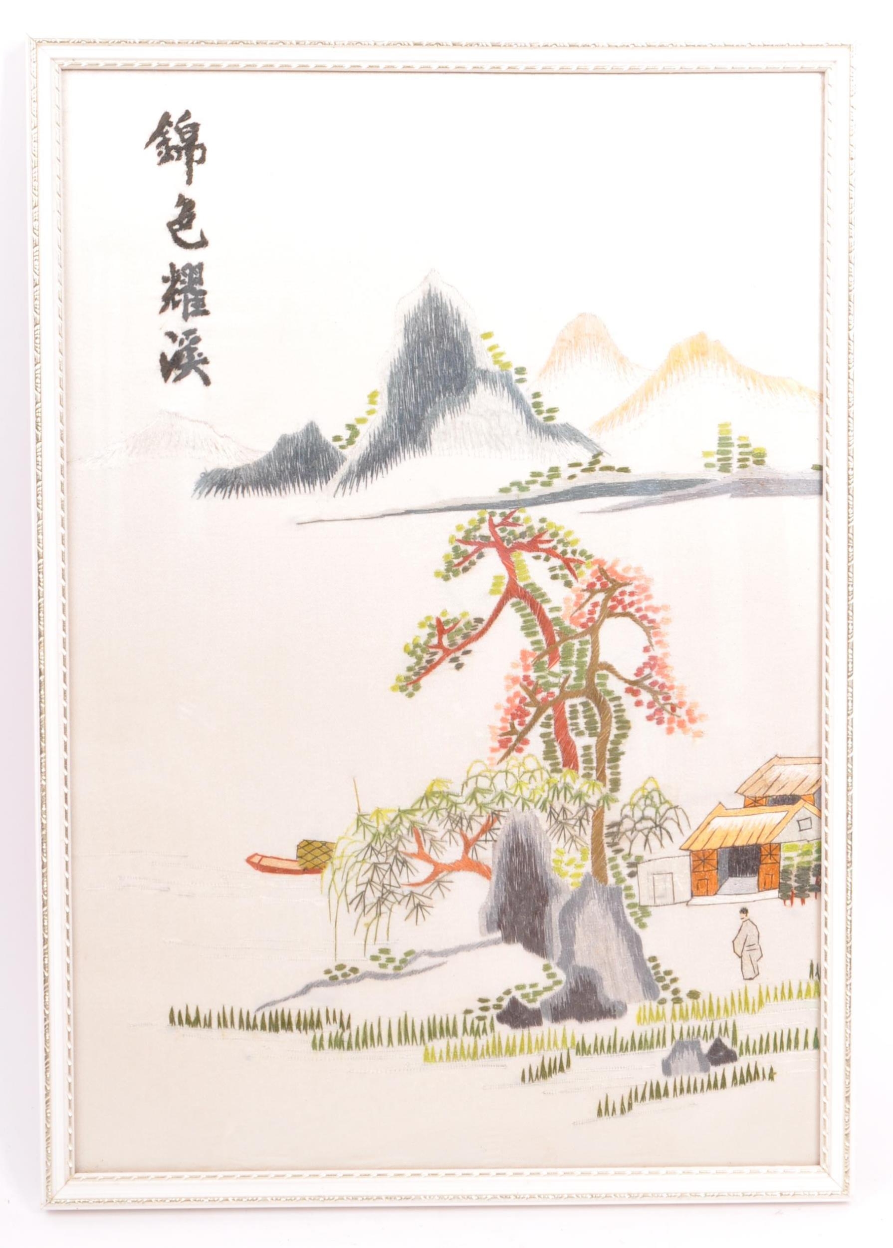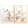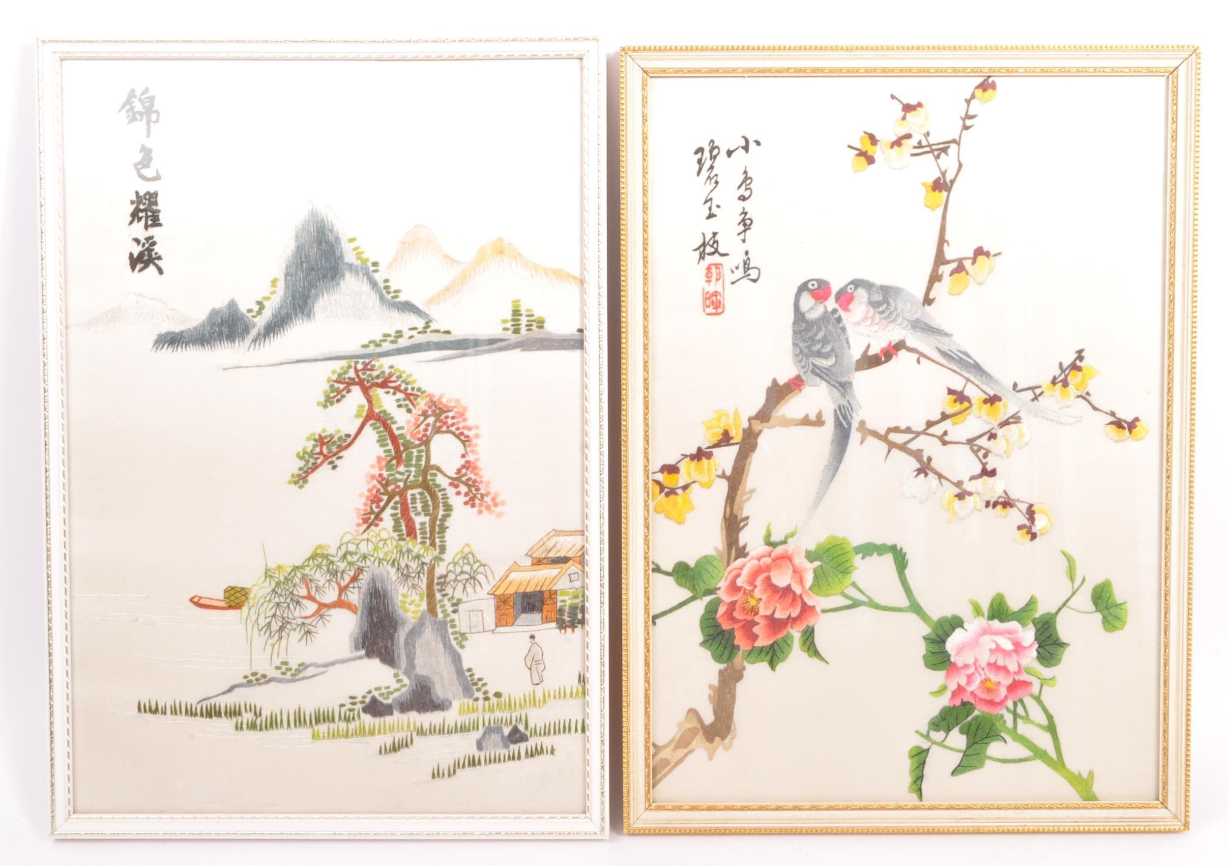 A pair of vintage retro mid 20th century embroidered Chinese silks / tapestries depicting a river and mountain scene, along with another parrot and floral scene. The silks of rectangular form and both framed & glazed. Measures 34.5cm x 24cm.