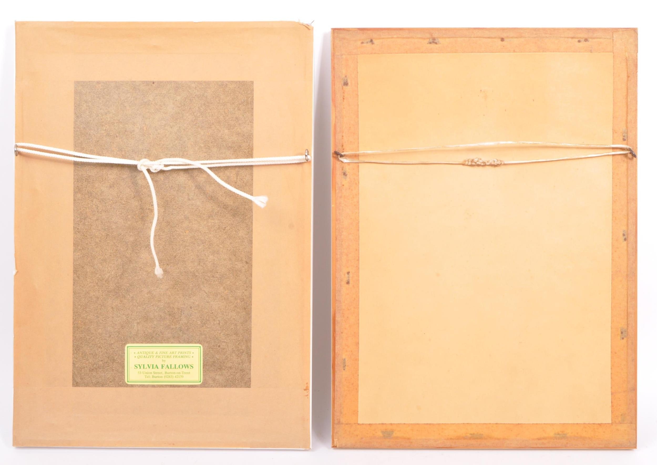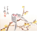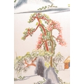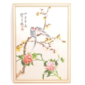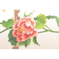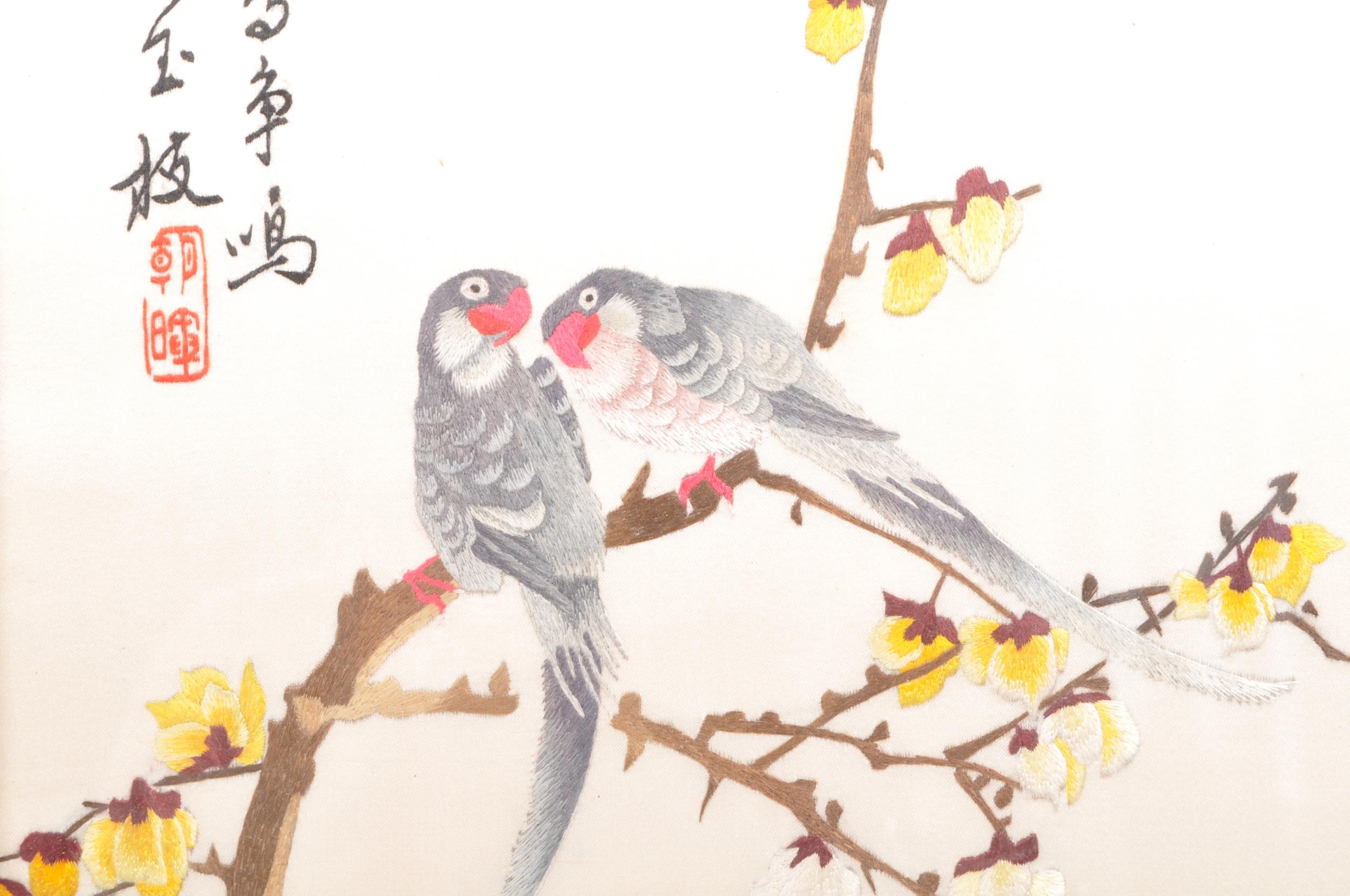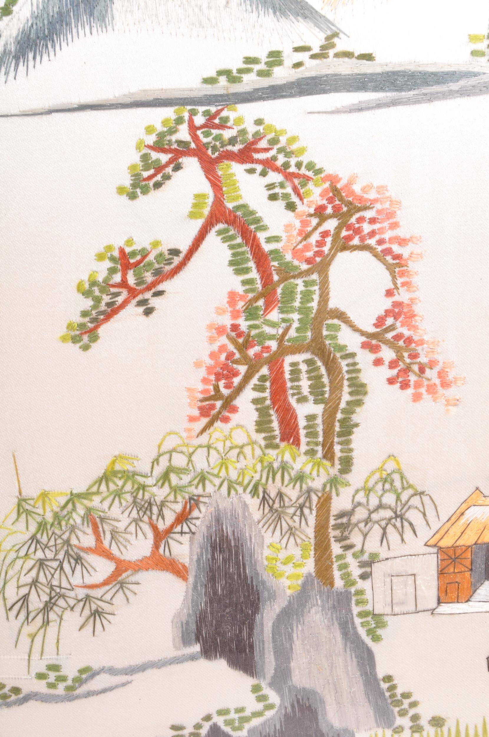 A pair of vintage retro mid 20th century embroidered Chinese silks / tapestries depicting a river and mountain scene, along with another parrot and floral scene. The silks of rectangular form and both framed & glazed. Measures 34.5cm x 24cm.