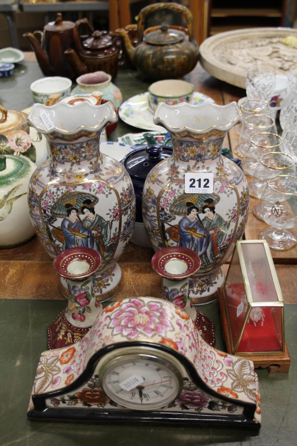 Pair of oriental vases, floral decorated candlesticks, etc.