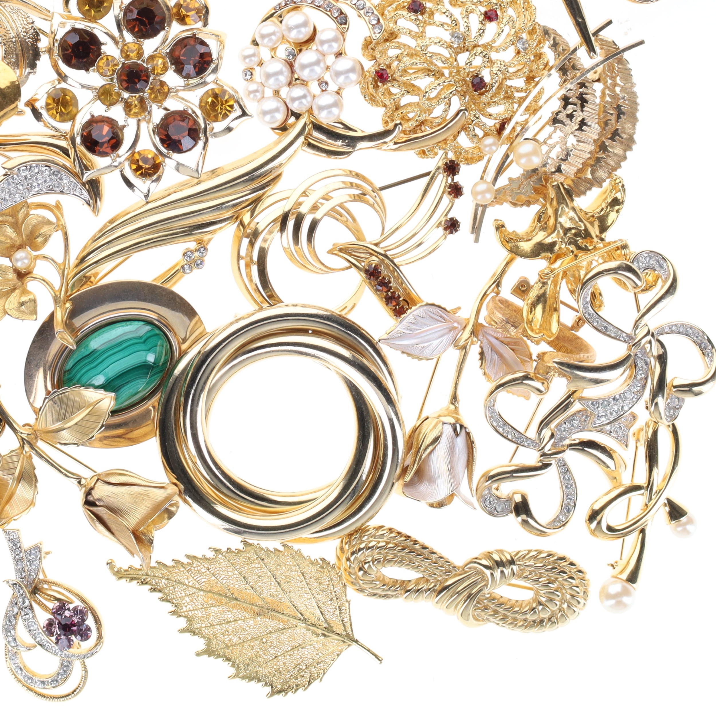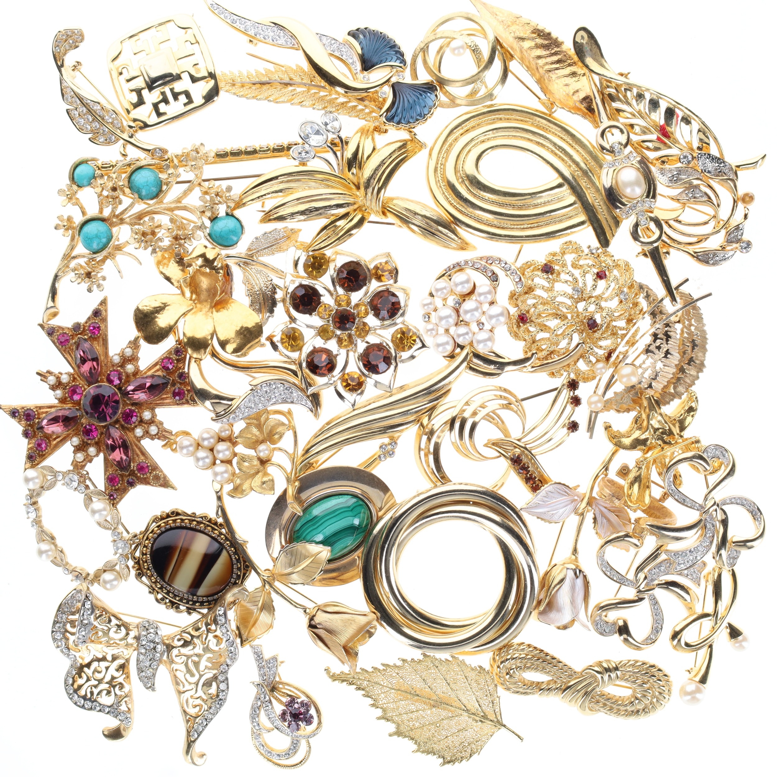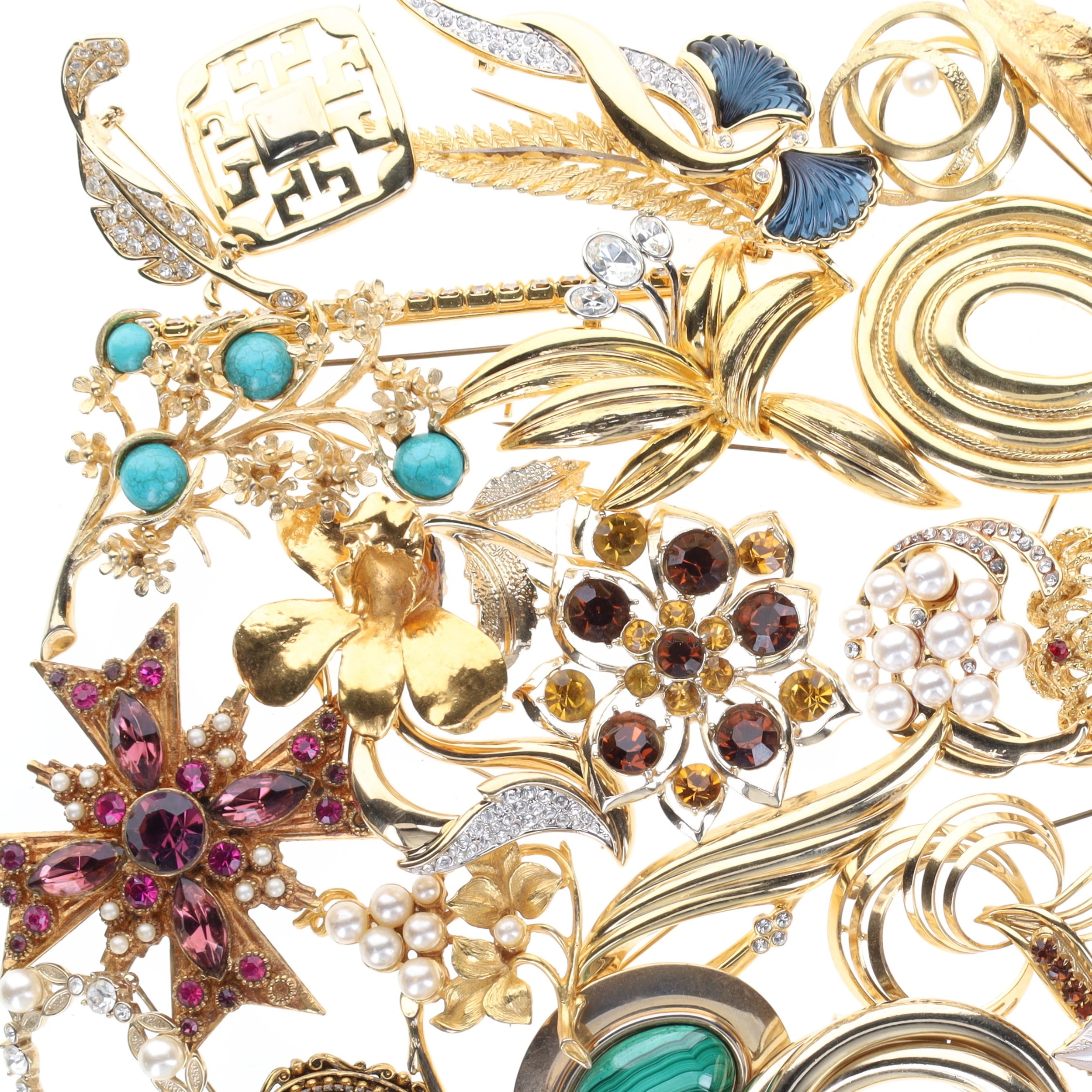 Assorted Gold Tone Brooches. Areas of plate wear, some stones may be missing, clasps are in working order. Weighs in total 500g.