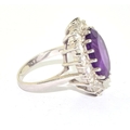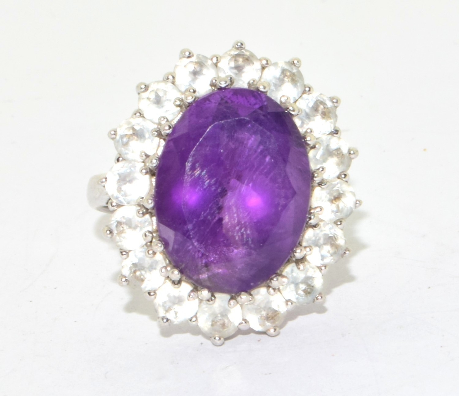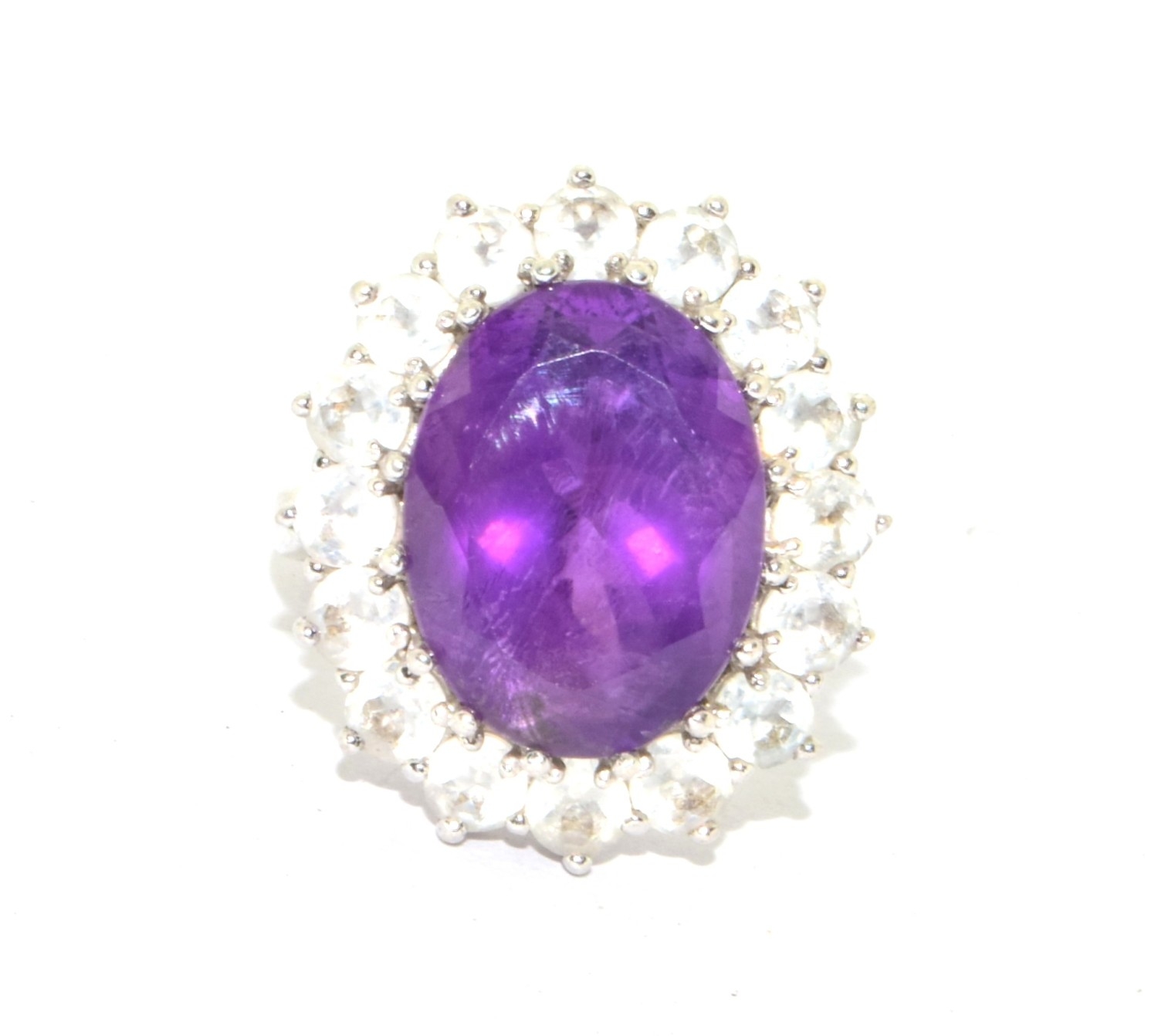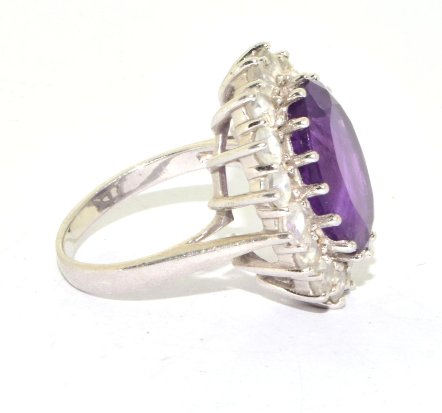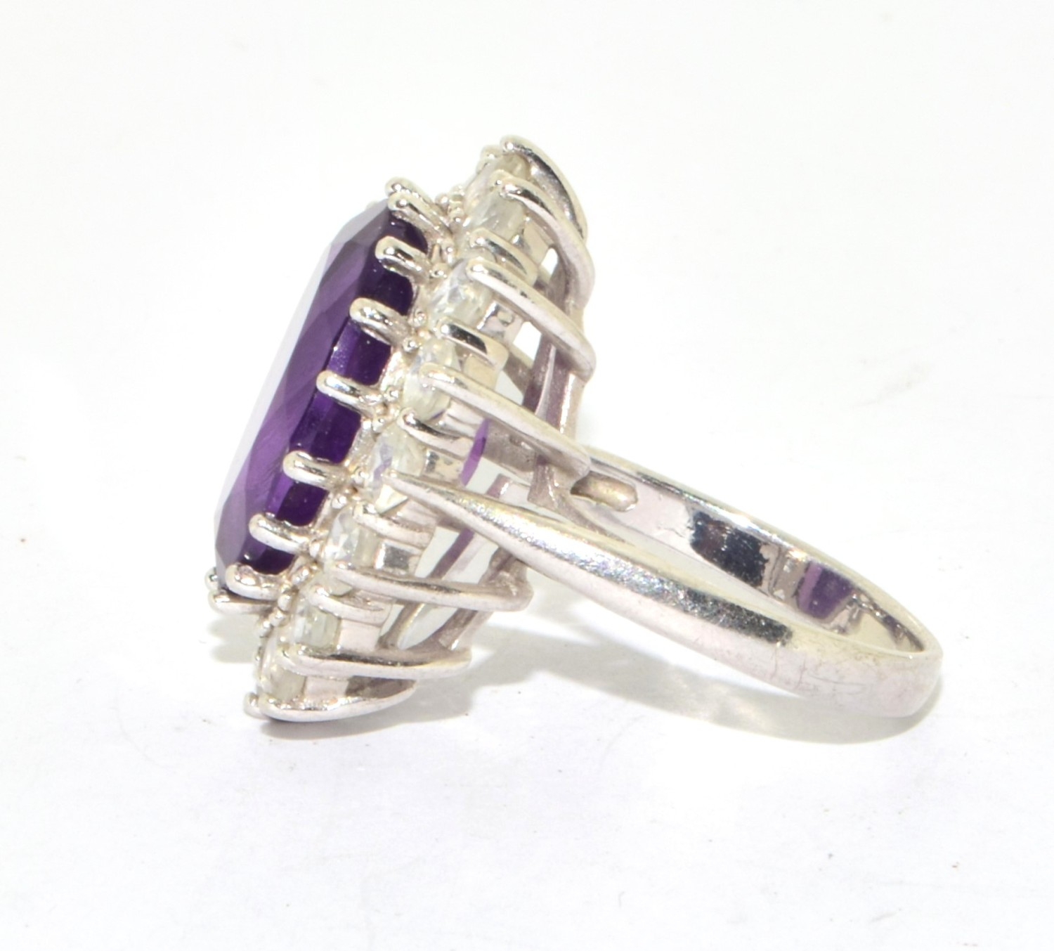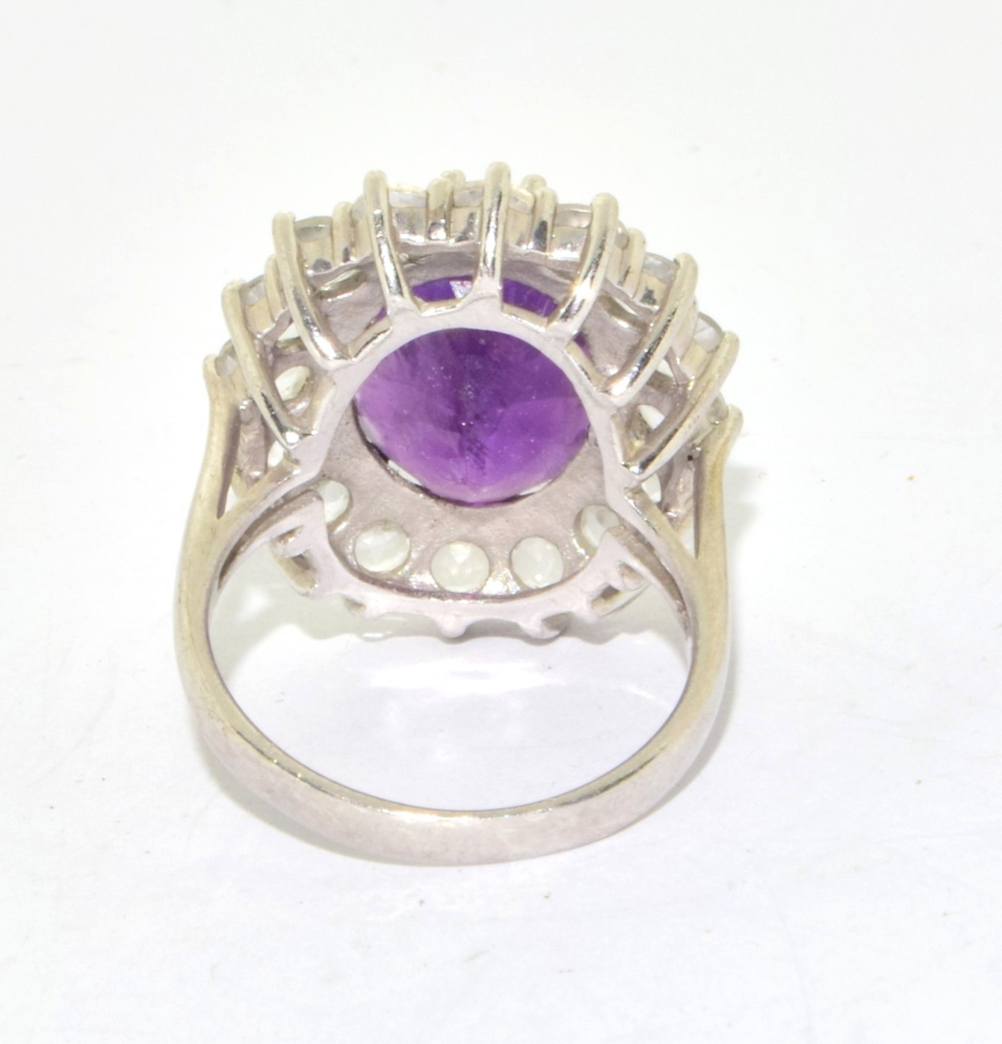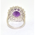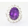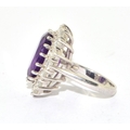 925 silver ladies large Amethyst halo design statement ring held in an open work claw setting size P