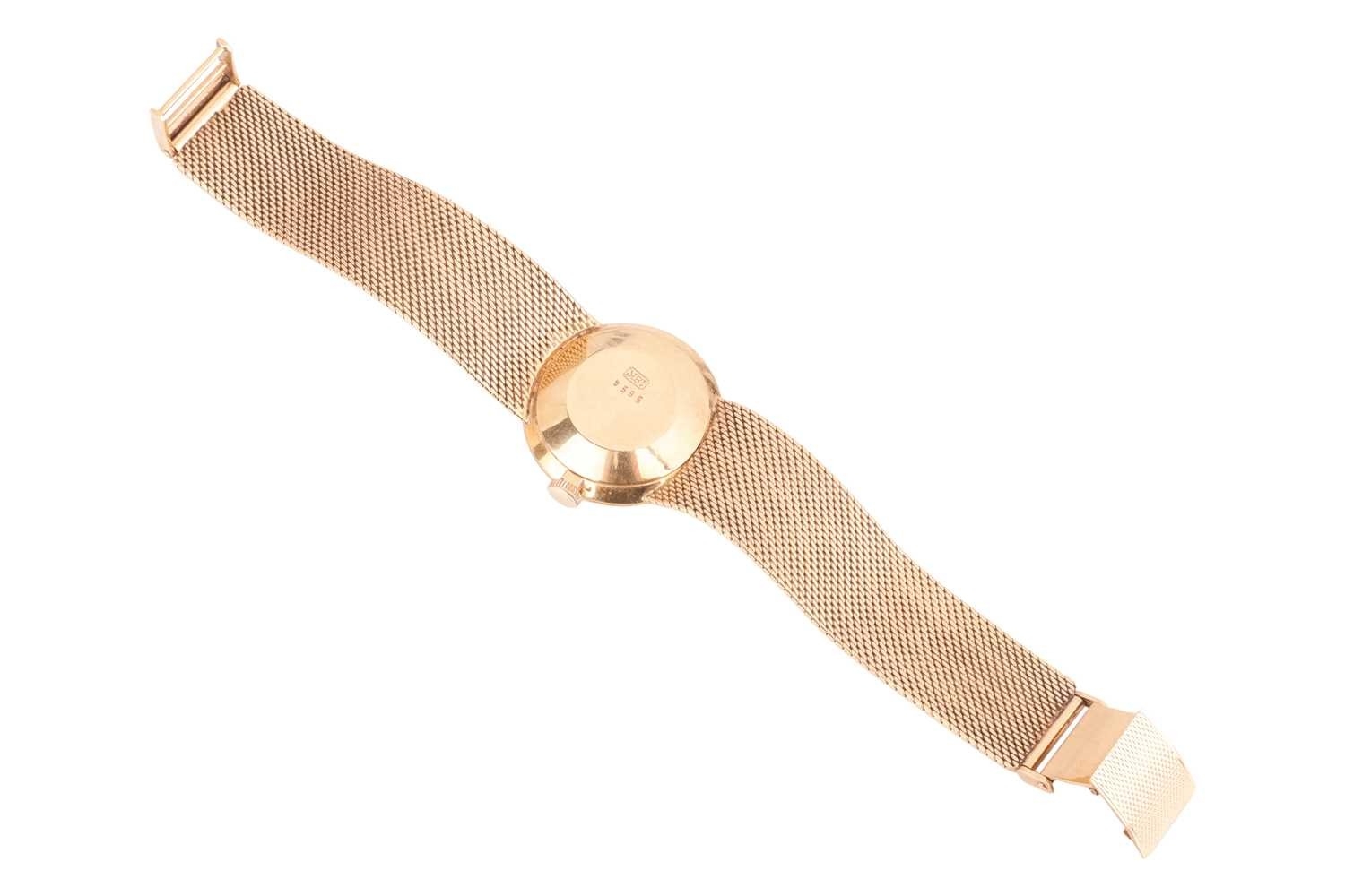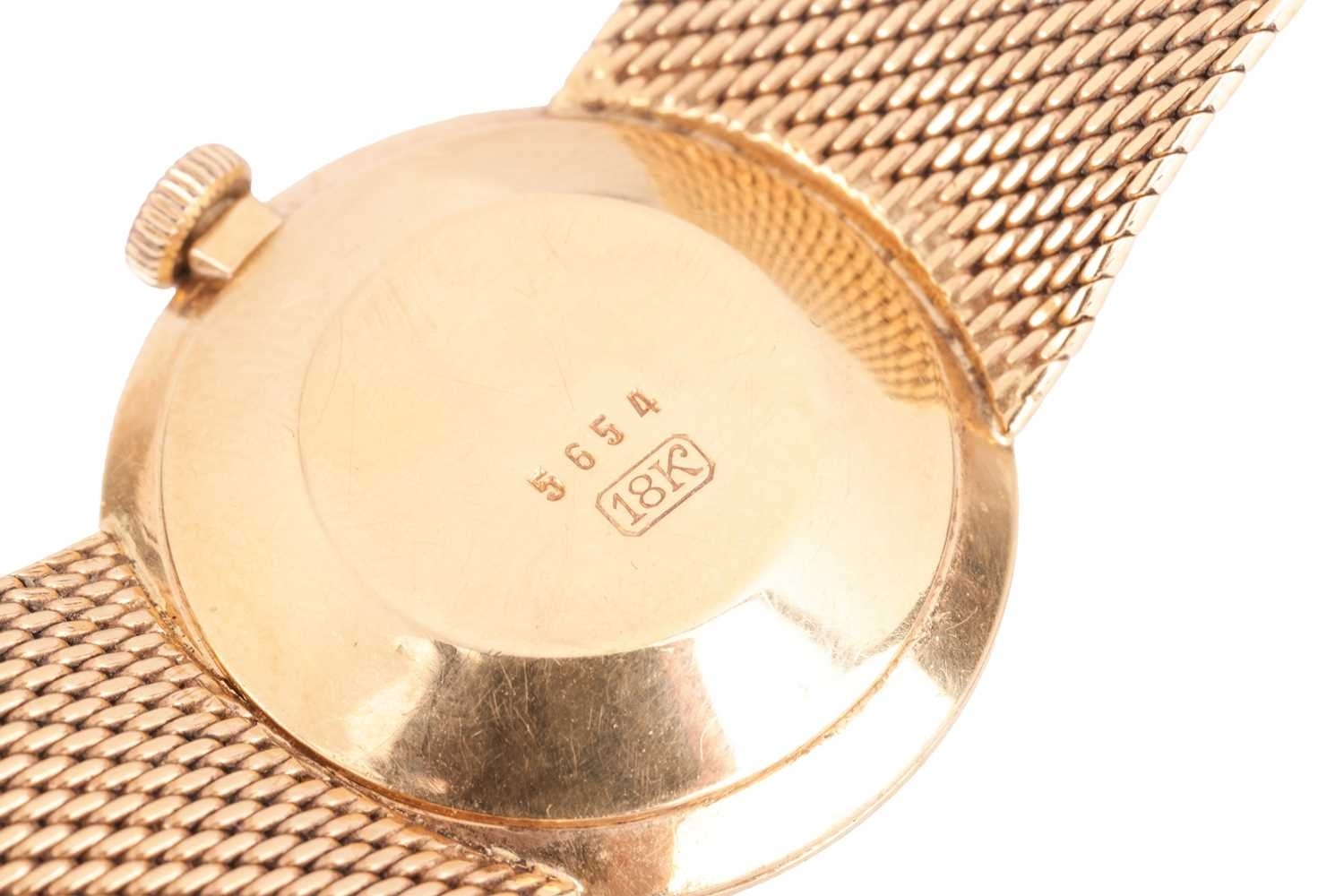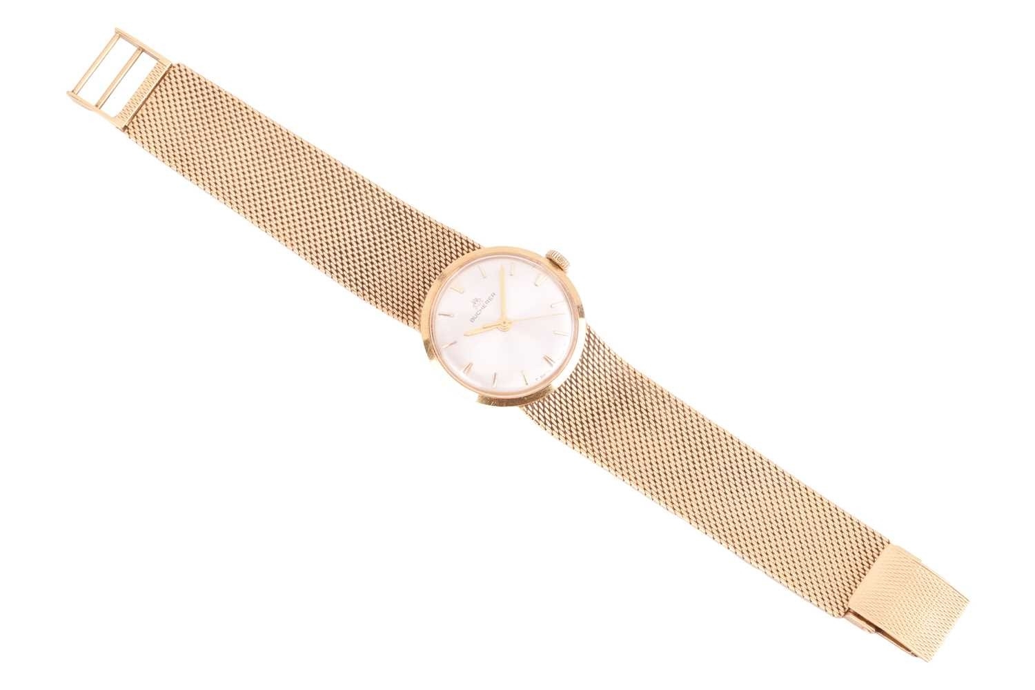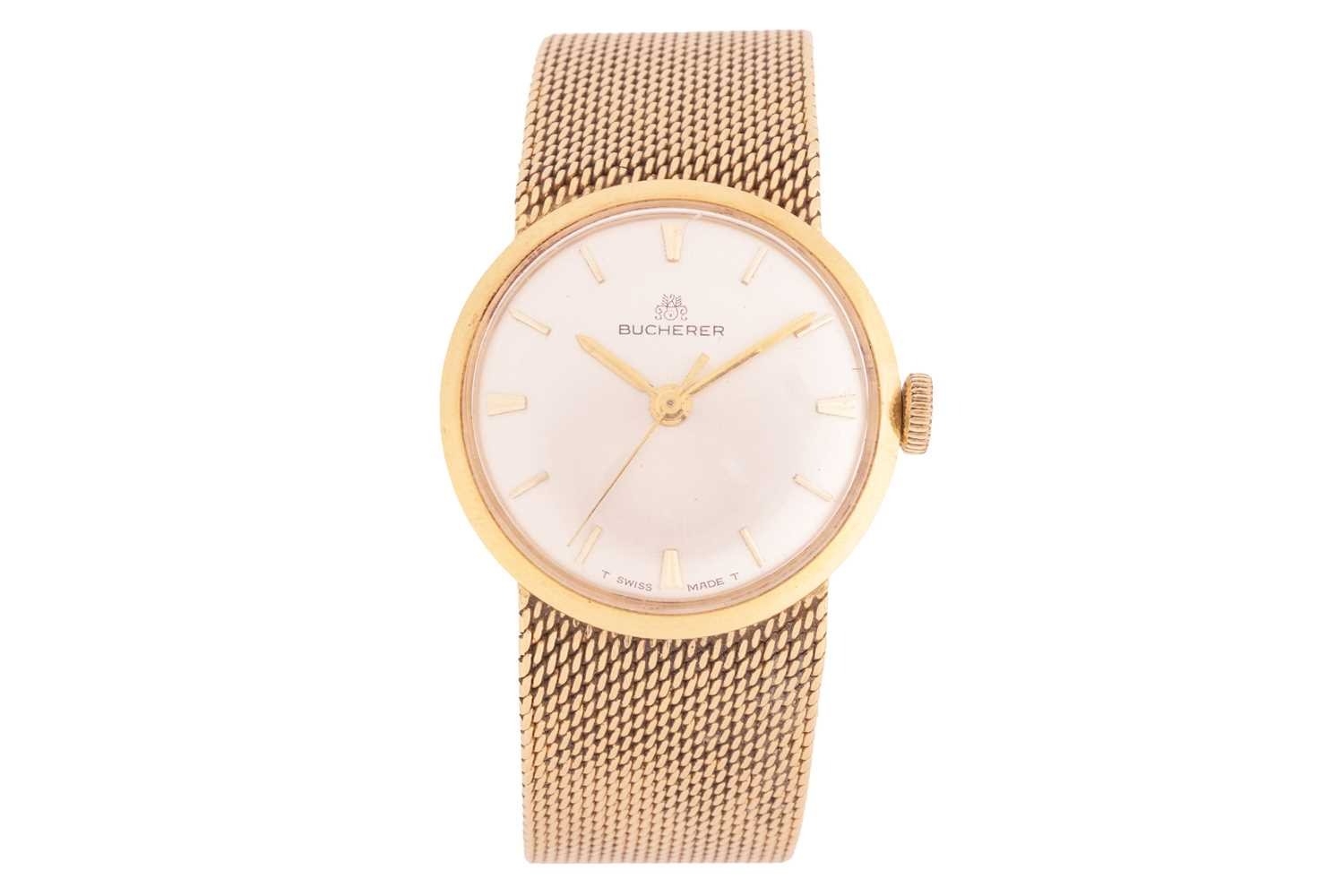 A Bucherer automatic 18ct gold dress watch, featuring a Swiss-made automatic movement in a yellow metal case measuring 25mm and stamped '750' with a champagne dial and baton indexes. With an integrated woven bracelet in yellow metal stamped '750' with a folding clasp. Total weight of item: 45.00g Case serial: 5654