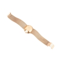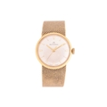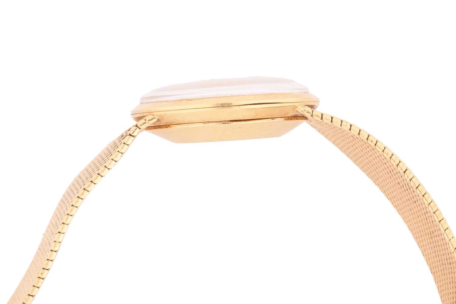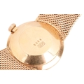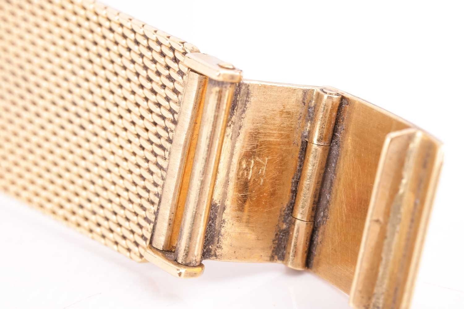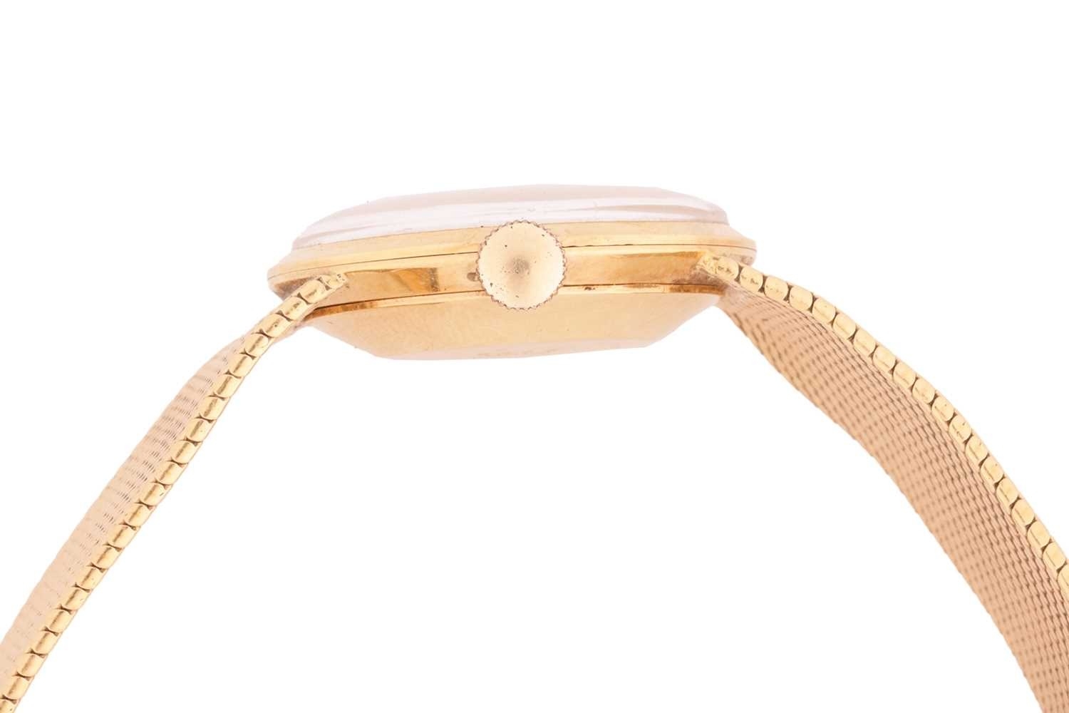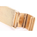 A Bucherer automatic 18ct gold dress watch, featuring a Swiss-made automatic movement in a yellow metal case measuring 25mm and stamped '750' with a champagne dial and baton indexes. With an integrated woven bracelet in yellow metal stamped '750' with a folding clasp. Total weight of item: 45.00g Case serial: 5654