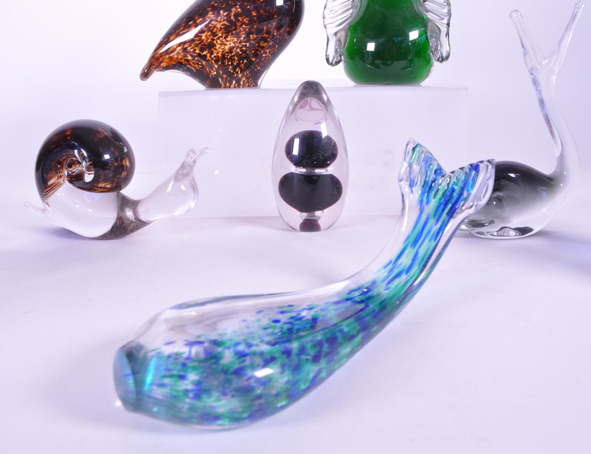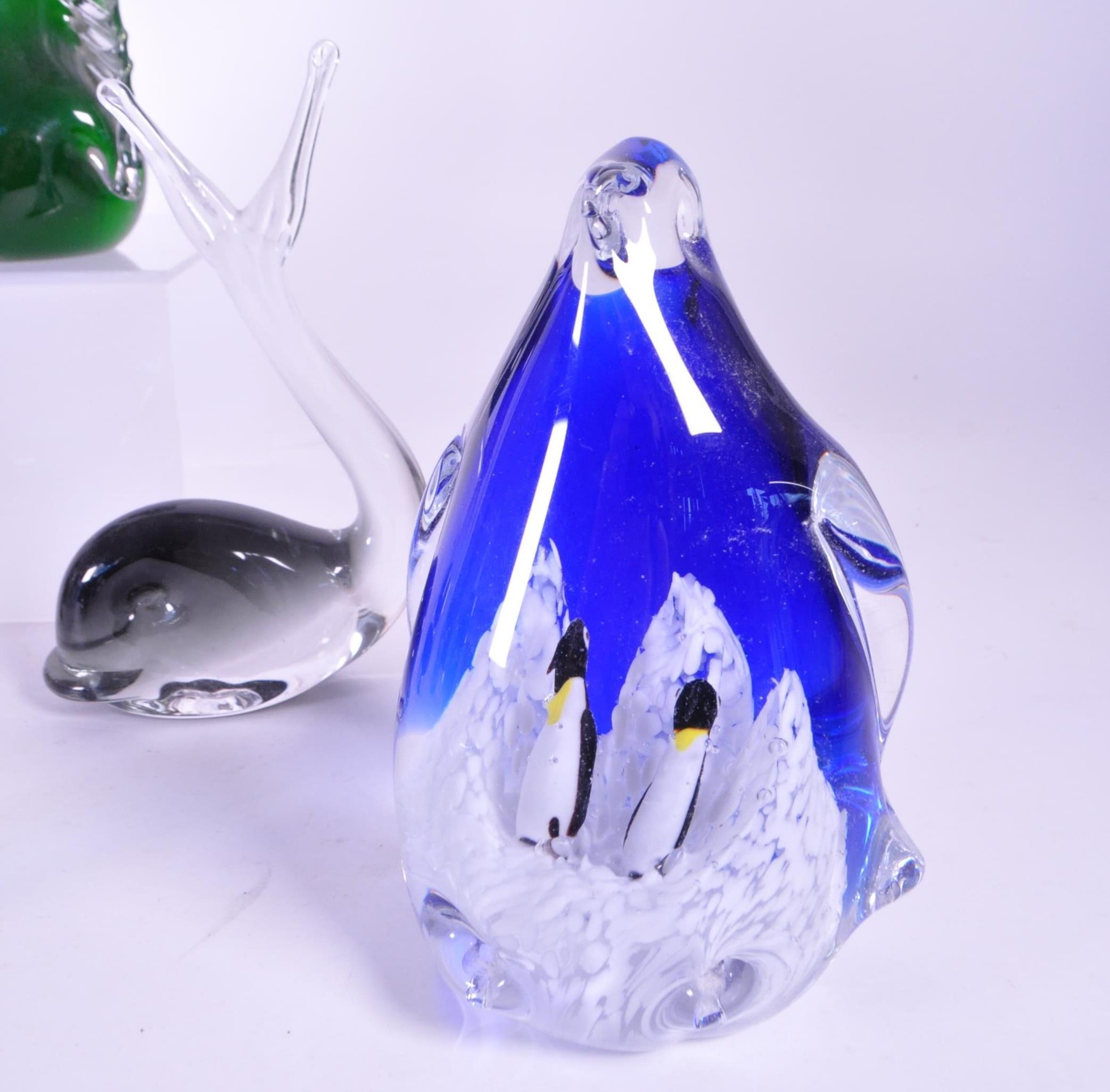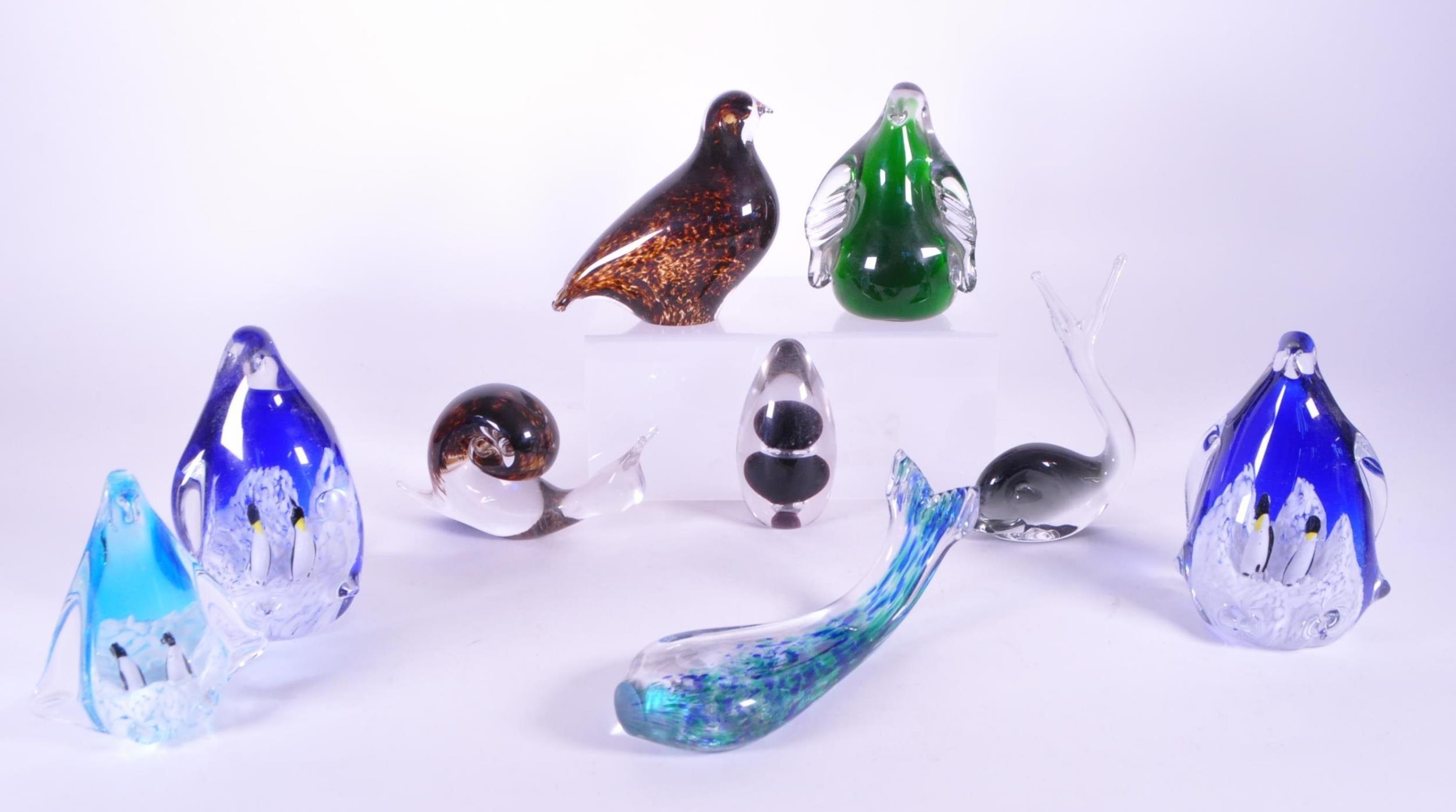 A collection of vintage 20th century glass animal paperweights. To include penguins, snails, whales and birds. Great Western and Wedgwood examples.