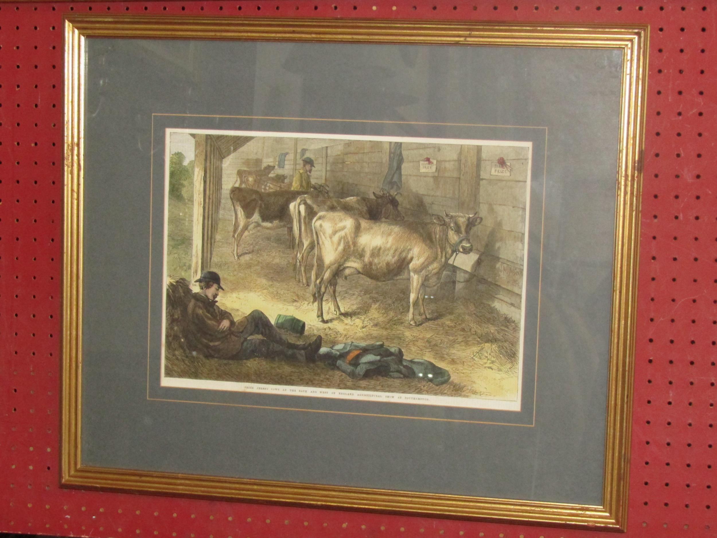 A coloured bookplate engraving 'Prize Jersey Cows at the Bath and West of England Agricultural Show at Southampton', framed and glazed, 25cm x 35cm image size