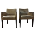 A PAIR OF VINTAGE EBONISED AND HIDE UPHOLSTERED LIBRARY ARMCHAIRS each with a rectangular back and seat with shaped arms on square moulded legs