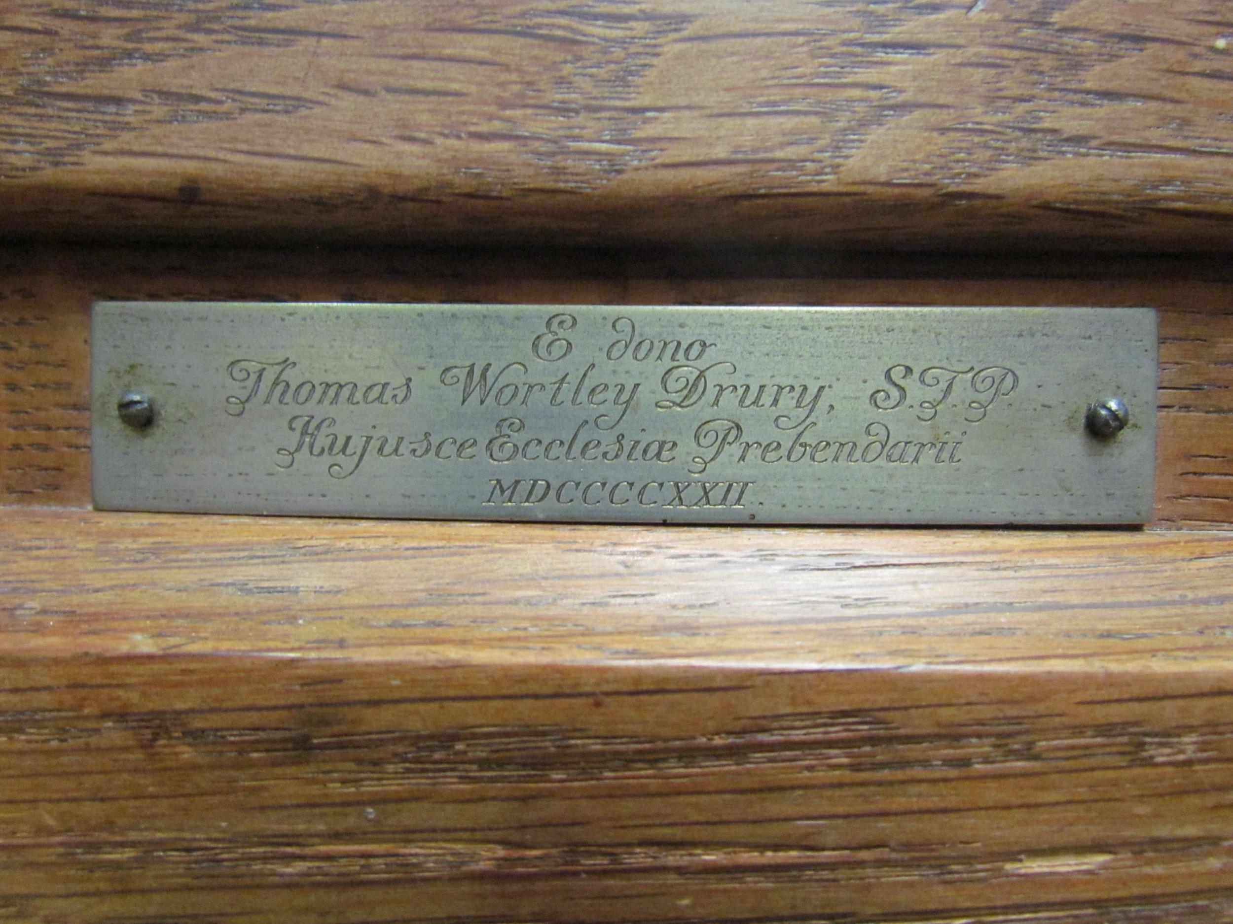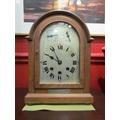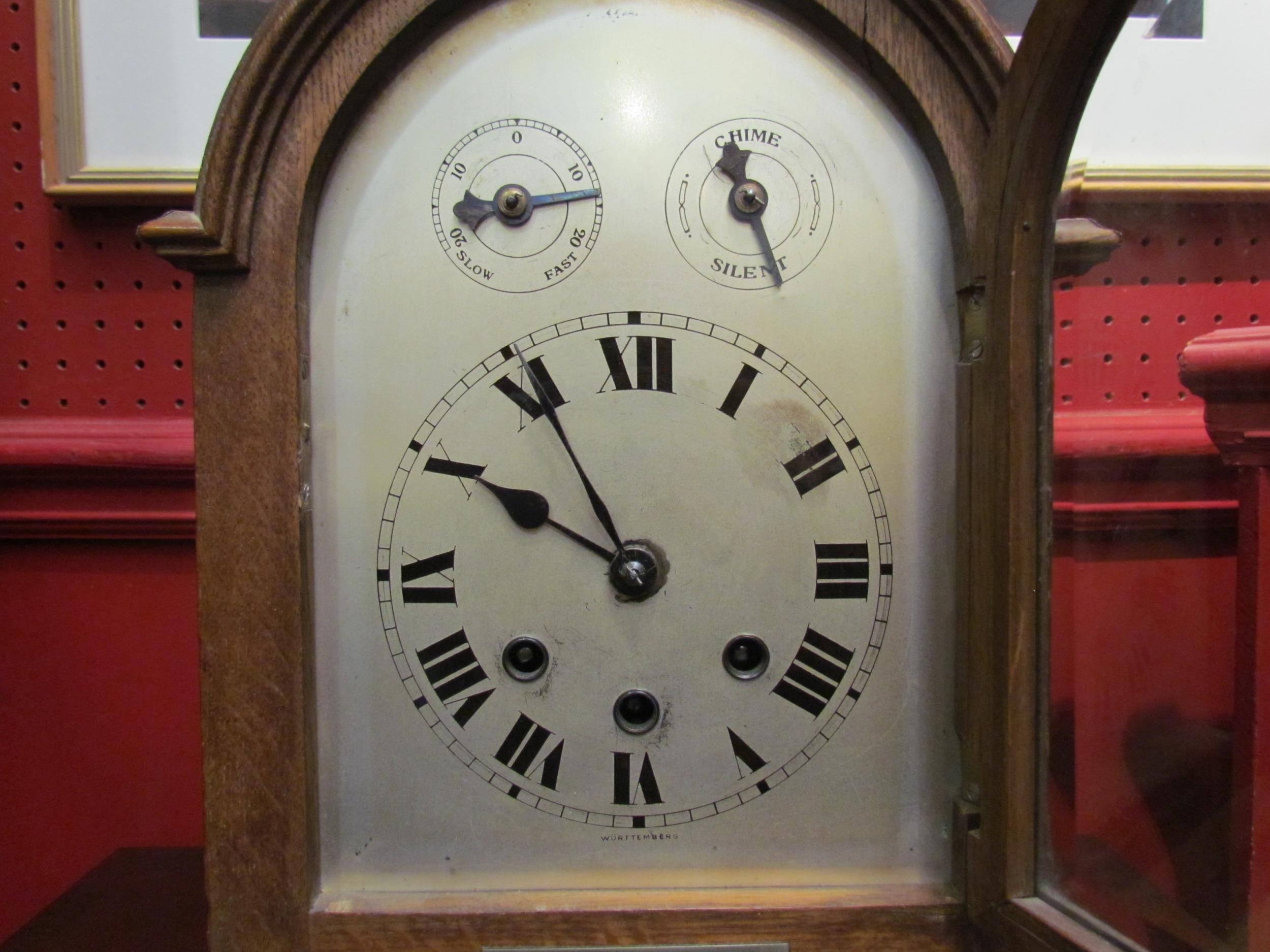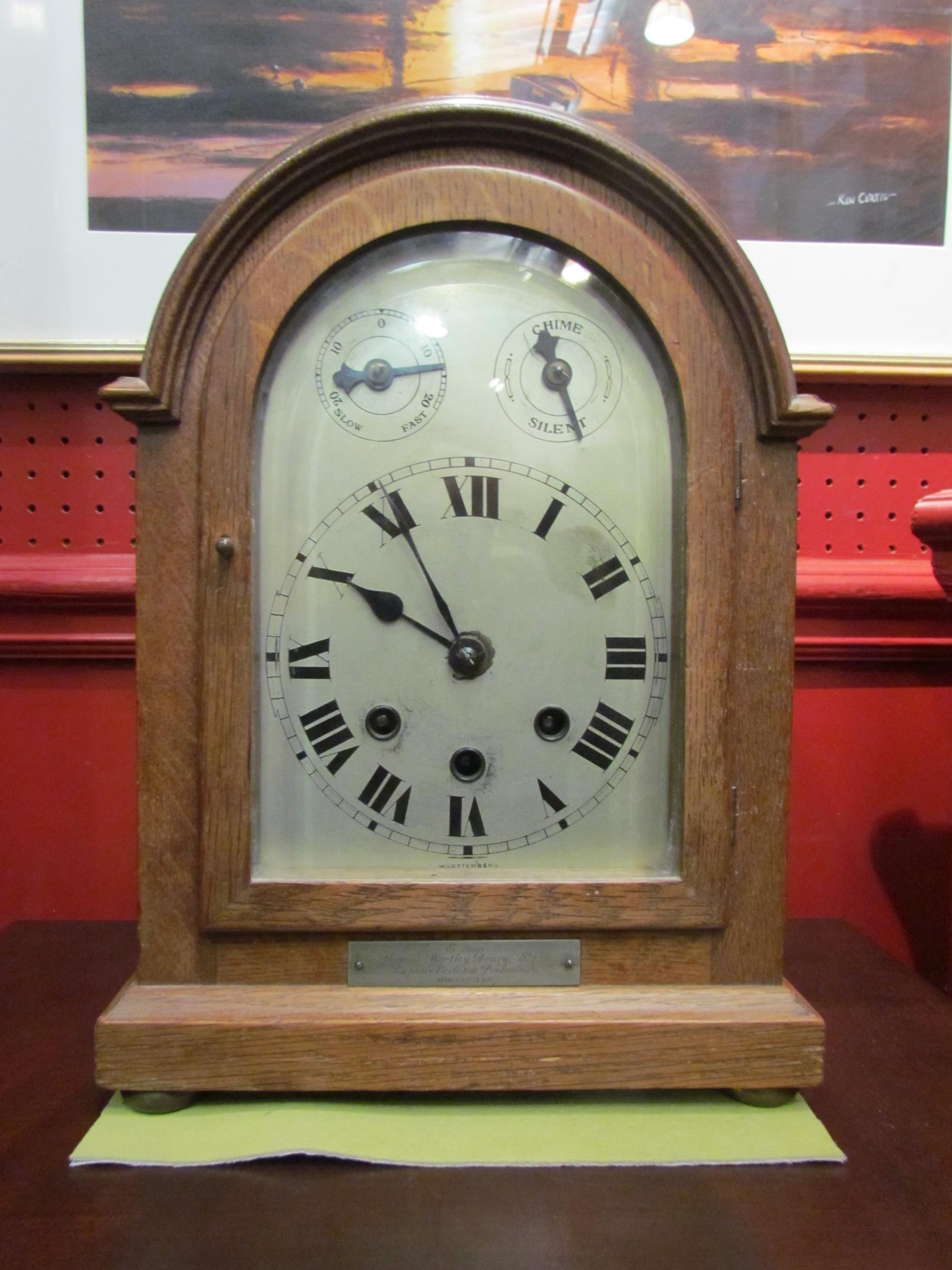 A Westminster chime bracket clock, oak arched case with Roman numerated dial, presentation plaque to Thomas Wortley Drury circa 1922