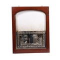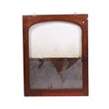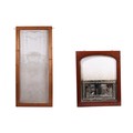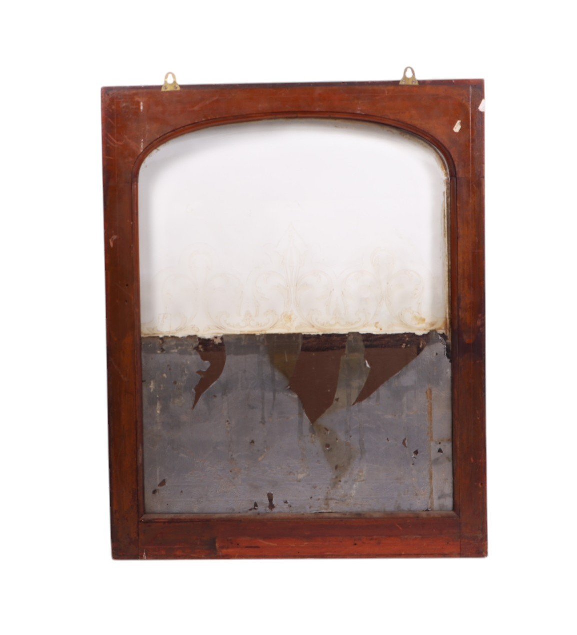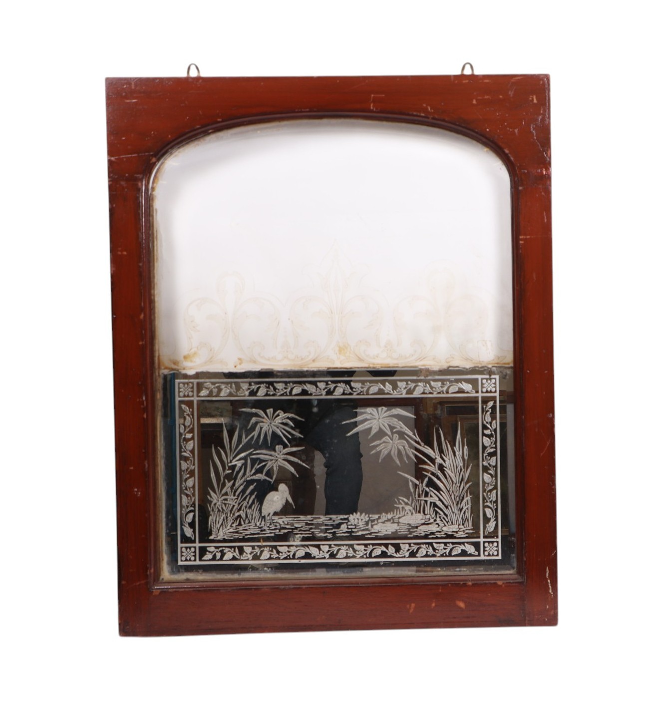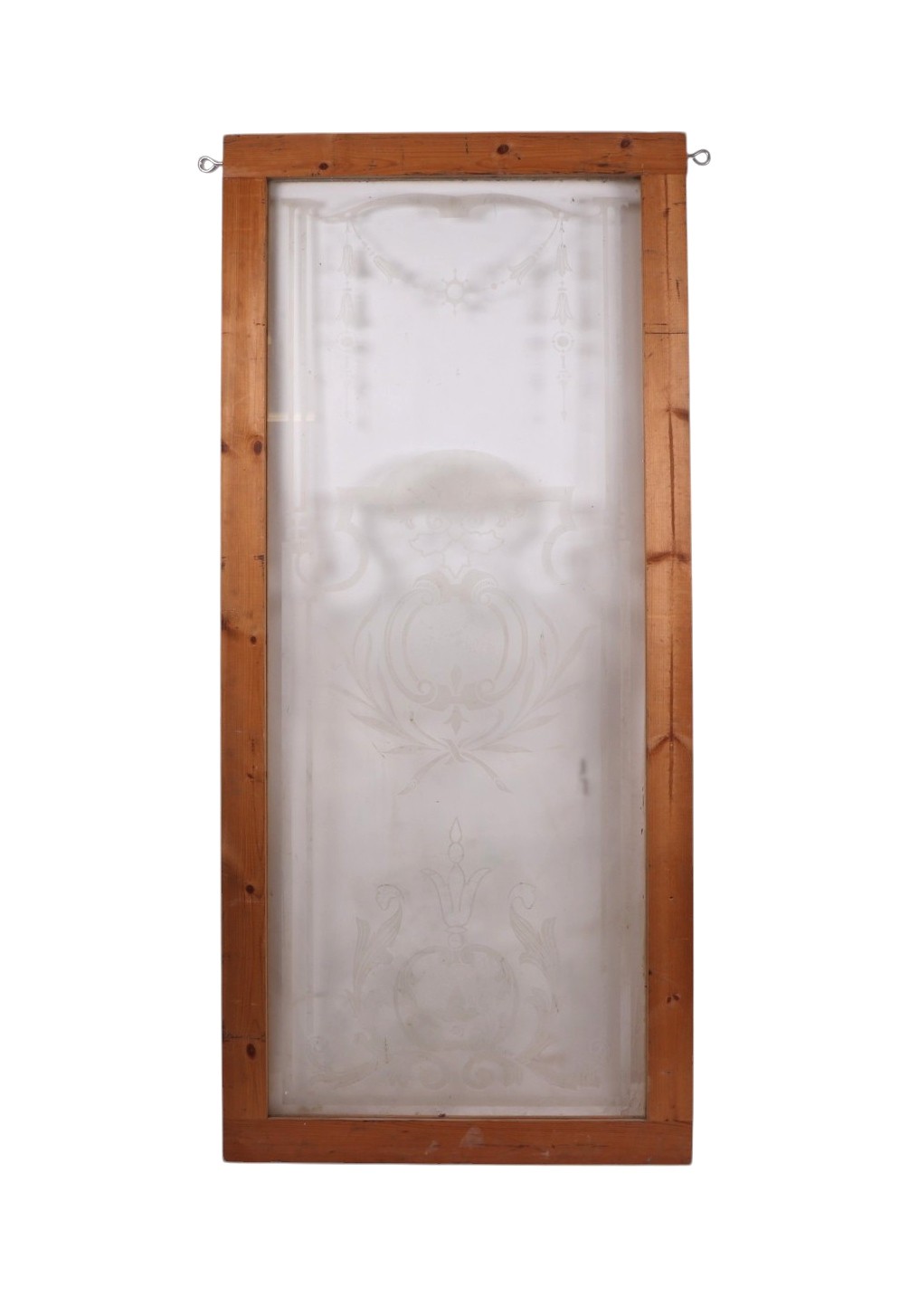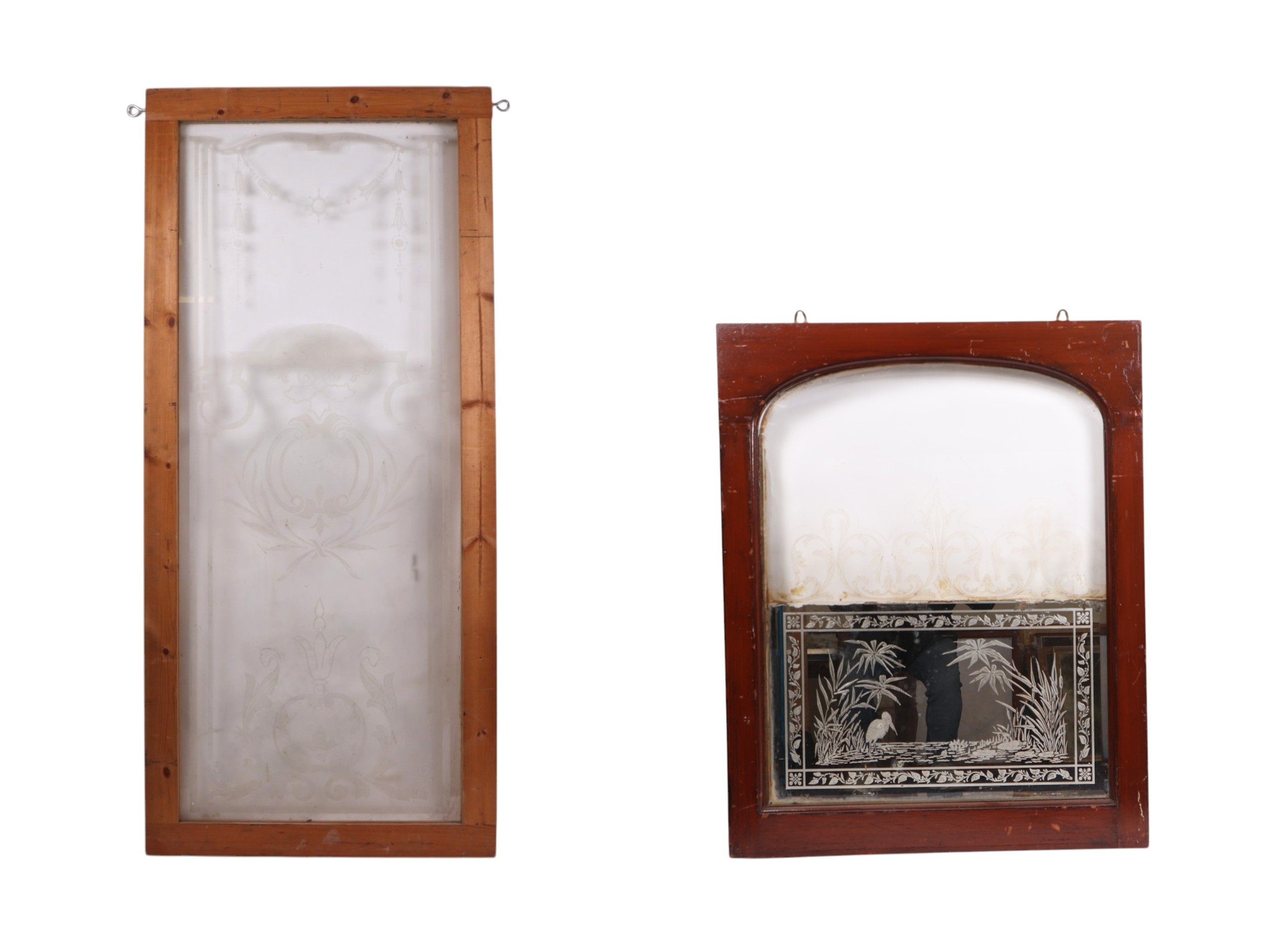 An etched glass pub type window, frame, 63 by 157cms; together with an arched etched and half mirrored pub window, framed, 64 by 81cms (2).
