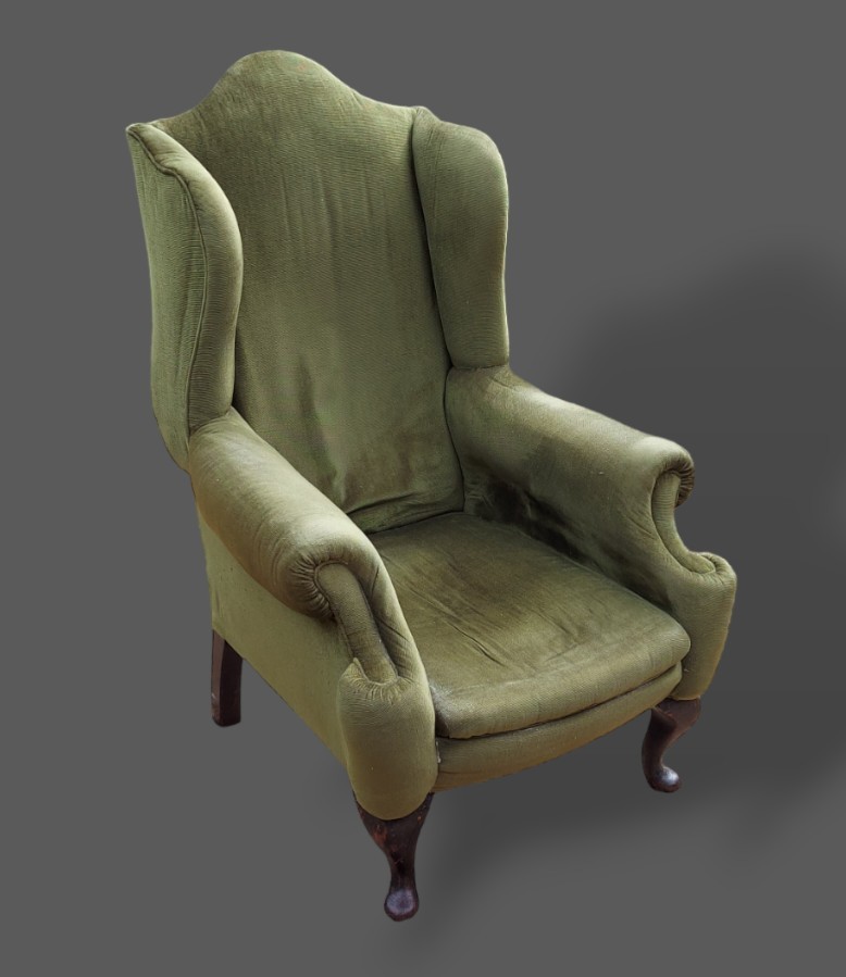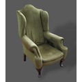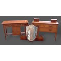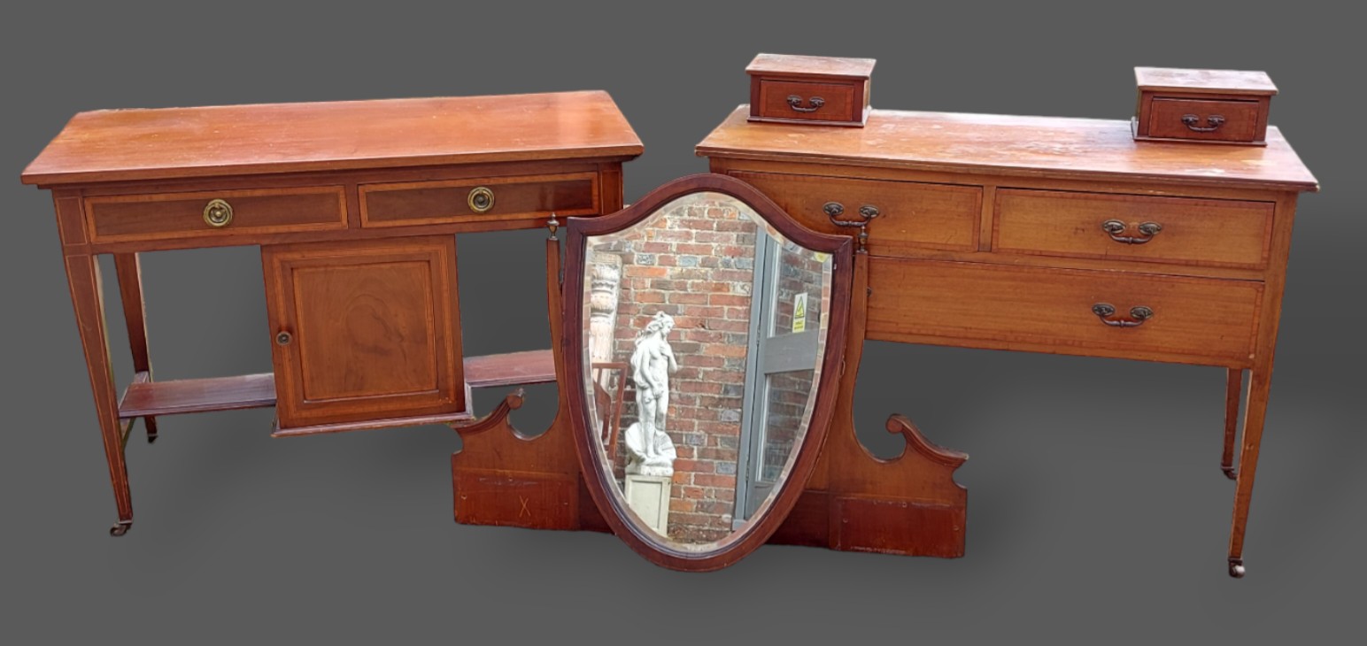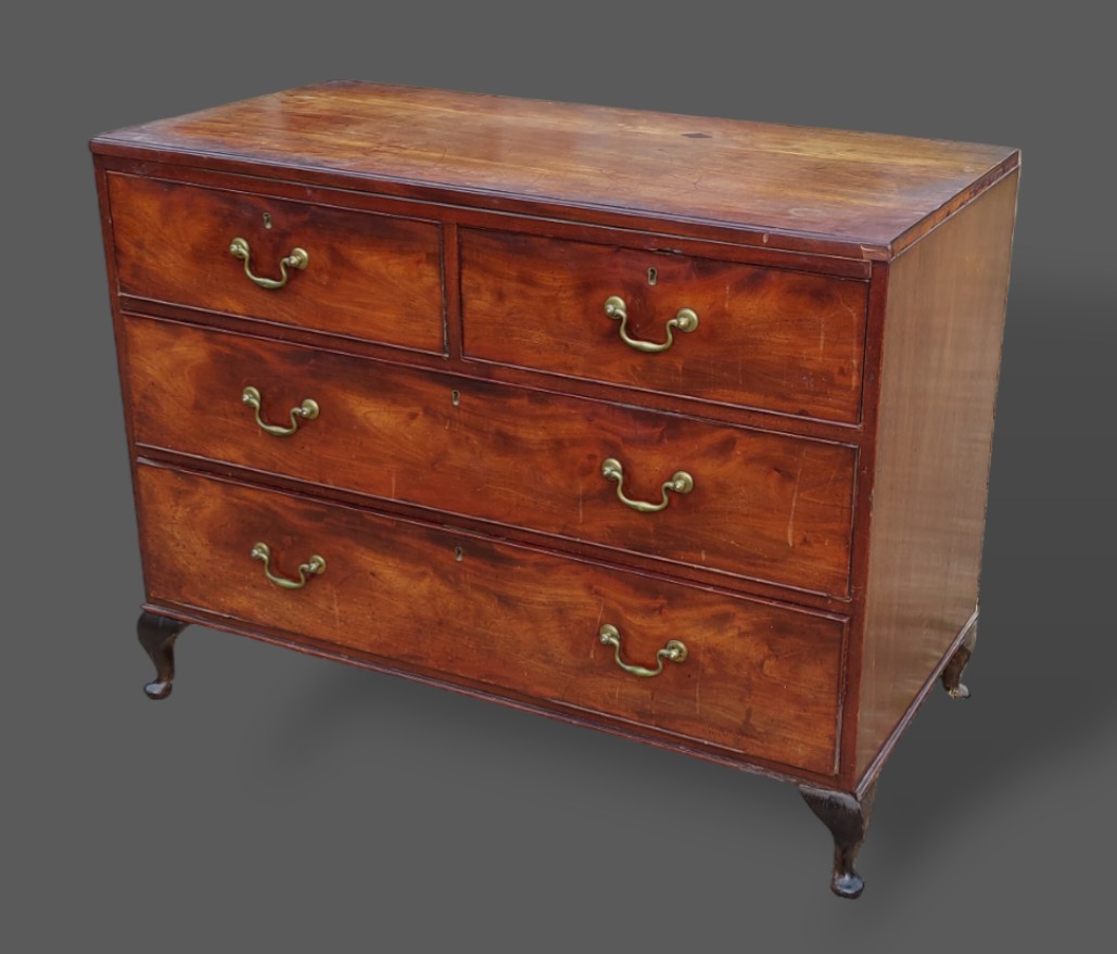 A 19th Century mahogany chest of two short and two long drawers raised upon low cabriole legs, 113cms wide, 56cms deep and 87cms tall together with an Edwardian dressing table, a washstand, an armchair and a sofa