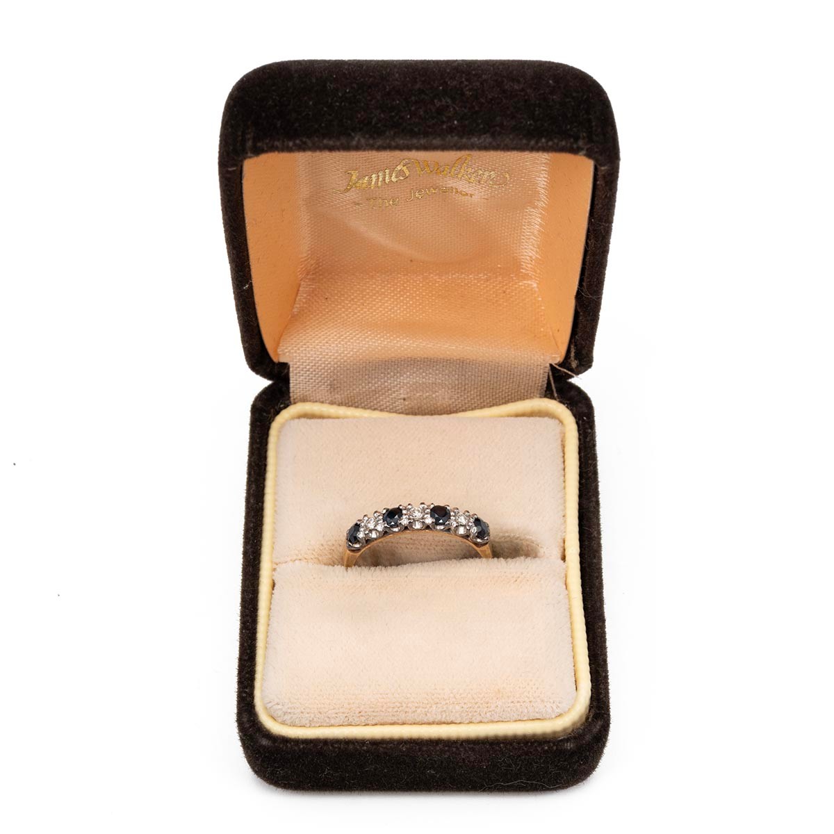 18ct hallmarked gold sapphire and diamond ring, set with four sapphires and three diamonds, size M, weight 2.2 grams.