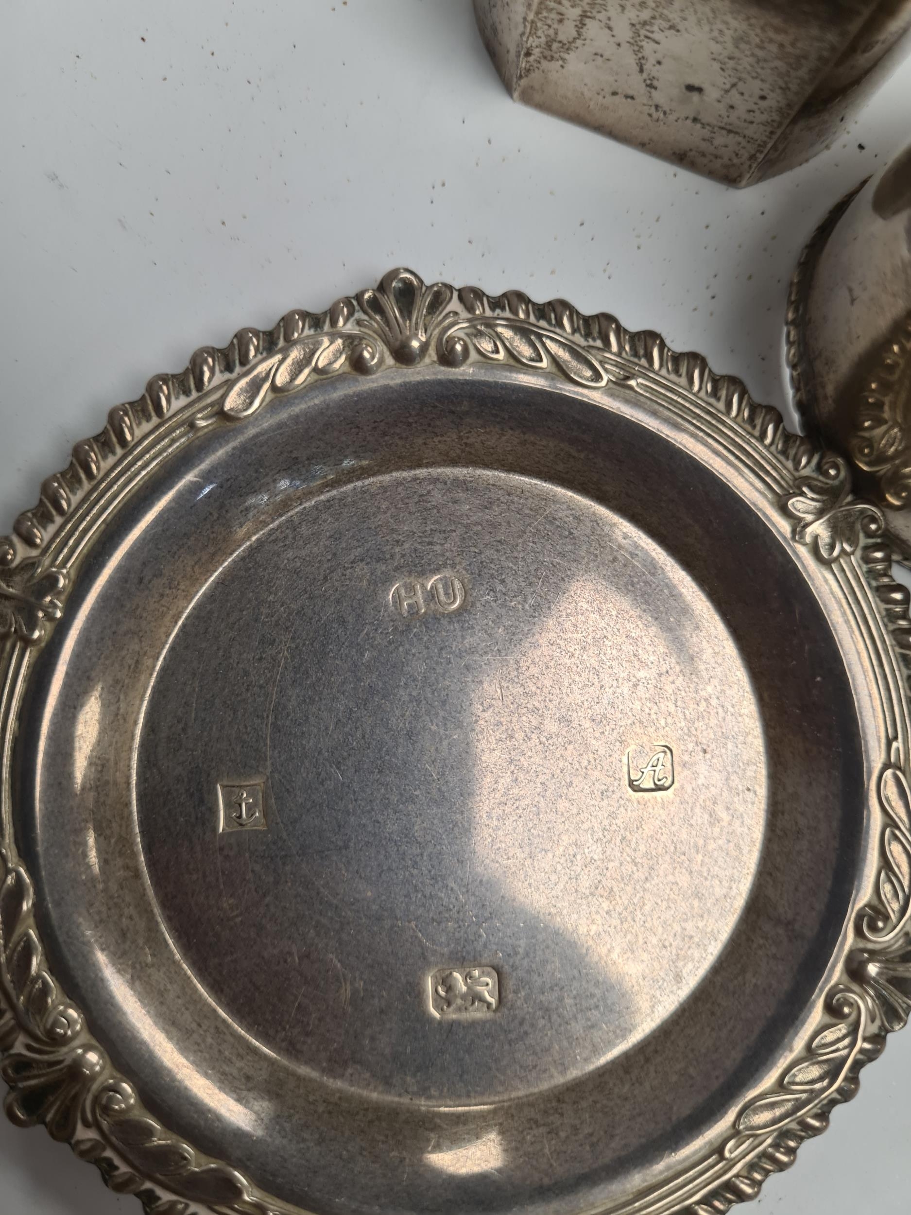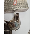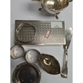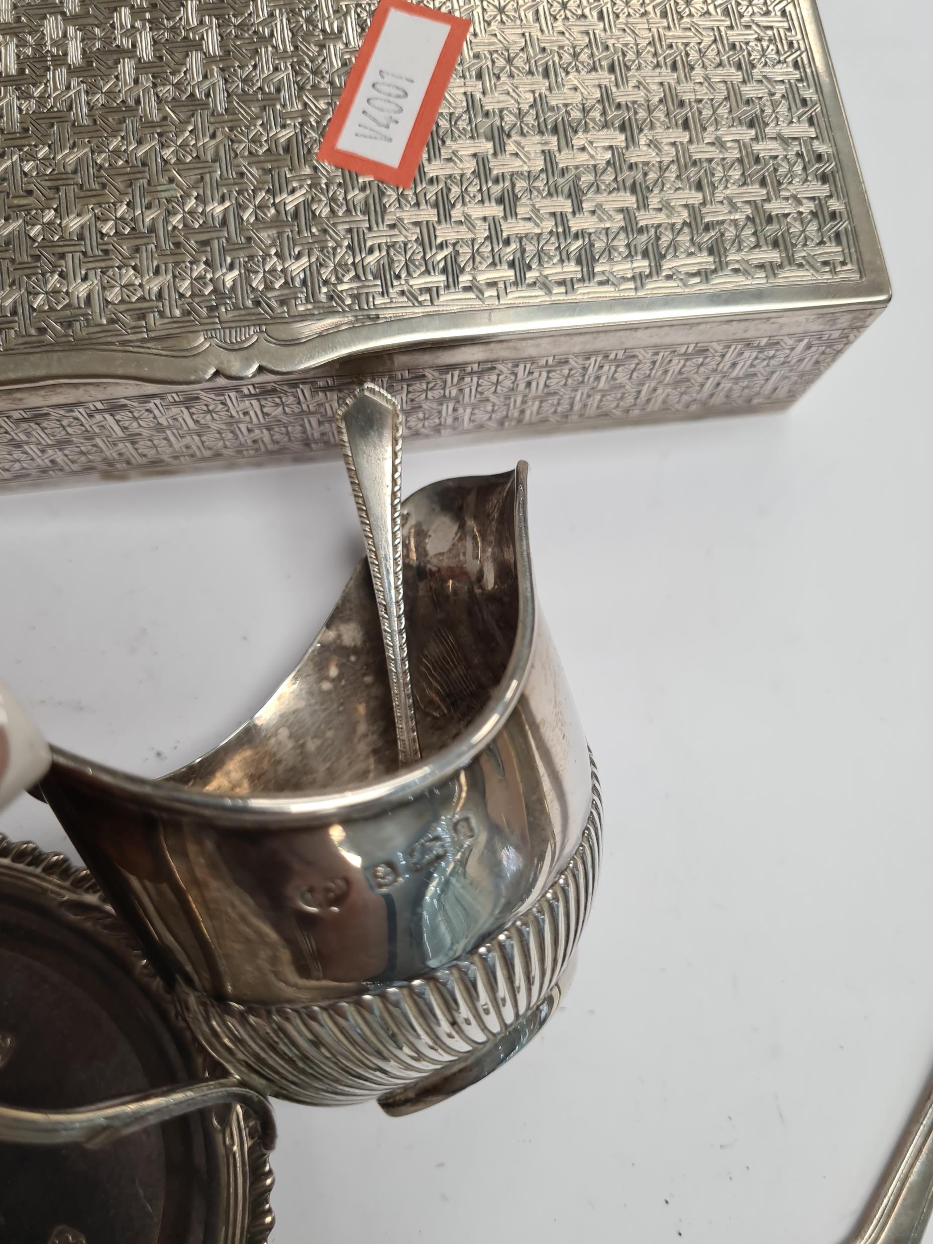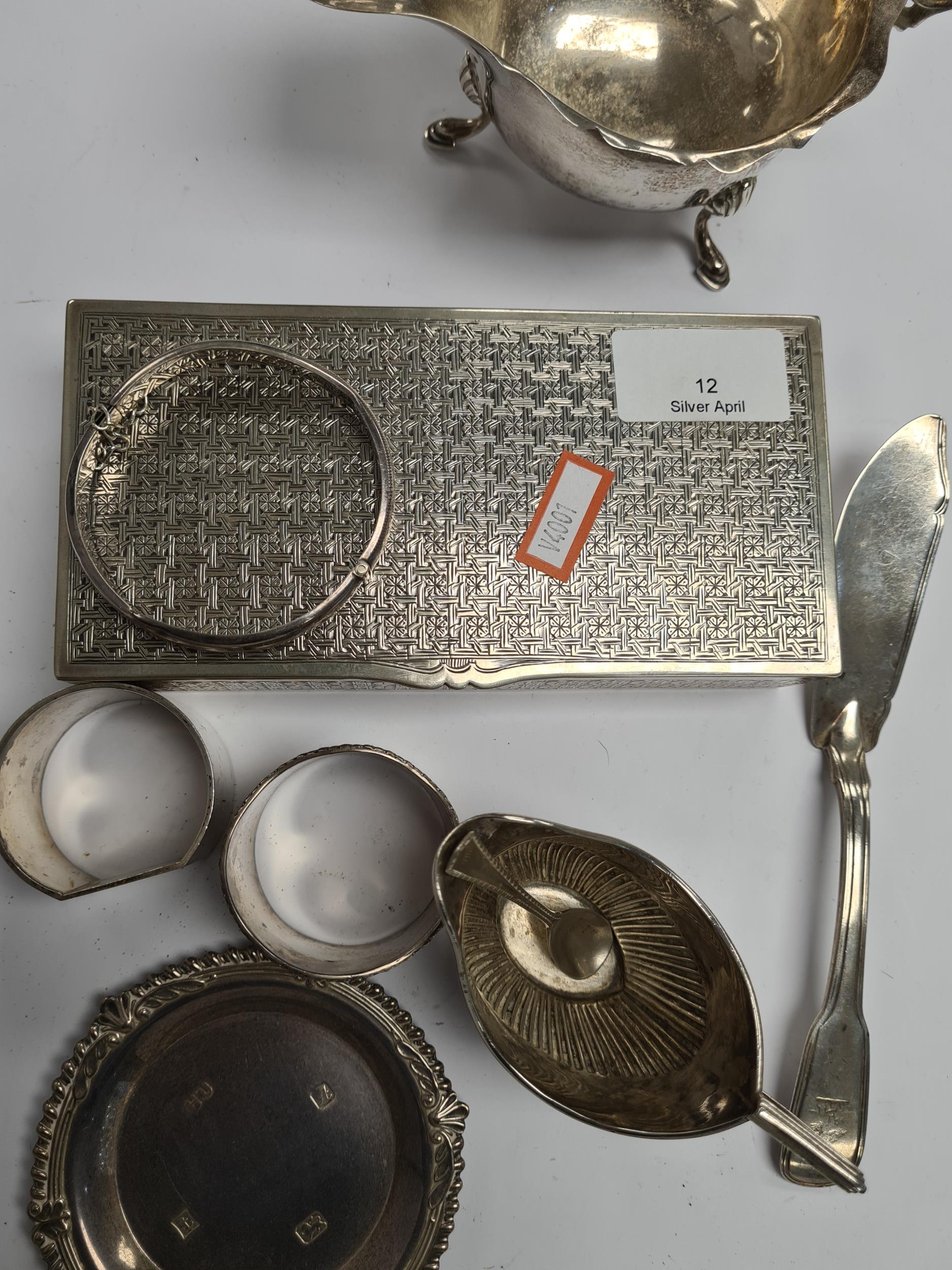 A white metal decorative rectangular box, silver trinket dish, napkin rings, bangle, sauce boat by S Blanckensee and Son Ltd., creamer, and Georgian silver butter knife by William Eley and William Fearn. A nice lot. 9.09ozt approx, box 12.27ozt approx. Condition Report: No major damage seen